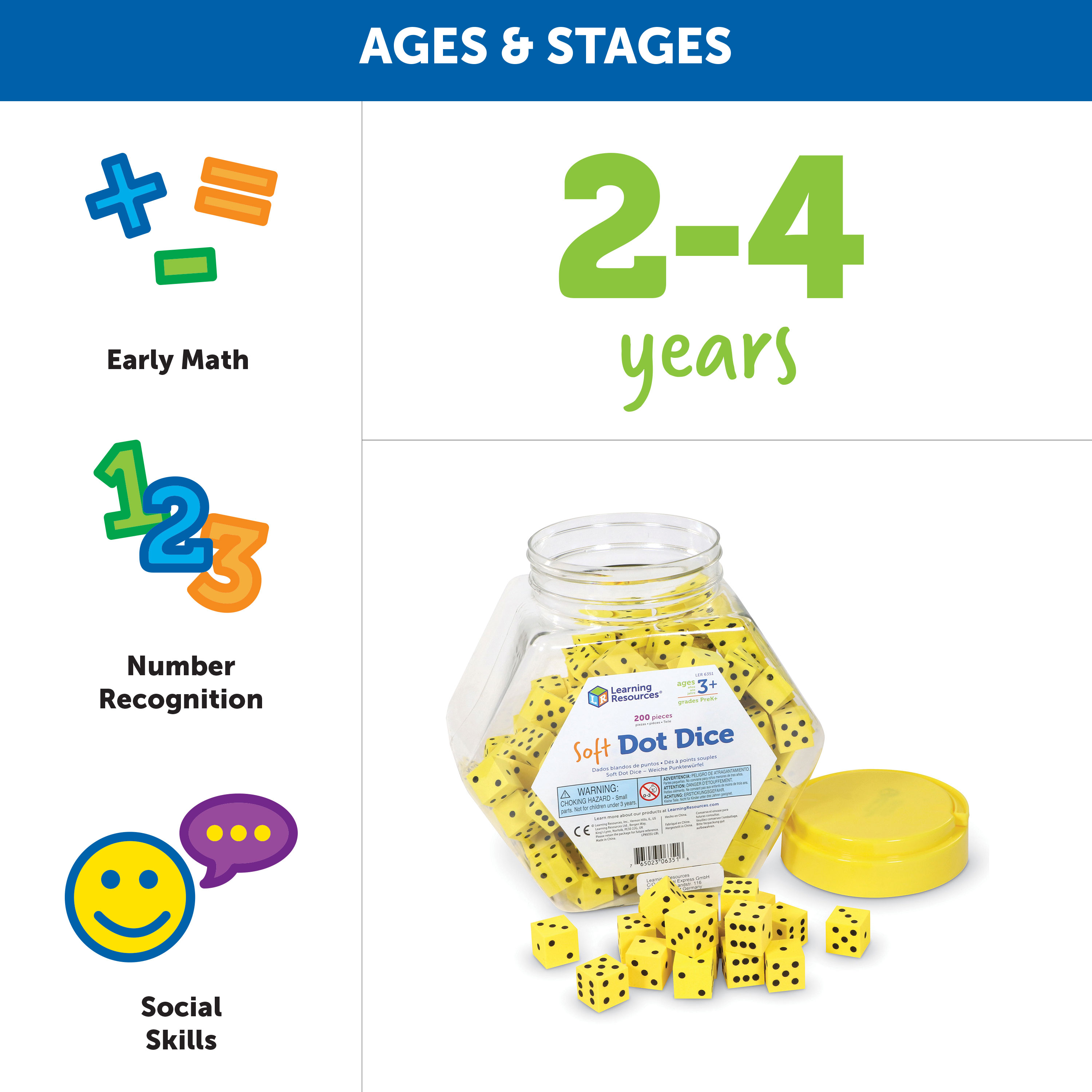 SKU LER6351 Product Title HANDS-ON-SOFT DOT DICE BUCKET Brand Name Learning Resources UPC 765023063516 Piece Count 200 Min Target Age 3 Max Target Age 7 TargetGradeMax Second Grade TargetGradeMin Toddler ProductCategorySubject Math Port of Exit CNYTN Country of Origin CHN Unit Height 6.2 Unit Length 7.2 Unit Weight 0.5 Unit Width 4.7 Long Description - DC Teach probability concepts while playing classroom games. This set of 200 dot dice is made of washable, durable soft yellow foam that’s quiet when rolled. CA prop 65 No Case Height 15 Case Length 14 Case Quantity 12 Case Weight 6.95 CPQ 1.58 Includes Remote No Marble Warning No MSRP 39.99 Small Ball Warning No Small Parts Warning Yes