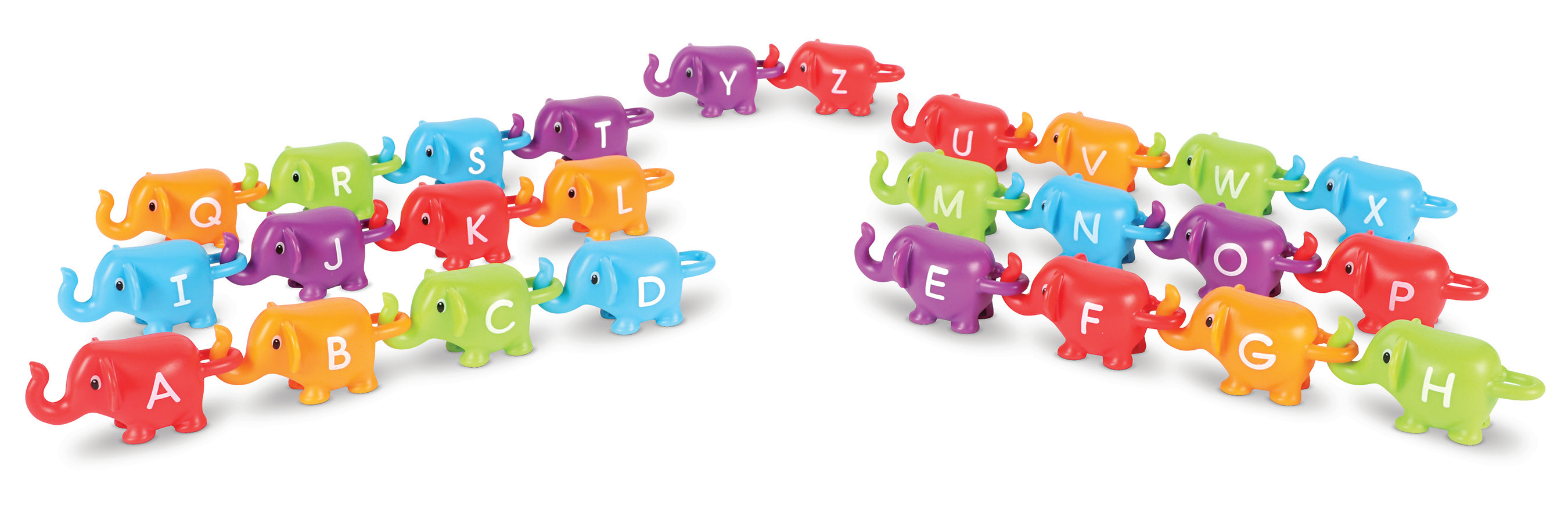 SKU LER6710 Product Title SNAP AND LEARN ABC ELEPHANTS Brand Name Learning Resources UPC 765023067101 Piece Count 26 Min Target Age 2 Max Target Age 4 TargetGradeMax Pre-K TargetGradeMin Toddler ProductCategoryProductLine Snap-n-Learn ProductCategorySubject Sorting & Matching Port of Exit VNHPH Country of Origin VNM Unit Height 7.5 Unit Length 5.5 Unit Weight 0.9 Unit Width 5.5 Long Description - DC Join these elephants on parade, as they're bringing the alphabet with them! Kids learn their ABCs during imaginative animal play sessions with the snap-n-learn ABC elephants from Learning Resources. These educational toys for 2 year olds consist of 26 colorful elephants come with snap-together trunks and tails that make learning language skills easy and fun with every letter of the alphabet. Elephants come in five vibrant colored, orange, green, blue, and purple—and their easy-to-grab plastic construction makes it simple for little hands to develop fine motor skills during each engaging play session. The Snap-N-Learn ABC elephants also grow along with kids’ skills; once they've mastered snapping elephants together in alphabetical order, little ones may snap their elephants together to form simple words and enhance basic vocabulary skills. When play time is over, each set of snap-n-learn ABC elephants fits easily within the included tub, making cleanup and storage simple and fast. CA prop 65 No Case Height 8.9 Case Length 12.2 Case Quantity 4 Case Weight 4.35 CPQ 0.78 Includes Remote No Marble Warning No MSRP 23.99 Small Ball Warning No Small Parts Warning No