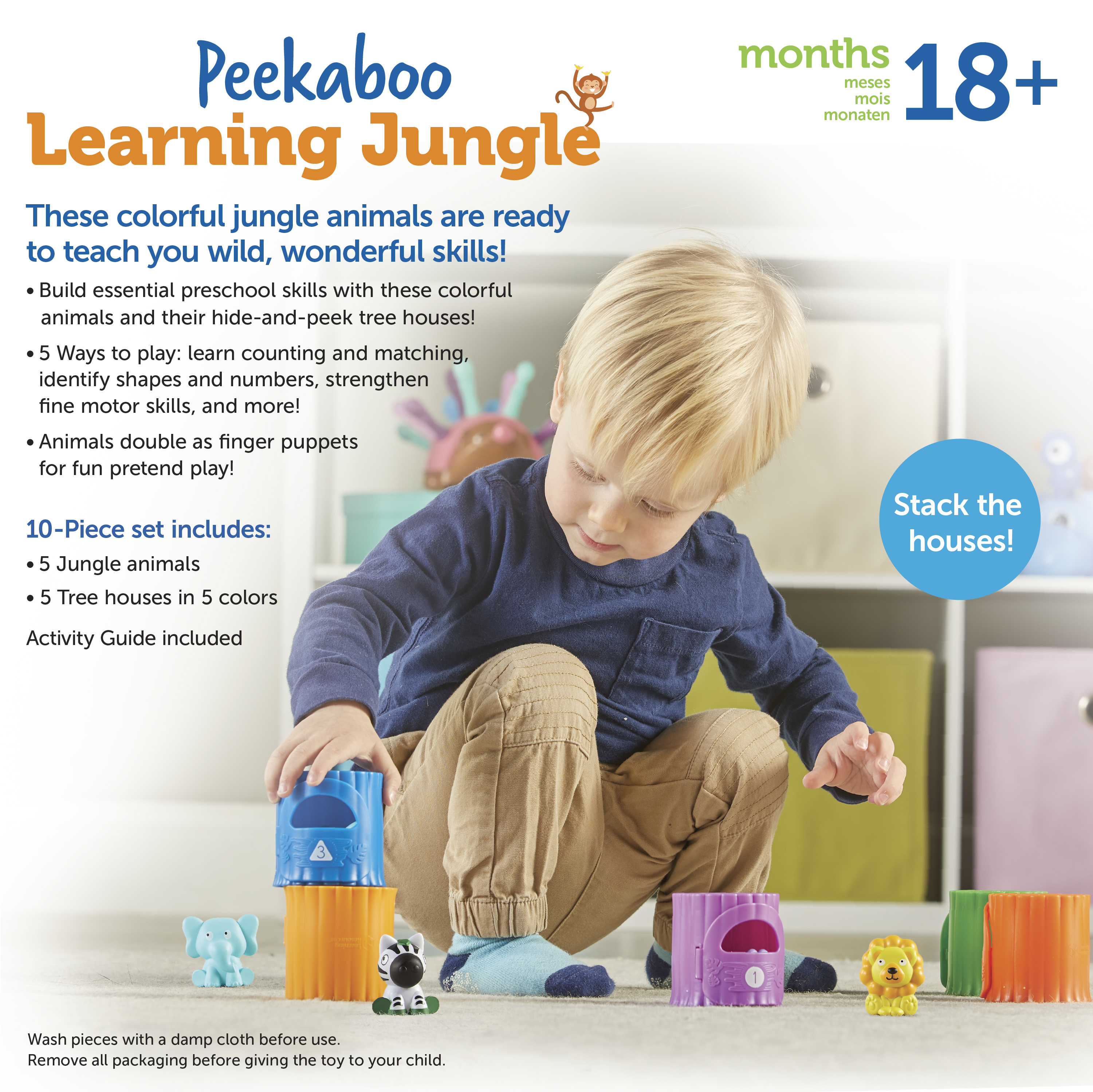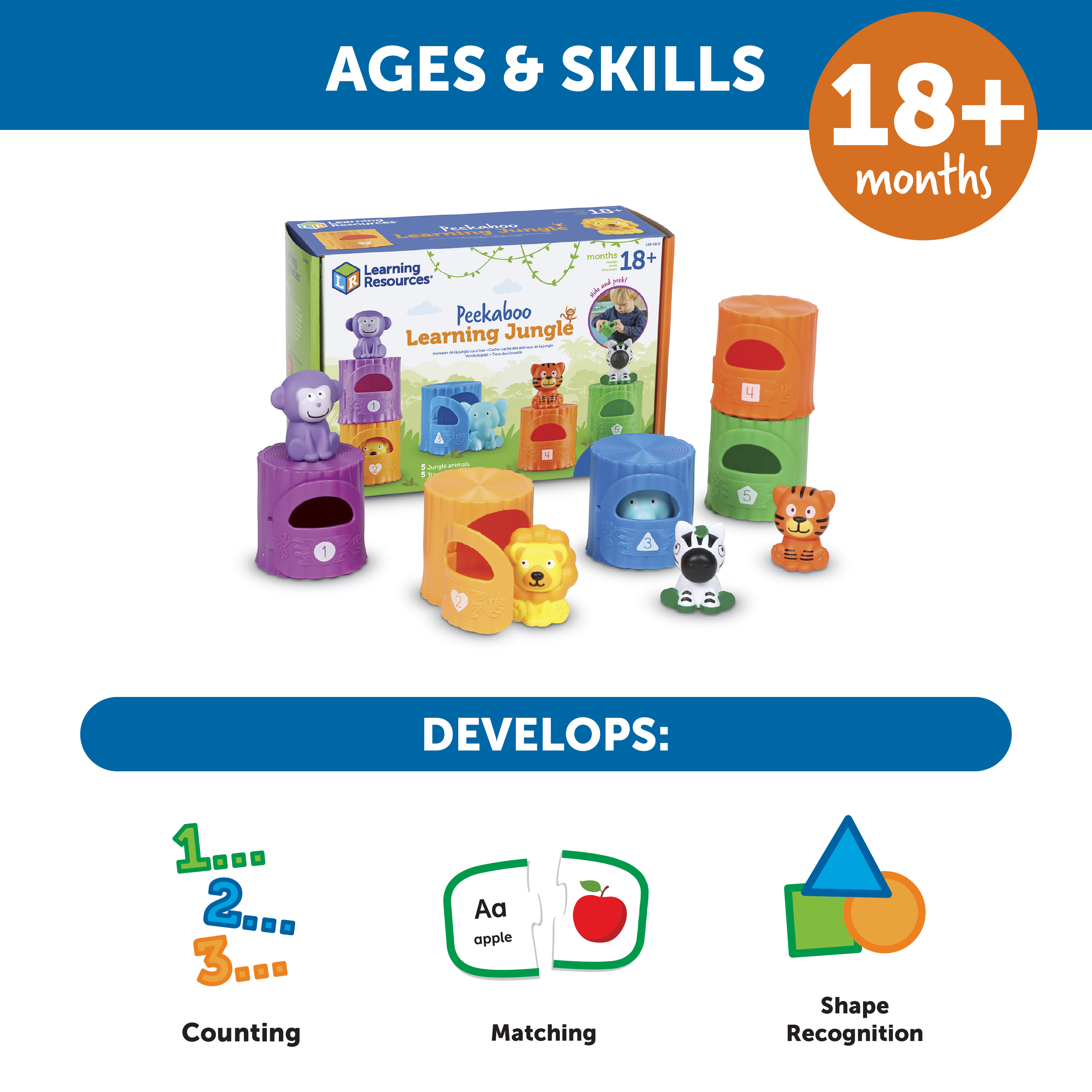 SKU LER6815 Product Title Peekaboo Learning Jungle Brand Name Learning Resources UPC 765023068153 Piece Count 10 Min Target Age 1.5 Max Target Age 3 TargetGradeMax Pre-K TargetGradeMin Toddler ProductCategoryProductLine Peekaboo ProductCategorySubject Sorting & Matching Port of Exit CNYTN Country of Origin CHN Unit Height 3.8 Unit Length 10.1 Unit Weight 1.4 Unit Width 6.9 CA prop 65 No Case Height 8.7 Case Length 10.7 Case Quantity 4 Case Weight 6.3 CPQ 0.77 Includes Remote No Marble Warning No MSRP 21.99 Small Ball Warning No Small Parts Warning No