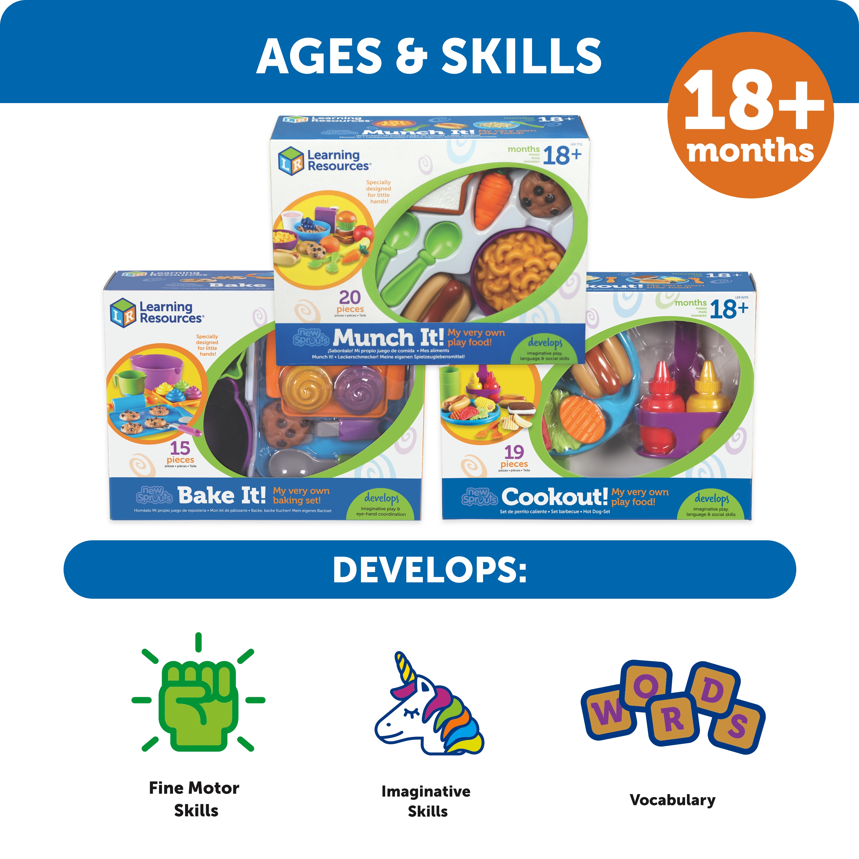 SKU LER7711 Product Title NEW SPROUTS (TM) MUNCH IT! FOOD SET Brand Name Learning Resources UPC 765023077117 Piece Count 20 Min Target Age 1.5 Max Target Age 4 TargetGradeMax Pre-K TargetGradeMin Toddler ProductCategoryProductLine New Sprouts ProductCategorySubject Kitchen & Food Imaginative Play Port of Exit VNHPH Country of Origin VNM Unit Height 9.1 Unit Length 4.12 Unit Weight 1.58 Unit Width 12.1 Long Description - DC Encourage role play, build vocabulary, and model mealtime routines with the most familiar foods to toddlers. Play food is made of soft, durable plastic. 20 high-quality, realistically detailed pieces include: 2 slices of bread, 2 slices of cheese, Juice box, Yogurt cup, Mac and cheese (in a bowl), Cereal (in a bowl), 2 spoons, Orange, Hot dog, Bagel, Banana, Cookie, Carrot, Apple, Berry cluster, and Muffin. CA prop 65 No Case Height 12.6 Case Length 19.2 Case Quantity 6 Case Weight 10.9 CPQ 1.82 Includes Remote No Marble Warning No MSRP 29.99 Small Ball Warning No Small Parts Warning No