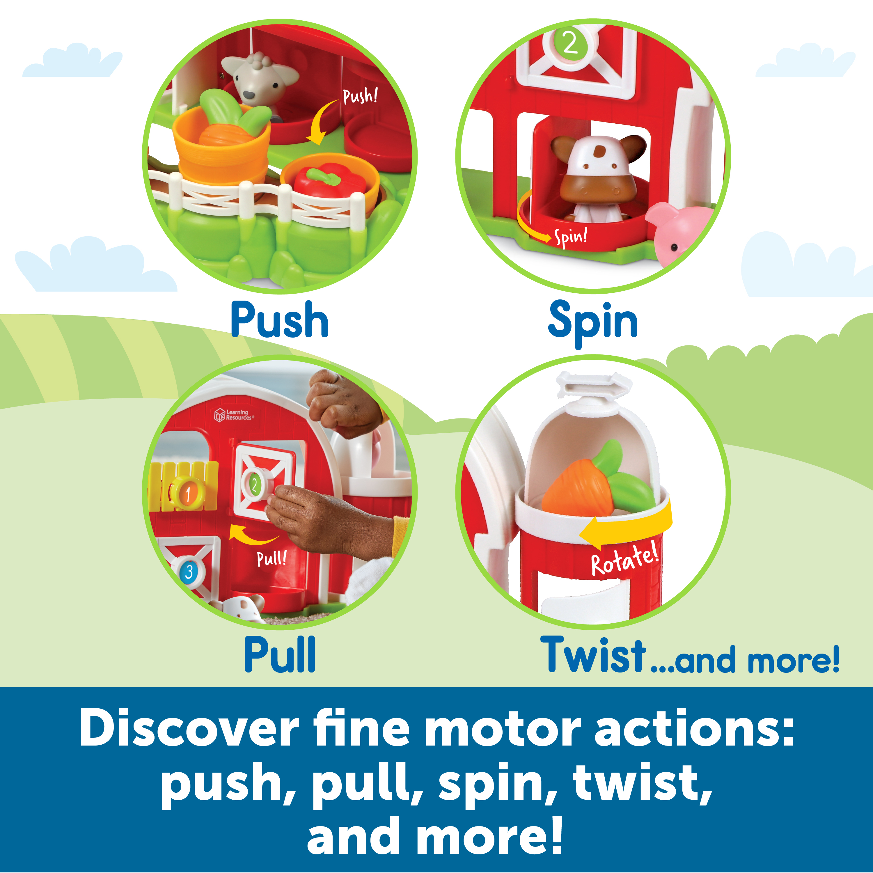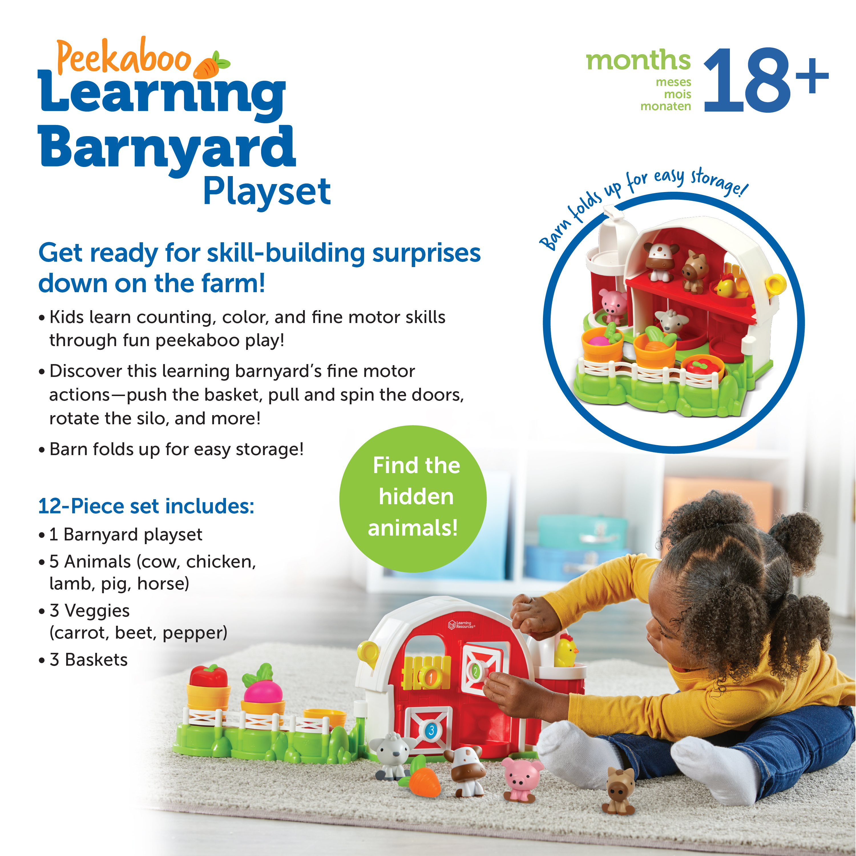 SKU LER7745 Product Title Peekaboo Learning Barnyard Playset Brand Name Learning Resources UPC 765023077452 Piece Count 12 Min Target Age 1.5 Max Target Age 100 TargetGradeMax No Grade TargetGradeMin Toddler ProductCategoryProductLine Peeksville ProductCategorySubject Role Play Imaginative Play Port of Exit CNYTN Country of Origin CHN Unit Height 7.6 Unit Length 9.6 Unit Weight 2.95 Unit Width 14.5 Long Description - DC Are you ready for a skill-building barnyard adventure? Kids learn counting, color, and fine motor skills every time they explore this barn and its fun animal friends. Includes 8 fun actions—push the pig, pull and spin the doors, rotate the silo, and more! Barn folds up for easy storage and measures 22.32"L x 4.47"W x 8.18"H when open. CA prop 65 No Case Height 16.1 Case Length 15.3 Case Quantity 4 Case Weight 13.25 CPQ 2.78 Includes Remote No Marble Warning No MSRP 39.99 Small Ball Warning No Small Parts Warning No