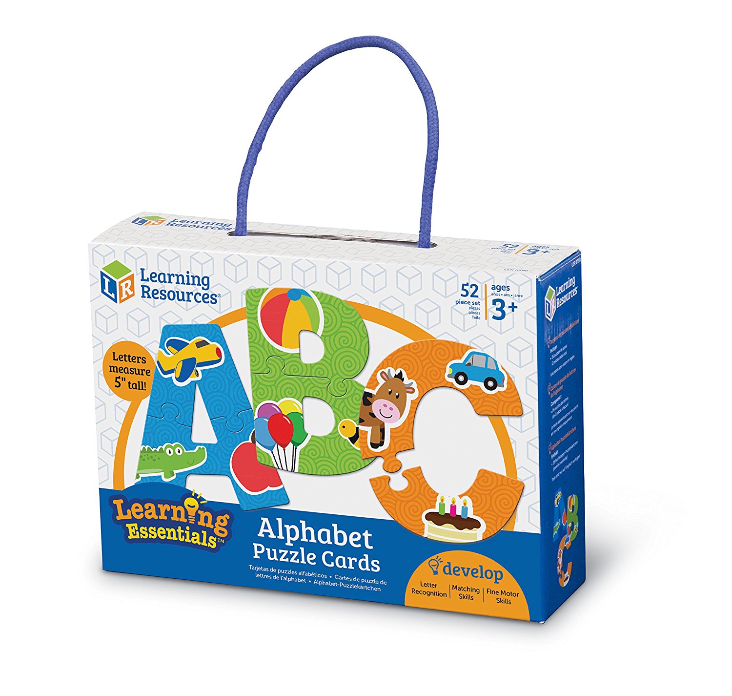 SKU LER8590 Product Title ALPHABET PUZZLE CARDS Brand Name Learning Resources UPC 765023085907 Piece Count 52 Min Target Age 3 Max Target Age 7 TargetGradeMax Second Grade TargetGradeMin Toddler ProductCategorySubject Language & Letters Port of Exit CNYTN Country of Origin CHN Unit Height 2.5 Unit Length 6.8 Unit Weight 0.95 Unit Width 9.6 Long Description - DC Kids will build alphabet awareness and letter recognition with this colorful set of uppercase letter puzzle pieces. Each letter features bold graphics that match its beginning sound. Includes 26 durable, two-piece puzzles. CA prop 65 No Case Height 8.4 Case Length 10.7 Case Quantity 4 Case Weight 4.7 CPQ 0.54 Includes Remote No Marble Warning No MSRP 13.99 Small Ball Warning No Small Parts Warning No