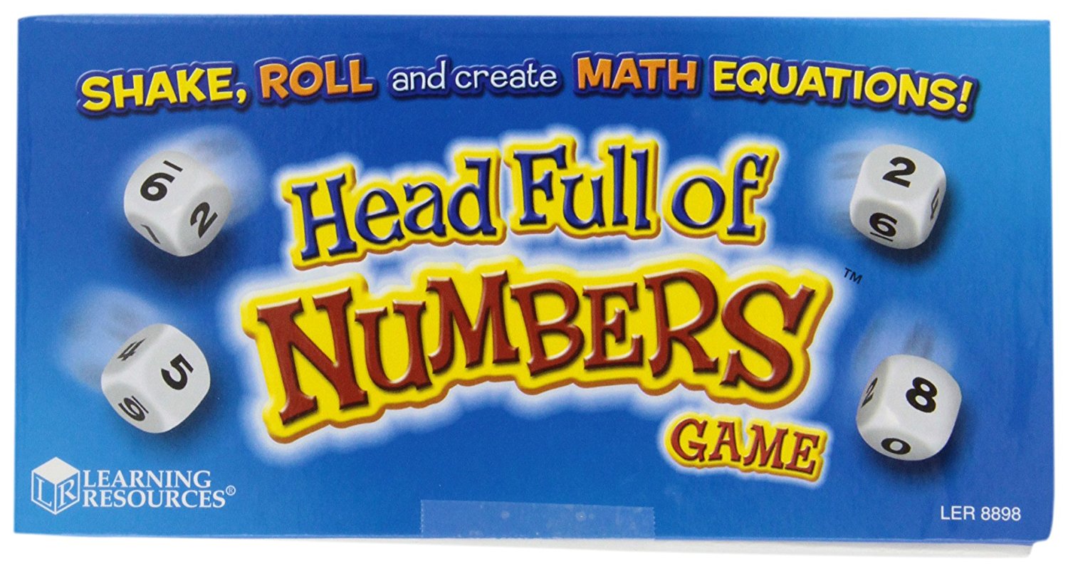 SKU LER8898 Product Title HEAD FULL OF NUMBERS- MATH GAME Brand Name Learning Resources UPC 765023088984 Piece Count 13 Min Target Age 7 Max Target Age 11 TargetGradeMax Sixth Grade TargetGradeMin Second Grade ProductCategoryProductLine Math Games ProductCategorySubject Games Port of Exit CNYTN Country of Origin CHN Unit Height 4.1 Unit Length 8 Unit Weight 1.3 Unit Width 8 Long Description - DC Practice addition, subtraction, multiplication, and division with fun game play. Place dice into the shaker, then roll them out and align on the dice tray. Then set the timer and create as many unique, correct equations as possible. Game variations allow you to target specific math skills. 2-6 players. CA prop 65 No Case Height 8.8 Case Length 25.2 Case Quantity 12 Case Weight 18.1 CPQ 2.13 Includes Remote No Marble Warning No MSRP 20.99 Small Ball Warning No Small Parts Warning Yes