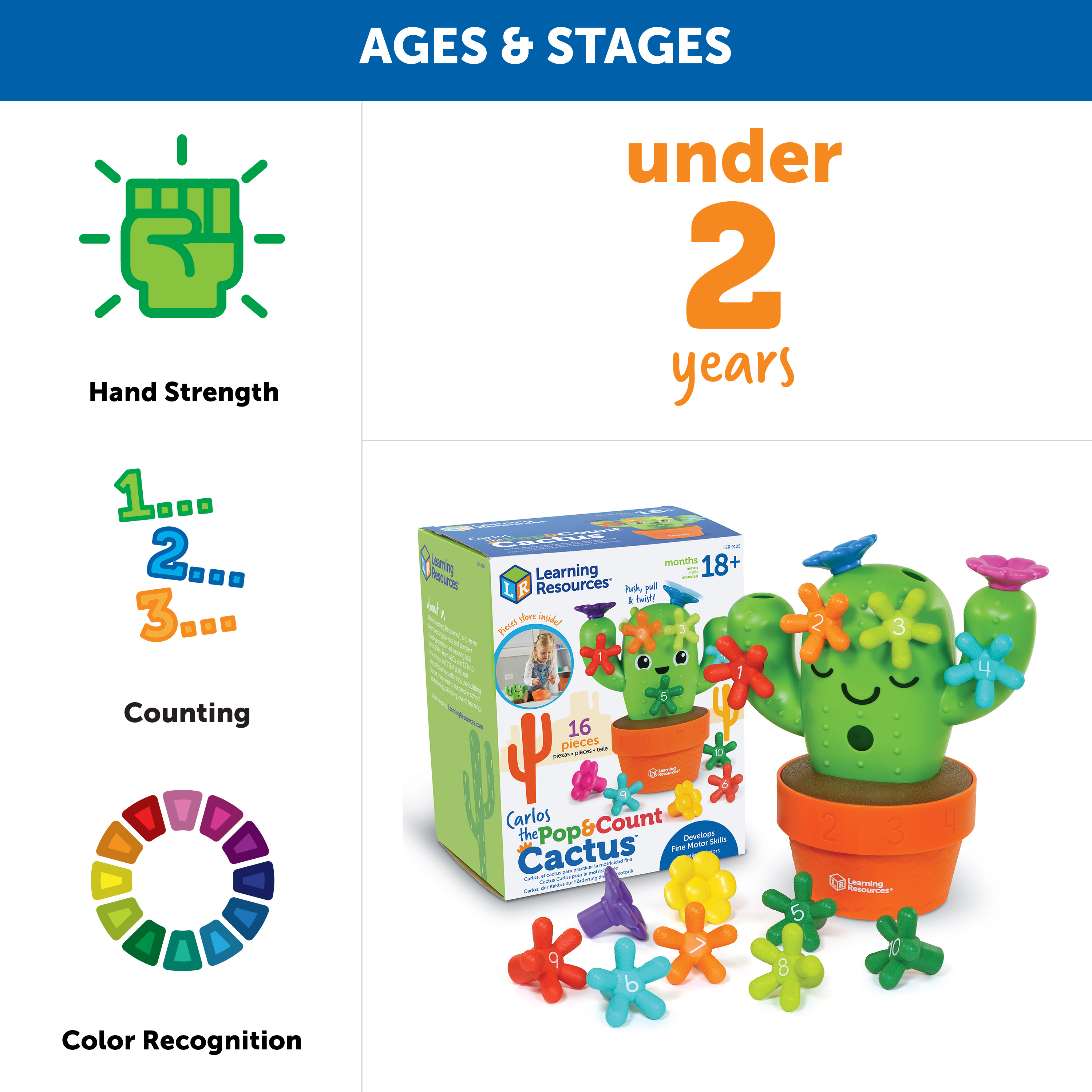 SKU LER9125 Product Title Carlos the Pop & Count Cactus™ Brand Name Learning Resources UPC 765023091250 Piece Count 16 Min Target Age 1.5 Max Target Age 5 TargetGradeMax Kindergarten TargetGradeMin Toddler ProductCategoryProductLine Fine Motor Friends ProductCategorySubject Motor Skills Port of Exit VNHPH Country of Origin VNM Unit Height 8.37 Unit Length 5 Unit Weight 1.1 Unit Width 6.6 CA prop 65 No Case Height 9.2 Case Length 20.3 Case Quantity 4 Case Weight 5.2 CPQ 0.8 Includes Remote No Marble Warning No MSRP 16.99 Small Ball Warning No Small Parts Warning No