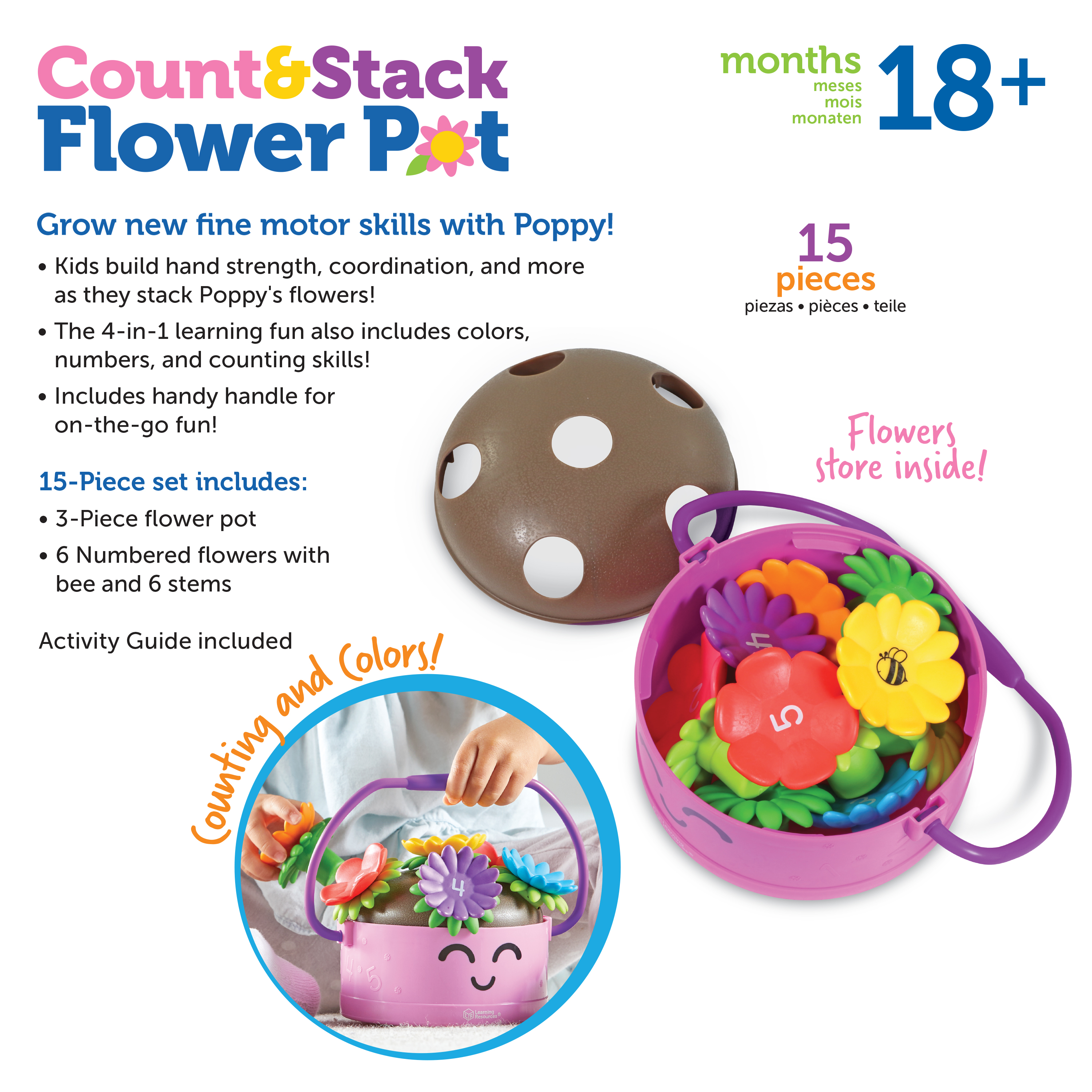 SKU LER9134 Product Title Poppy the Count & Stack Flower Pot™ Brand Name Learning Resources UPC 765023091342 Piece Count 15 Min Target Age 1.5 Max Target Age 7 TargetGradeMax Second Grade TargetGradeMin Toddler ProductCategoryProductLine Fine Motor Friends ProductCategorySubject Motor Skills Port of Exit VNHPH Country of Origin VNM Unit Height 5.06 Unit Length 5.5 Unit Weight 0.9 Unit Width 8 CA prop 65 No Case Height 11.3 Case Length 12.1 Case Quantity 8 Case Weight 5.9 CPQ 1.32 Includes Remote No Marble Warning No MSRP 15.99 Small Ball Warning No Small Parts Warning No