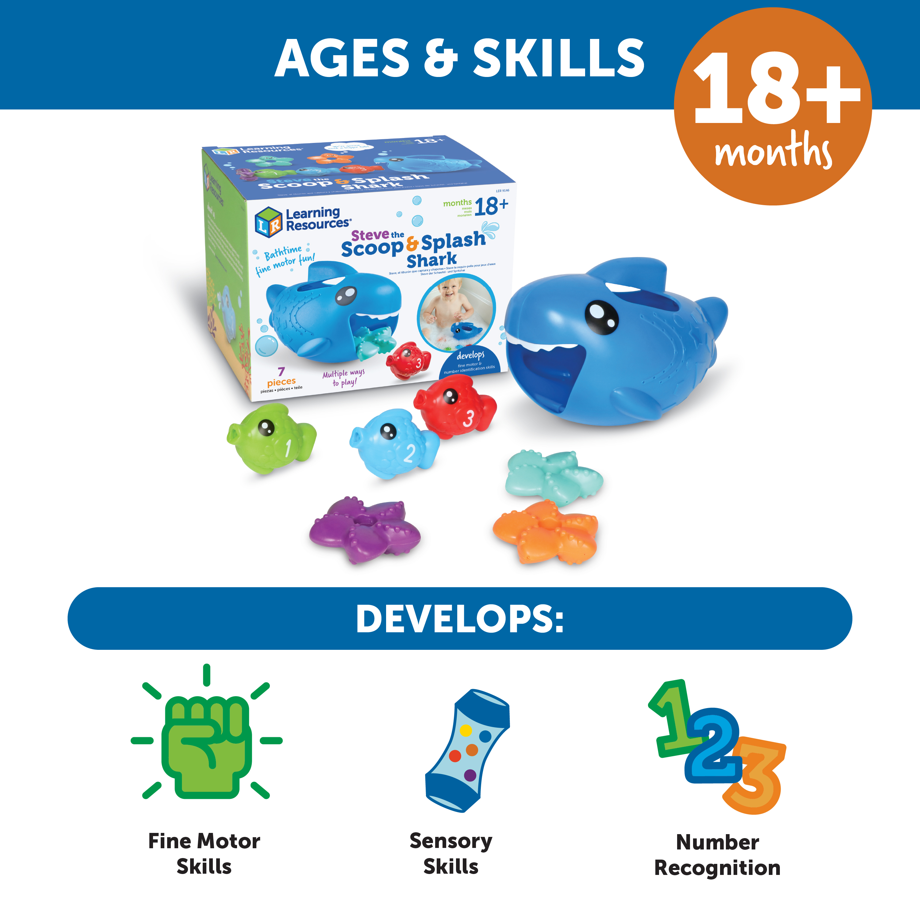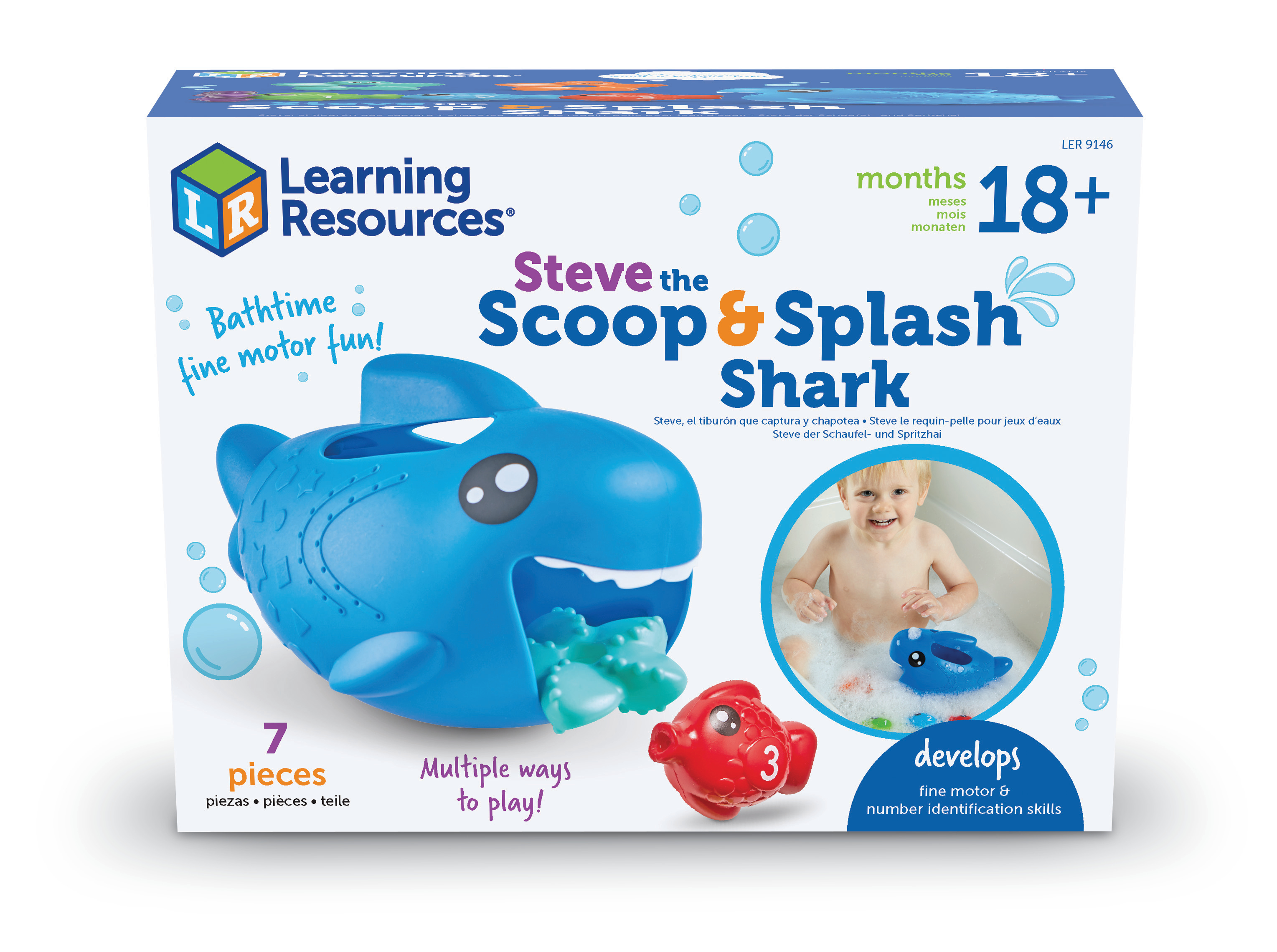 SKU LER9146 Product Title Steve the Scoop & Splash Shark™ Brand Name Learning Resources UPC 765023091465 Piece Count 7 Min Target Age 1.5 Max Target Age 5 TargetGradeMax Kindergarten TargetGradeMin Toddler ProductCategoryProductLine Fine Motor Friends ProductCategorySubject Motor Skills Port of Exit VNHPH Country of Origin VNM Unit Height 6.1 Unit Length 8.1 Unit Weight 0.75 Unit Width 6.1 CA prop 65 No Case Height 7 Case Length 12.8 Case Quantity 4 Case Weight 4.05 CPQ 0.87 Includes Remote No Marble Warning No MSRP 15.99 Small Ball Warning No Small Parts Warning No