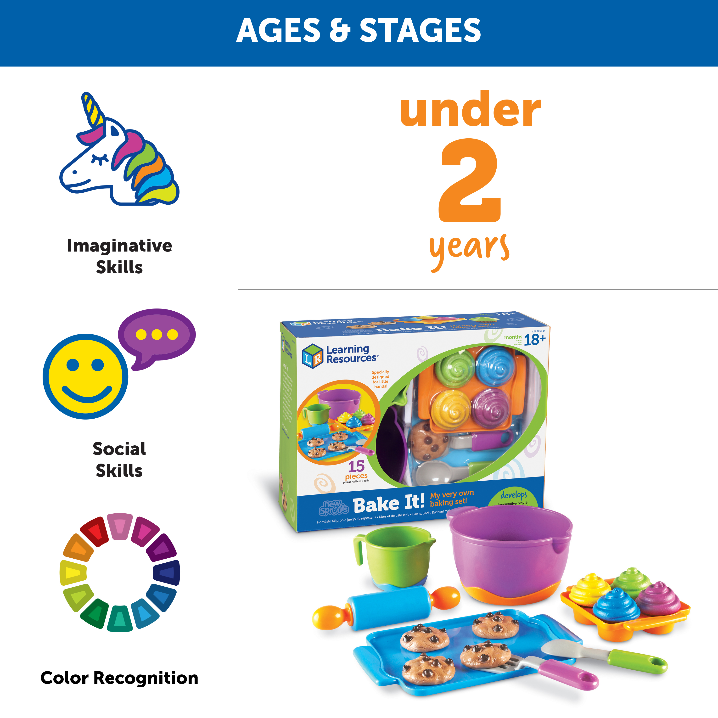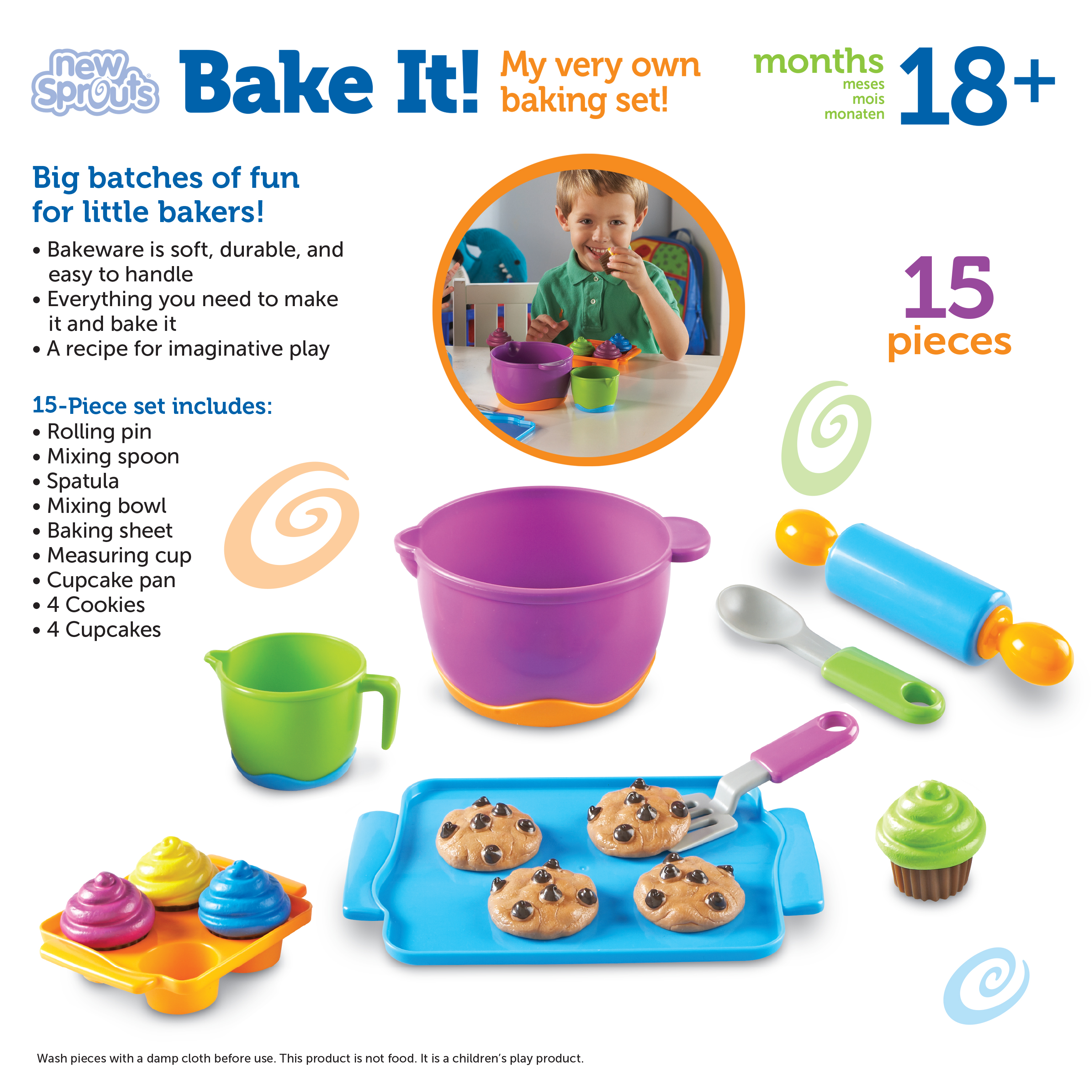 SKU LER9258-D Product Title NEW SPROUTS (TM) BAKE IT! Brand Name Learning Resources UPC 765023092585 Piece Count 29 Min Target Age 1.5 Max Target Age 4 TargetGradeMax Pre-K TargetGradeMin Toddler ProductCategoryProductLine New Sprouts ProductCategorySubject Kitchen & Food Imaginative Play Port of Exit CNFZH Country of Origin CHN Unit Height 4.6 Unit Length 9.1 Unit Weight 1.8 Unit Width 12.1 Long Description - DC Encourage imaginative play with this complete bake set. Features 4 cookies, 4 cupcakes, and includes a colorful rolling pin, mixing spoon, and spatula. The measuring cup, mixing bowl, and tray all feature easy-to-grip handles or little bakers. Ideal for ages 18 mos+. CA prop 65 No Case Height 12.9 Case Length 19.2 Case Quantity 6 Case Weight 12.97 CPQ 2.05 Includes Remote No Marble Warning No MSRP 29.99 Small Ball Warning No Small Parts Warning No