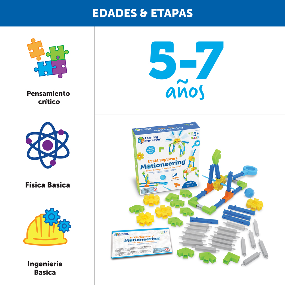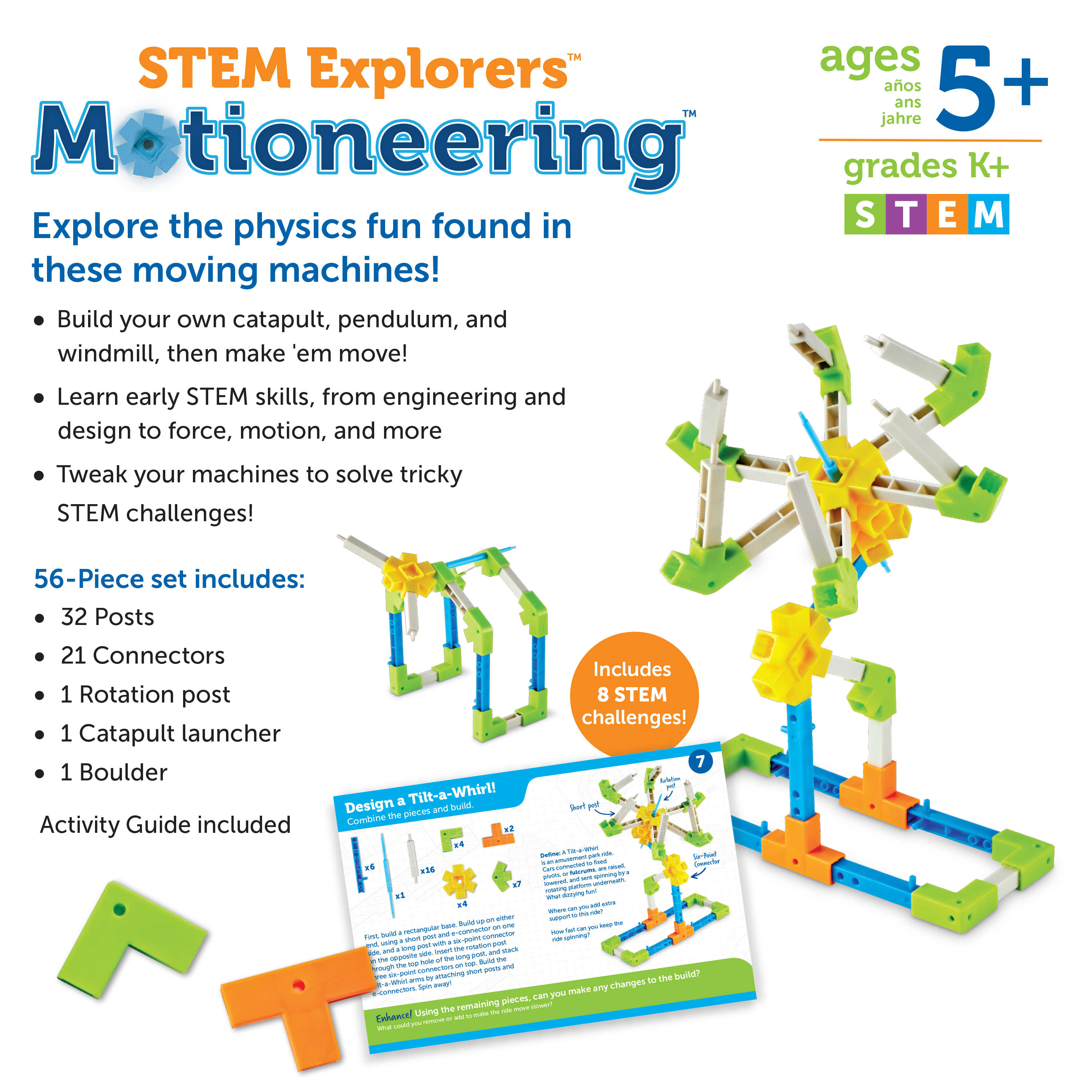 SKU LER9308 Product Title STEM EXPLORERS™ MOTIONEERING™ Brand Name Learning Resources UPC 765023093087 Piece Count 56 Min Target Age 5 Max Target Age 9 TargetGradeMax Fourth Grade TargetGradeMin Kindergarten ProductCategoryProductLine STEM Explorers ProductCategorySubject Science/STEM Port of Exit INMAA Country of Origin IND Unit Height 2.25 Unit Length 8.25 Unit Weight 0.75 Unit Width 8 Long Description - DC Explore the physics fun found in these moving machines! Kids can build their own catapult, trebuchet, and windmill, then make ’em move when they explore STEM Explorers Motioneering from Learning Resources. This STEM building set comes with all of the pieces kids need to build, test, and tweak their moving STEM creations. As they build, they'll learn about kindergarten STEM skills from engineering and design to force, motion, and more. Kids will also use their newfound critical thinking skills to tweak their machines and solve the set's tricky STEM challenges! After they master the set's progressive STEM challenges, kids can even build their own! STEM Explorers Motioneering includes 56 building pieces and an activity guide with 8 STEM challenges. This fun learning tool is ready for homeschool or kindergarten classroom use! CA prop 65 No Case Height 9.25 Case Length 17.25 Case Quantity 8 Case Weight 7.1 CPQ 0.78 Includes Remote No Marble Warning No MSRP 20.99 Small Ball Warning Yes Small Parts Warning Yes