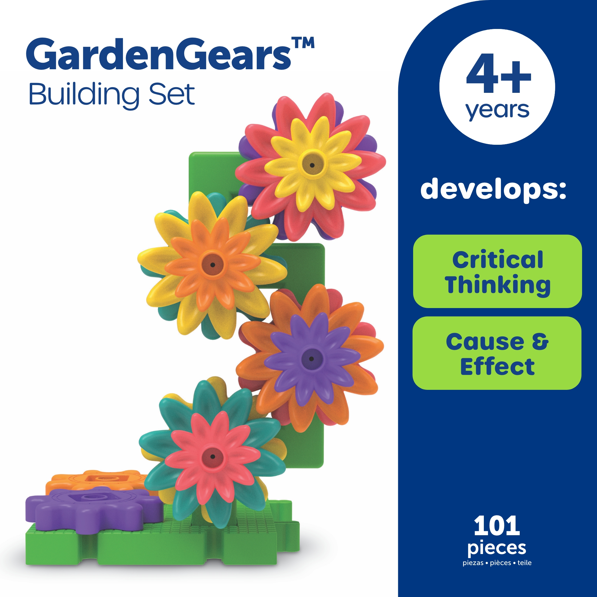 SKU LER9325 Product Title GardenGears Building Set Brand Name Learning Resources UPC 765023093254 Piece Count 101 Min Target Age 4 Max Target Age 100 TargetGradeMax No Grade TargetGradeMin Pre-K ProductCategoryProductLine Gears! Gears! Gears! ProductCategorySubject Engineering & Construction Port of Exit KRBUS Country of Origin VNM Unit Height 10.1 Unit Length 4.3 Unit Weight 2.35 Unit Width 12.1 Short Description - DC With GardenGears, kids build a twisting, turning garden filled with gears and flowers! 101-piece set includes 35 gears, 14 flowers in 2 sizes, and more. Kids can follow along with included designs or create their own gardens! As they build, kids explore cause and effect, sequencing, and imaginative play while strengthening fine motor and thinking skills. Compatible with all Gears! sets, it’s a blooming addition to classrooms and playrooms. Long Description - DC With GardenGears, kids build a twisting, turning garden filled with gears and flowers! 101-piece set includes 35 gears, 14 flowers in 2 sizes, and more. Kids can follow along with included designs or create their own gardens! As they build, kids explore cause and effect, sequencing, and imaginative play while strengthening fine motor and thinking skills. Compatible with all Gears! sets, it’s a blooming addition to classrooms and playrooms. CA prop 65 No Case Height 10.9 Case Length 12.7 Case Quantity 4 Case Weight 10.55 CPQ 1.4 Includes Remote No Marble Warning No MSRP 42.99 Small Ball Warning No Small Parts Warning Yes