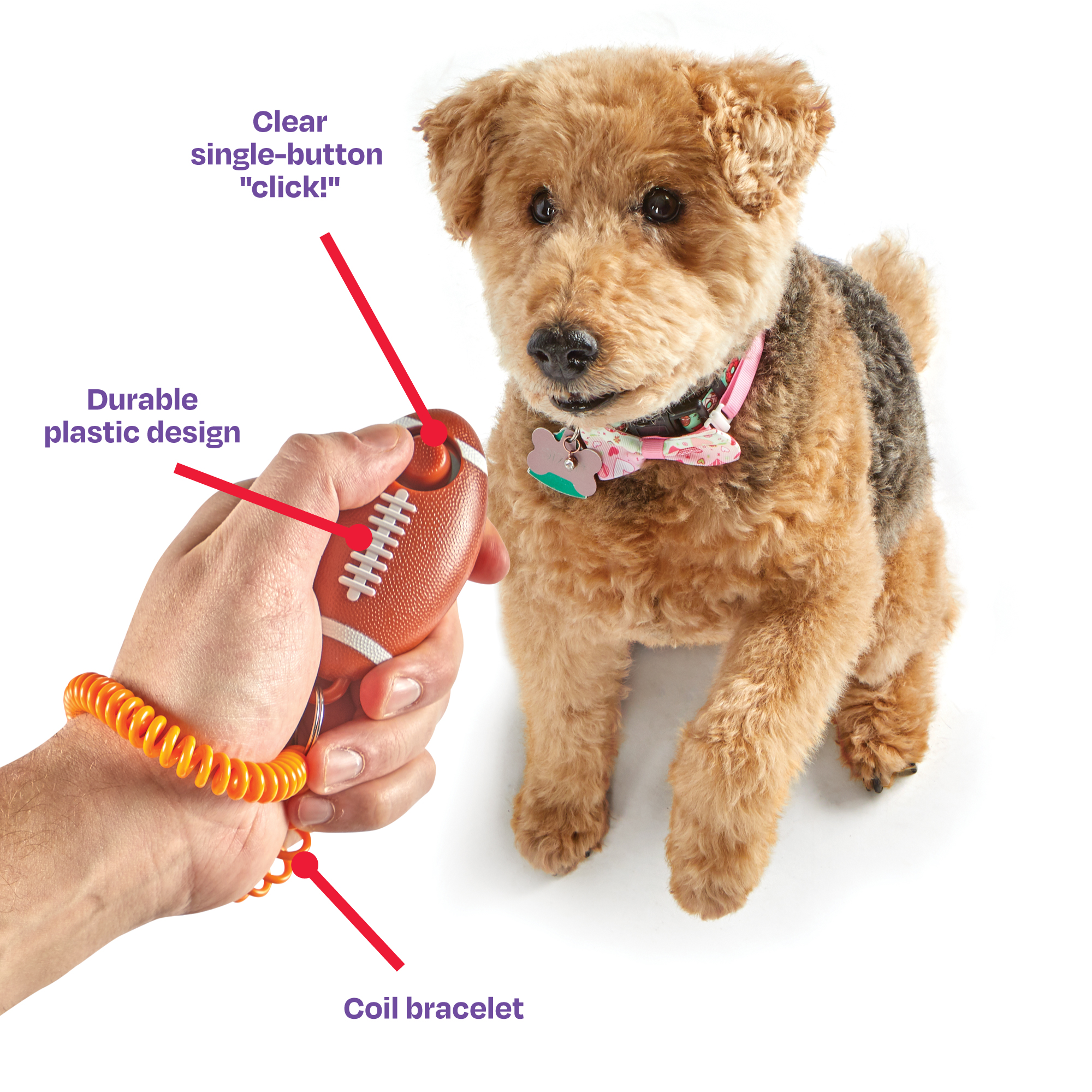 SKU LER9420 Product Title Football Training Clicker Brand Name Pets (Brightkins and Hunger for Words) UPC 765023094206 Piece Count 1 Min Target Age 0 Max Target Age 99 TargetGradeMax Adult ProductCategoryProductLine Clickers ProductCategorySubject Brightkins Port of Exit VNHPH Country of Origin VNM Unit Height 6 Unit Length 1.5 Unit Weight 0.1 Unit Width 4.5 Long Description - DC These dog training clickers are as fun as they are functional! Add some style to your training routine with one of three Smarty Pooch™ Training Clickers from Brightkins. Designed for use in all kinds of positive reinforcement training routines and dog games, these dog clickers for training help you mark and reward your dog's good behaviors. Simply click the button to mark a desired behavior, follow up with a treat reward, and repeat, learn, and grow! In addition to featuring the clear, crisp "click!" of traditional dog clickers, these Smarty Pooch™ Training Clickers elevate your training game with three eye-catching designs--choose from a bright green Bone, a friendly blue Doggy, or a scrumptious Hot Dog! Made from durable plastic, each of our dog training clickers also comes with a sturdy coil bracelet that helps you take your training on walks, trips to the dog park, or anywhere in between! Use these tool as essential clickers for pet training, or teach your old dog new tricks! With their fun, functional designs, these dog training and behavior aids also make great dog birthday toys, as well as thoughtful gifts for dog parents! At Brightkins, our paws-on interactive dog toys and training tools unlock your pets' curiosity and engage the entire family! After nearly 40 years of designing award-winning toys that make learning fun for kids, Learning Resources is excited to bring learning to life for your furry family members. Playing with Brightkins products helps pets reduce boredom, ease anxiety and destructive behaviors, and build bright bonds with the people around them! Whether you're teaching new behaviors, boosting mental stimulation, or promoting active family play, we'll help you keep your pets bright and happy for years to come. CA prop 65 No Case Height 5.8 Case Length 9.2 Case Quantity 12 Case Weight 2.1 CPQ 0.29 Includes Remote No Marble Warning No MSRP 6.99 Small Ball Warning No Small Parts Warning Yes