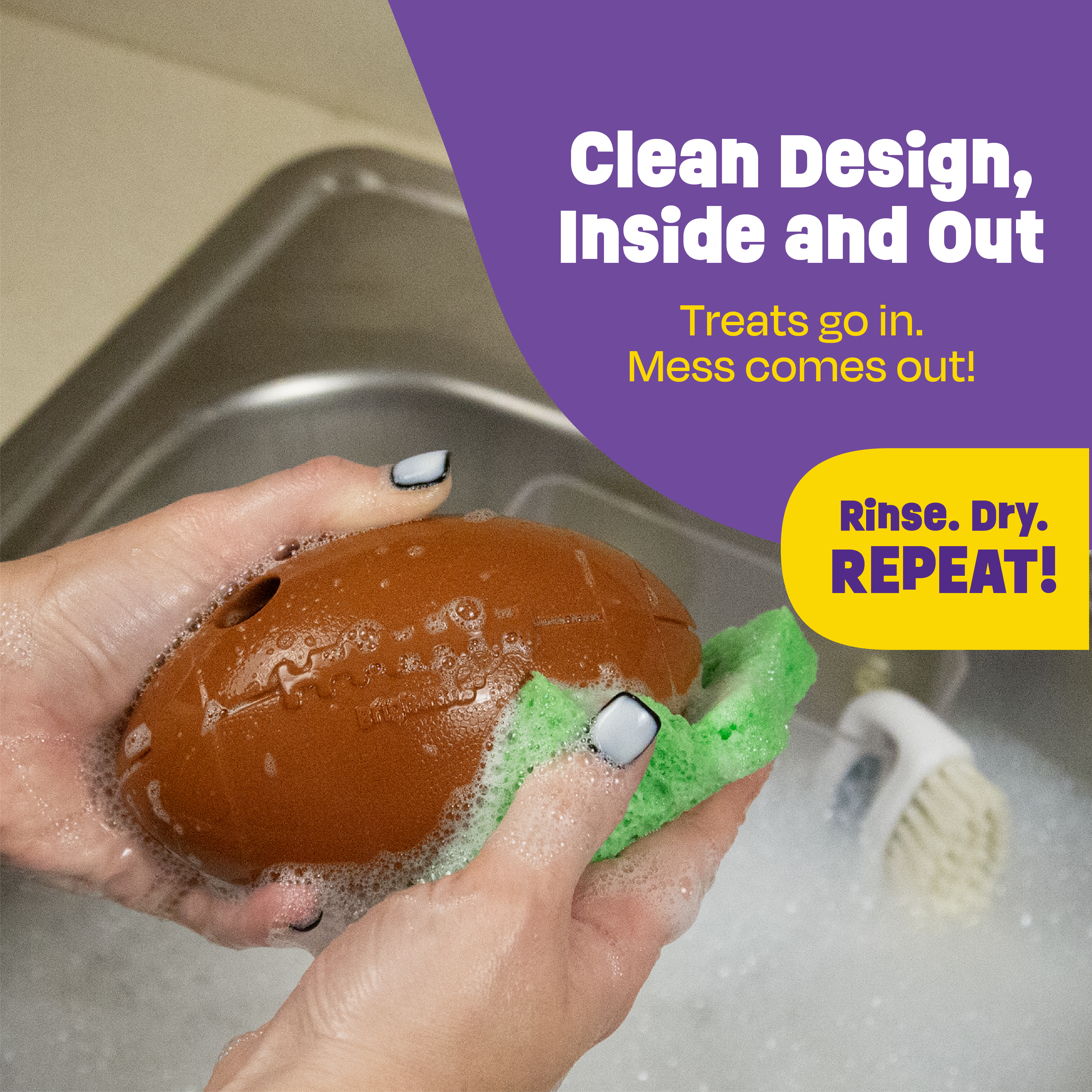 SKU LER9447 Product Title Football Treat Dispenser Brand Name Pets (Brightkins and Hunger for Words) UPC 765023094473 Piece Count 1 Min Target Age 0 Max Target Age 0 ProductCategoryProductLine Treat Dispensers ProductCategorySubject Brightkins Port of Exit CNSZX Country of Origin CHN Unit Height 3 Unit Length 6 Unit Weight 0.6 Unit Width 8.2 Short Description - DC Score a snacktime touchdown with this wiggling, wobbling treat dispenser. This one-piece dispenser is easy to fill, and holds the kibble and treats that dogs love to munch. Plus, it’s made of durable, non-toxic rubber that's great for dogs who are tough on their toys. This dispenser doubles as a slow feeder to help fast eaters slow down to promote gut health. Best of all, it’s also safe for the freezer or dishwasher! It even makes a great dog birthday treat pouch gift! CA prop 65 No Case Height 8.3 Case Length 14.7 Case Quantity 12 Case Weight 8.7 CPQ 1.07 Includes Remote No Marble Warning No MSRP 12.99 Small Ball Warning No Small Parts Warning No