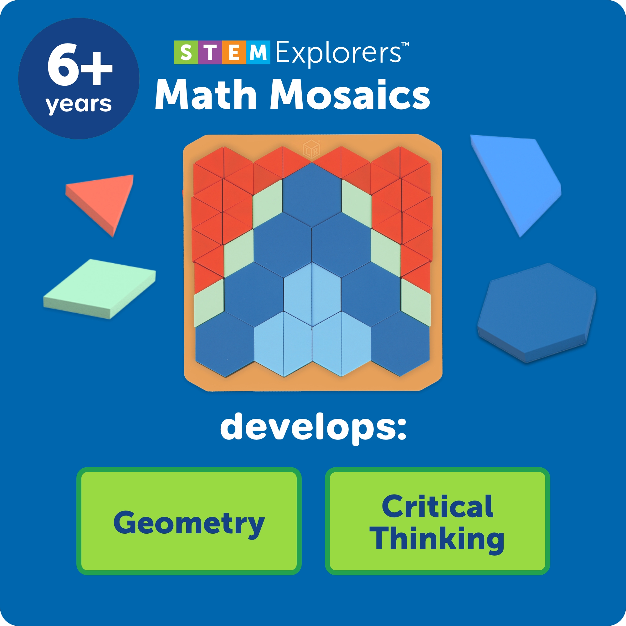 SKU LER9470 Product Title STEM Explorers Math Mosaics Brand Name Learning Resources UPC 765023094701 Piece Count 0 Min Target Age 5 Max Target Age 100 TargetGradeMax No Grade TargetGradeMin Kindergarten ProductCategoryProductLine STEM Explorers ProductCategorySubject Science/STEM Port of Exit INNXV Country of Origin IND Unit Height 1.98 Unit Length 10 Unit Weight 1 Unit Width 10 Short Description - DC Create eye-popping mosaics based on STEM and math principles! Kids learn patterning, symmetry, coding by number, and more as they recreate the puzzles in the guide or design all-new mosaic patterns. Reusable tiles make it easy to create again and again—perfect for fans of mosaic kits and STEM toys alike! Long Description - DC Create eye-popping mosaics based on STEM and math principles! Kids learn patterning, symmetry, coding by number, and more as they recreate the puzzles in the guide or design all-new mosaic patterns. Reusable tiles make it easy to create again and again—perfect for fans of mosaic kits and STEM toys alike! CA prop 65 No Includes Remote No Marble Warning No MSRP 21.99 Small Ball Warning No Small Parts Warning Yes