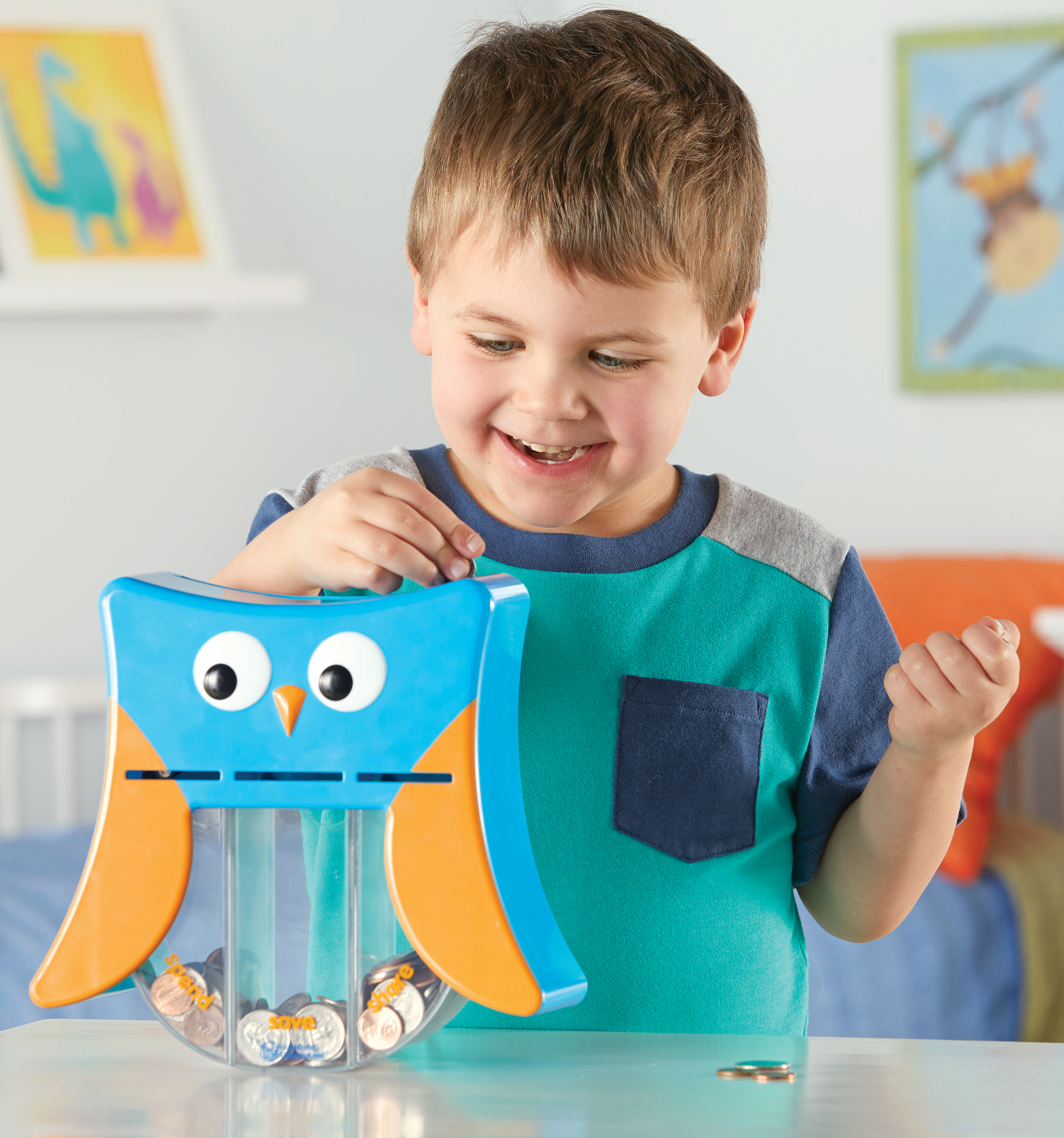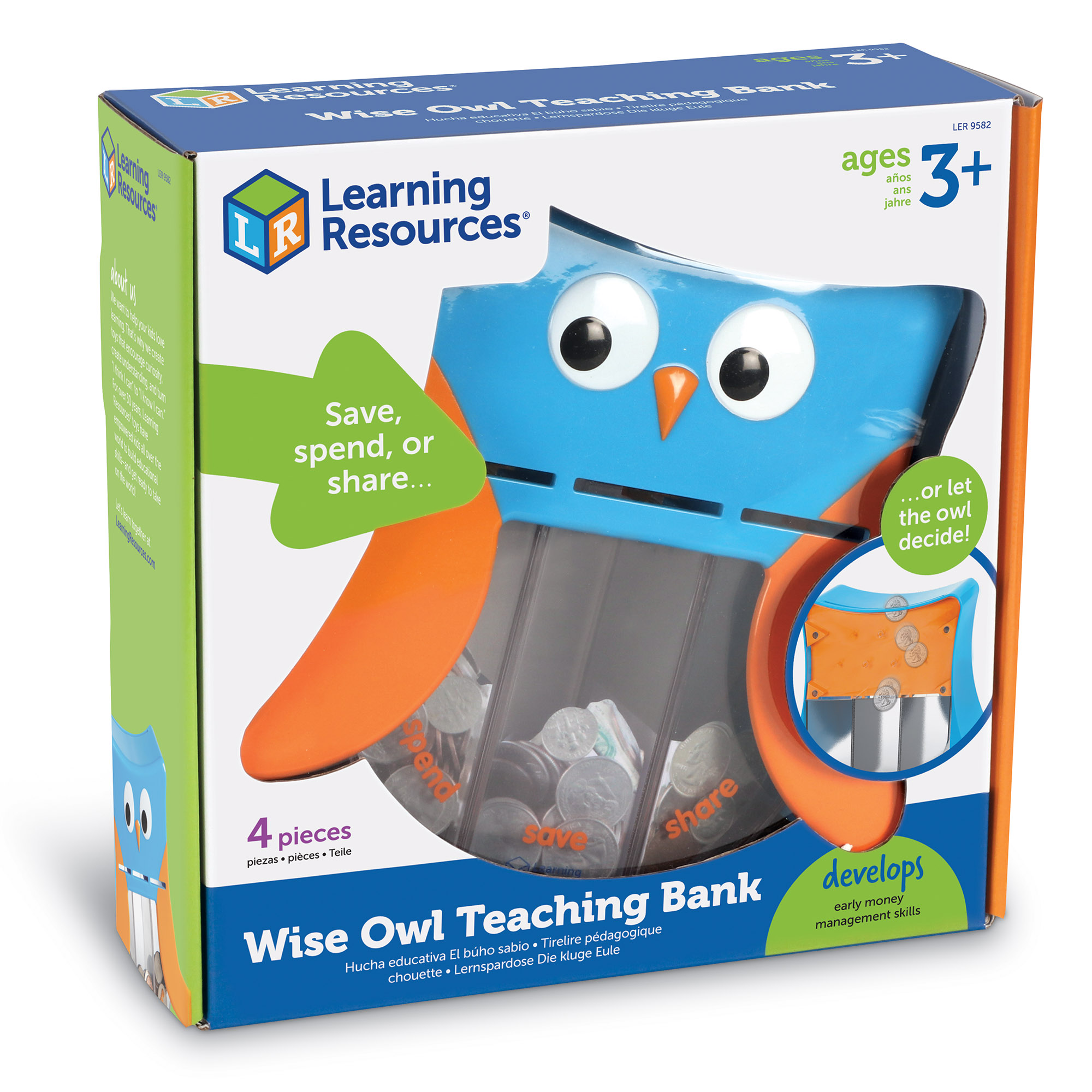 SKU LER9582 Product Title SPEND SHARE SAVE OWL BANK Brand Name Learning Resources UPC 765023095821 Piece Count 4 Min Target Age 3 Max Target Age 7 TargetGradeMax Second Grade TargetGradeMin Toddler ProductCategorySubject Math Port of Exit CNYTN Country of Origin CHN Unit Height 3.5 Unit Length 10.1 Unit Weight 1.6 Unit Width 10.2 Long Description - DC Spend, save, and share with this intelligent owl that is not like regular toddler toys! Early money management skills take on a fun interactive element thanks to the Wise Owl Teaching Bank from Learning Resources. This cute tabletop bank introduces concepts including budgeting, goal-setting, and charitable giving with the help of an included kids money guide and three removable compartments labeled “spend,” “save,” and “share”, like a smart piggy bank for kids. The compartments’ clear plastic construction makes each easy to keep track of progress, identify when one area is out of balance with the others, or remove money once kids meet their goals. The bank also includes a random option: drop a coin down the top slot and let the owl decide whether it goes in “spend,” “save,” or “share”! When it's not teaching valuable money skills, the Wise Owl Teaching Bank also makes an adorable decor item in kids’ bedrooms or playrooms. CA prop 65 No Case Height 11.4 Case Length 14.8 Case Quantity 4 Case Weight 7.65 CPQ 1.07 Includes Remote No Marble Warning No MSRP 21.99 Small Ball Warning No Small Parts Warning No