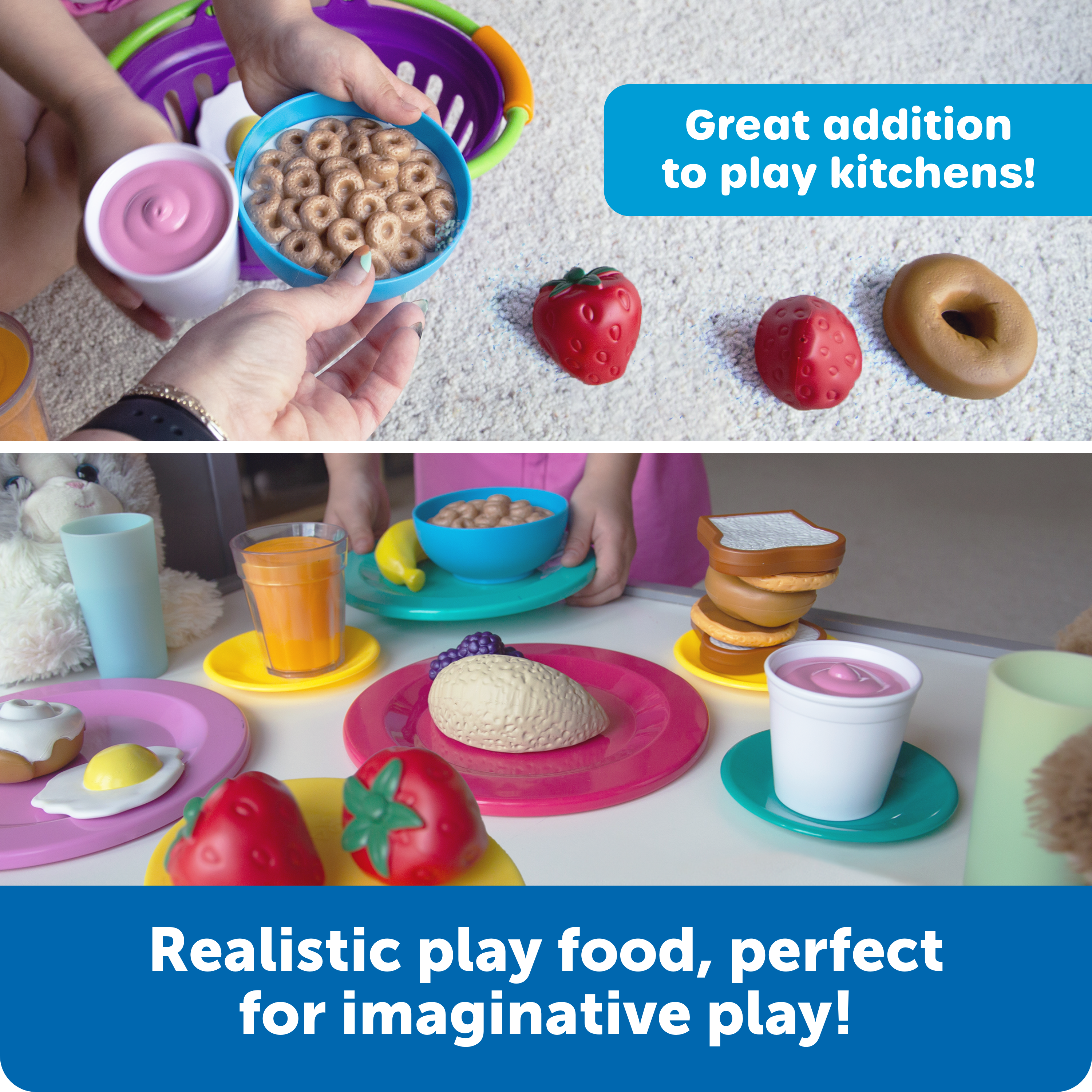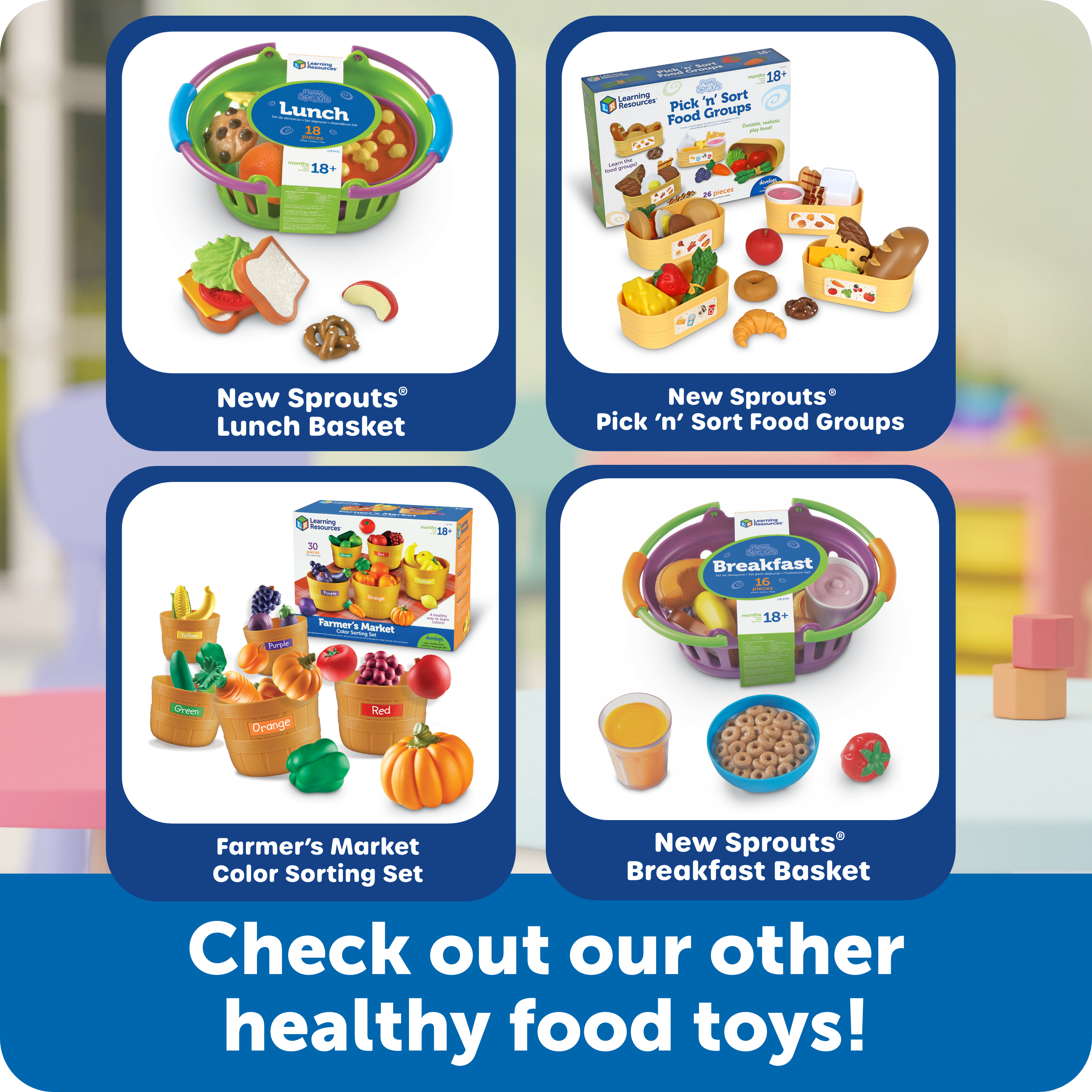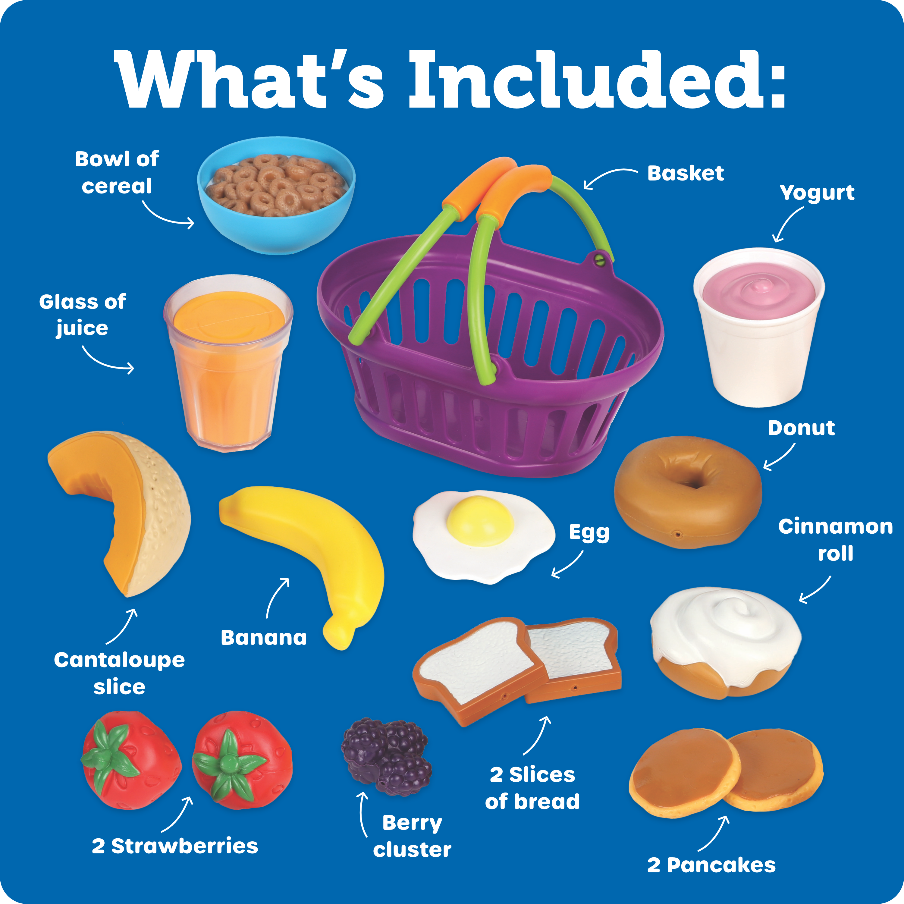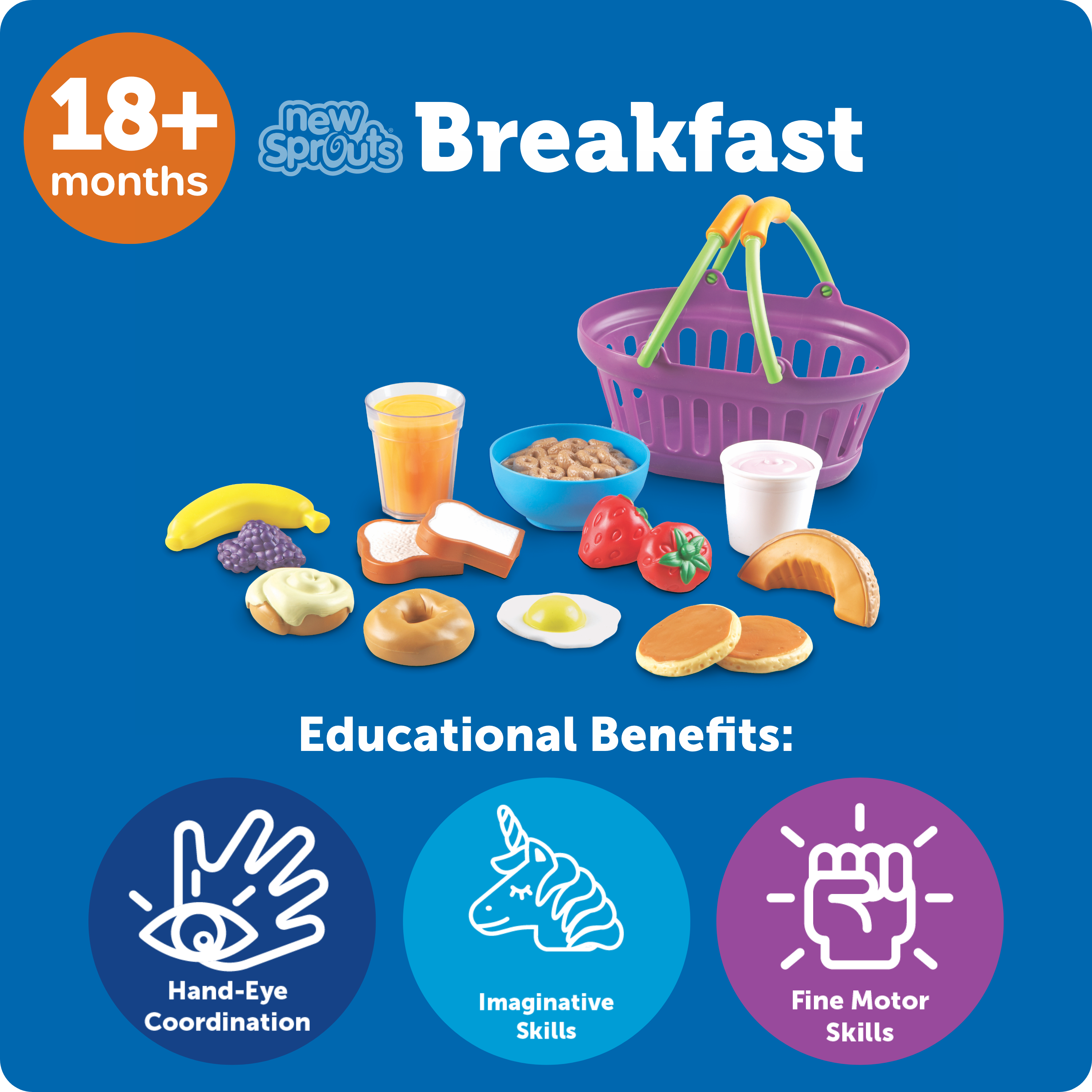 SKU LER9730 Product Title NEW SPROUTS(TM) BREAKFAST BASKET Brand Name Learning Resources UPC 765023097306 Piece Count 16 Min Target Age 1.5 Max Target Age 4 TargetGradeMax Pre-K TargetGradeMin Toddler ProductCategoryProductLine New Sprouts ProductCategorySubject Kitchen & Food Imaginative Play Port of Exit CNFZH Country of Origin CHN Unit Height 4 Unit Length 10 Unit Weight 1.2 Unit Width 7.2 Long Description - DC Encourage imaginative role play and conversations about food with this nutritional basket of play breakfast food. Includes pancakes, a bowl of cereal, a variety of fruits and more. 15 pieces are soft and durable, perfect for curious little hands. Includes egg, glass of juice, cinnamon roll, banana, 2 strawberries, 1 purple berry cluster, mini bagel, 2 pancakes, cereal in bowl, yogurt, cantaloupe slice and 2 slices of bread. Set of 16 pieces store in a colorful, oval basket measuring 7"L x 4½"H. T CA prop 65 No Case Height 9.7 Case Length 22.2 Case Quantity 6 Case Weight 9.3 CPQ 1.35 Includes Remote No Marble Warning No MSRP 29.99 Small Ball Warning No Small Parts Warning No