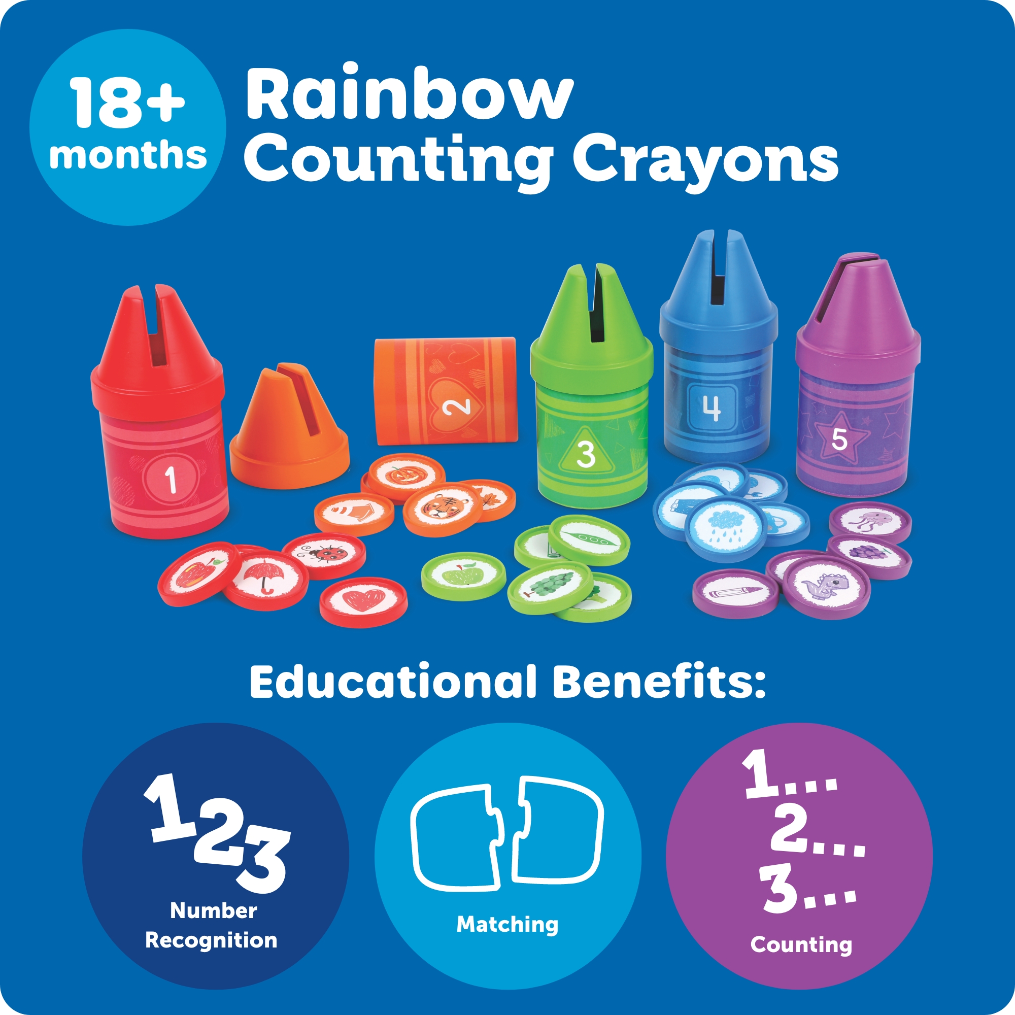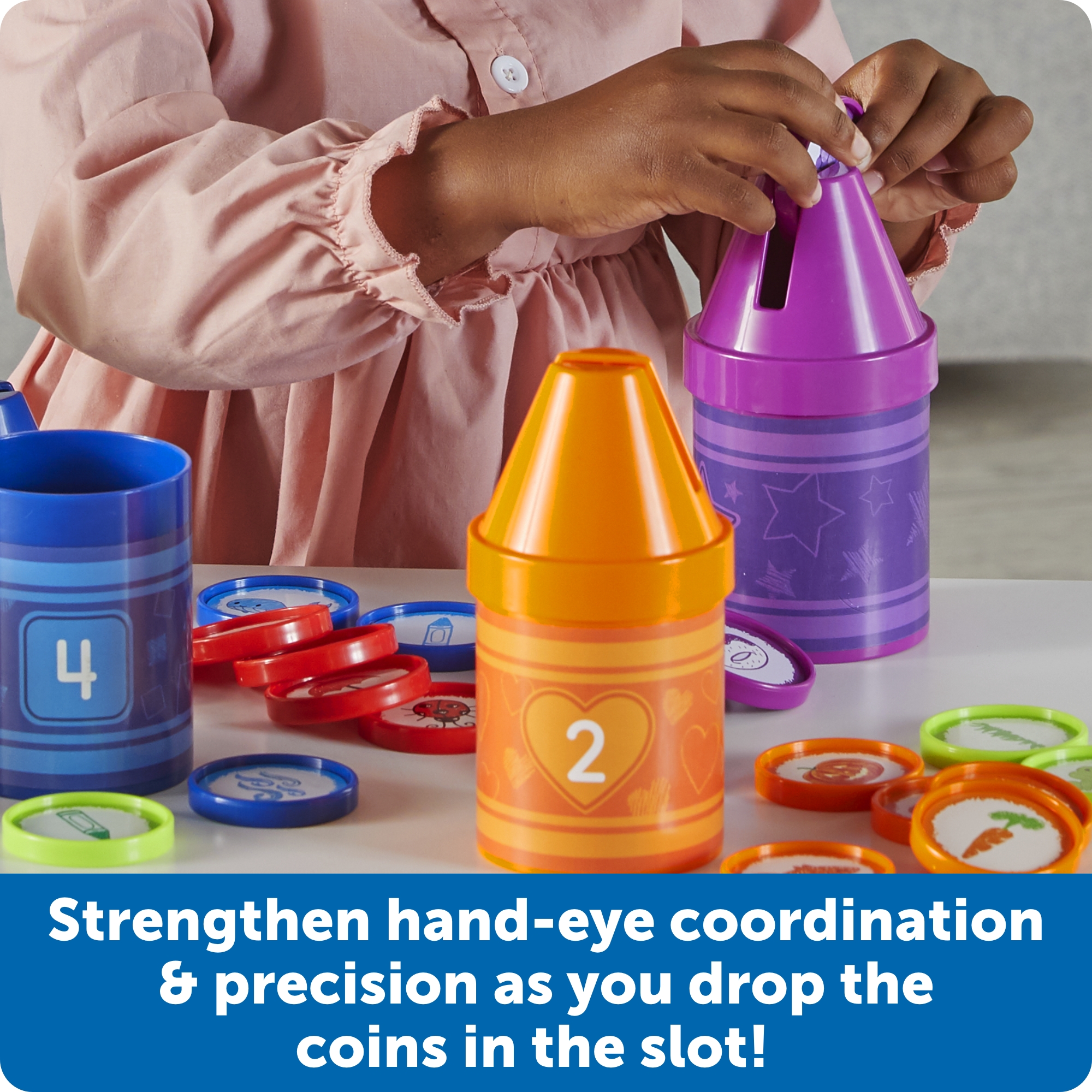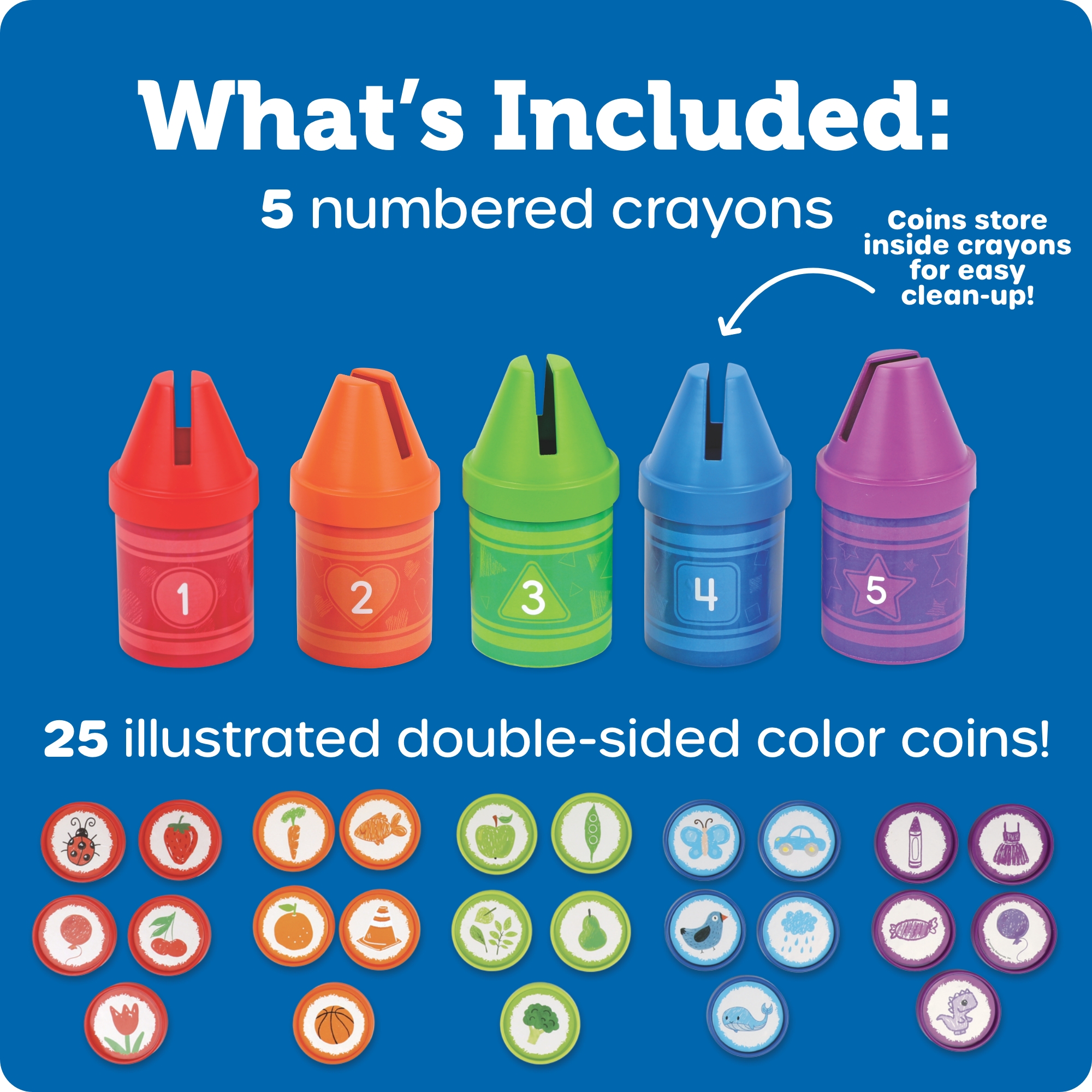SKU LER9812 Product Title Counting Crayons Brand Name Learning Resources UPC 765023098129 Piece Count 0 Min Target Age 1 Max Target Age 100 TargetGradeMax No Grade TargetGradeMin Toddler ProductCategorySubject Math Port of Exit INNXV Country of Origin IND Unit Height 3.15 Unit Length 9.45 Unit Weight 1 Unit Width 7.68 Short Description - DC With Counting Crayons, toddlers build early math and color skills one coin at a time! This 35-piece set includes 5 numbered crayons and 25 illustrated double-sided coins that teach counting, color recognition, and object associations. As kids match and drop coins into the crayon tops, they’ll also strengthen fine motor skills like coordination and precision. All pieces store inside the crayons for easy cleanup—fits well with preschool toys and sorting games! Long Description - DC With Counting Crayons, toddlers build early math and color skills one coin at a time! This 35-piece set includes 5 numbered crayons and 25 illustrated double-sided coins that teach counting, color recognition, and object associations. As kids match and drop coins into the crayon tops, they’ll also strengthen fine motor skills like coordination and precision. All pieces store inside the crayons for easy cleanup—fits well with preschool toys and sorting games! CA prop 65 No Includes Remote No Marble Warning No MSRP 23.99 Small Ball Warning No Small Parts Warning No