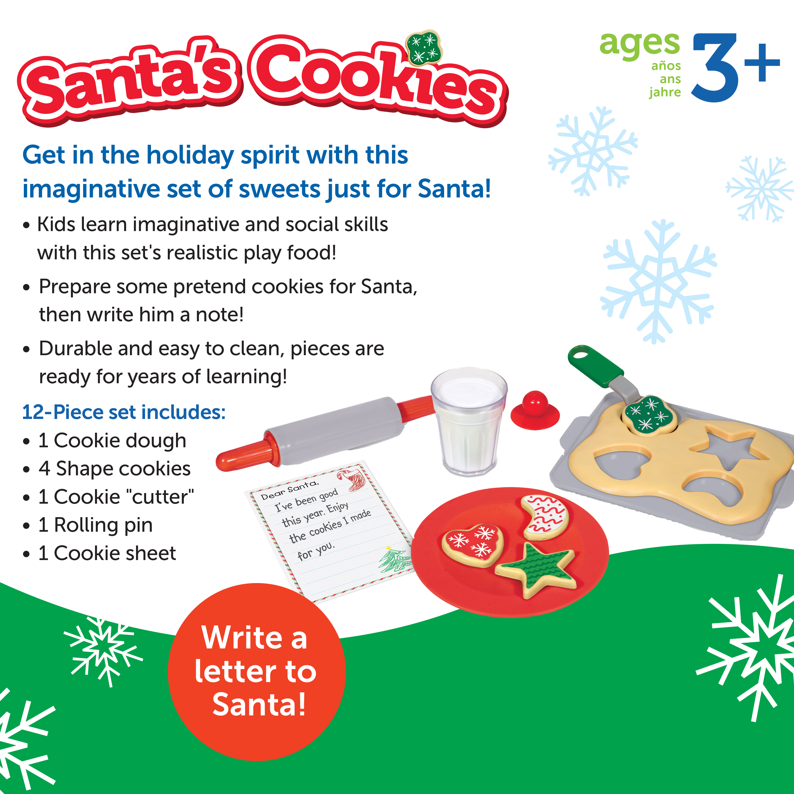 SKU LSP9203-AMZ Product Title SANTA’S COOKIES SET Brand Name Learning Resources UPC 765023792034 Piece Count 12 Min Target Age 3 Max Target Age 99 TargetGradeMax No Grade TargetGradeMin Toddler ProductCategorySubject Kitchen & Food Imaginative Play Port of Exit CNFZH Country of Origin CHN CA prop 65 No Includes Remote No Marble Warning No MSRP 15.99 Small Ball Warning No Small Parts Warning No