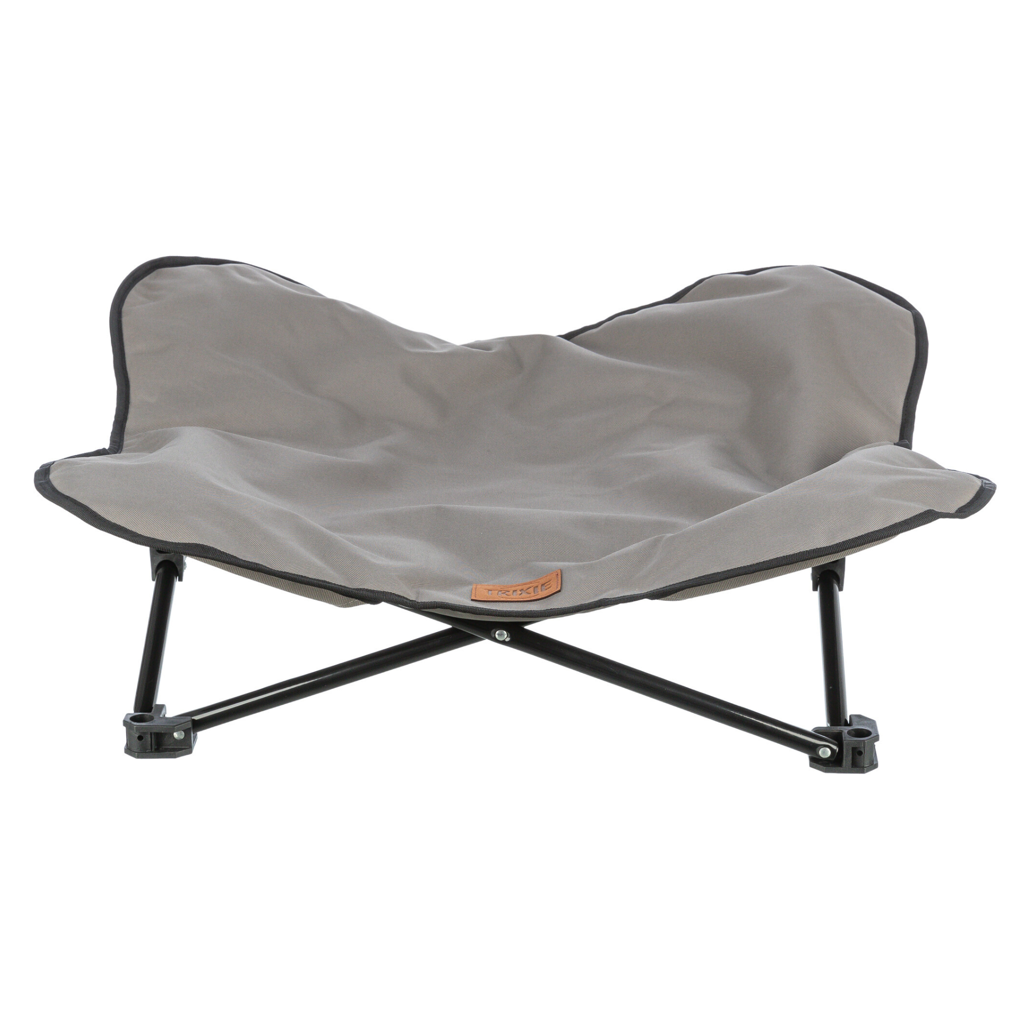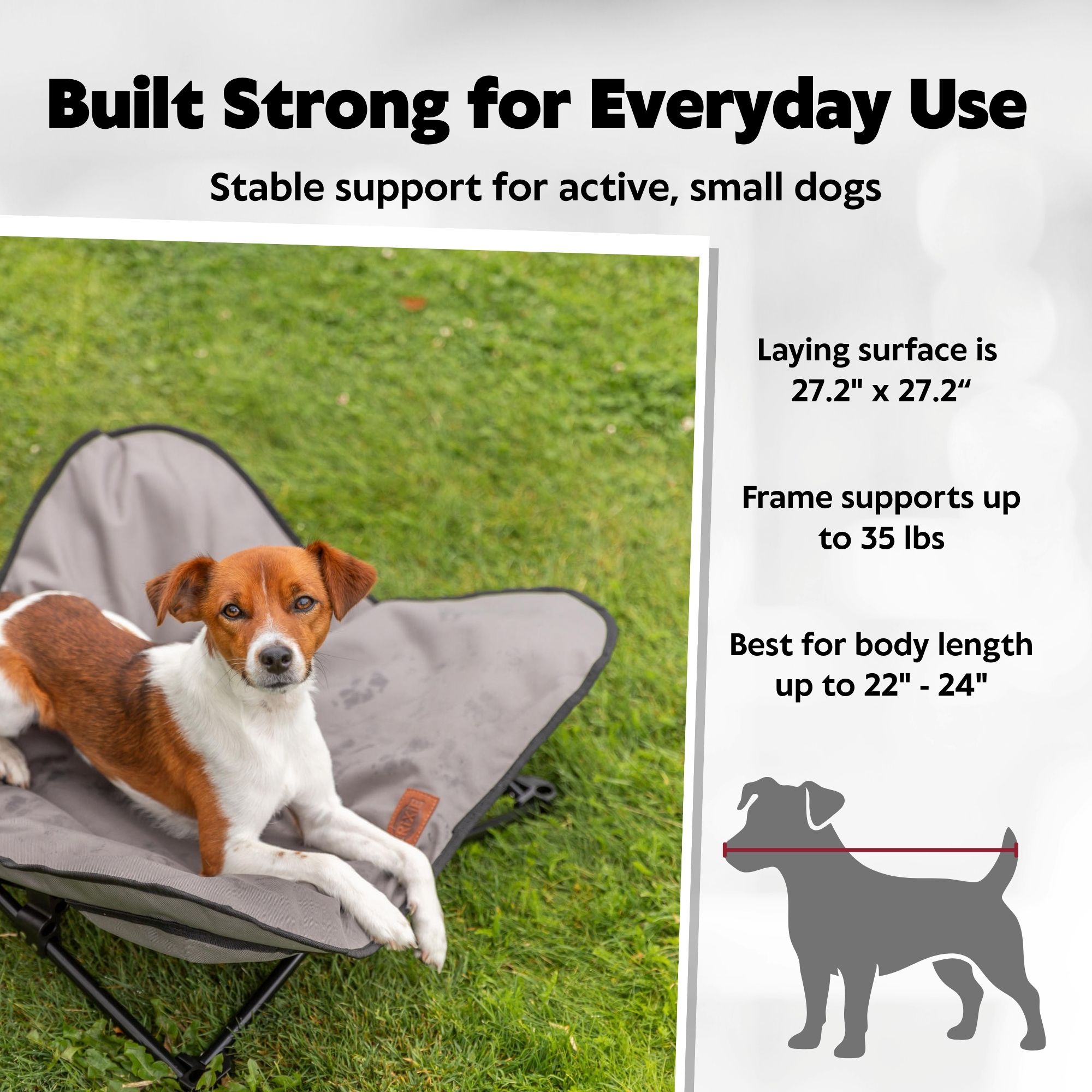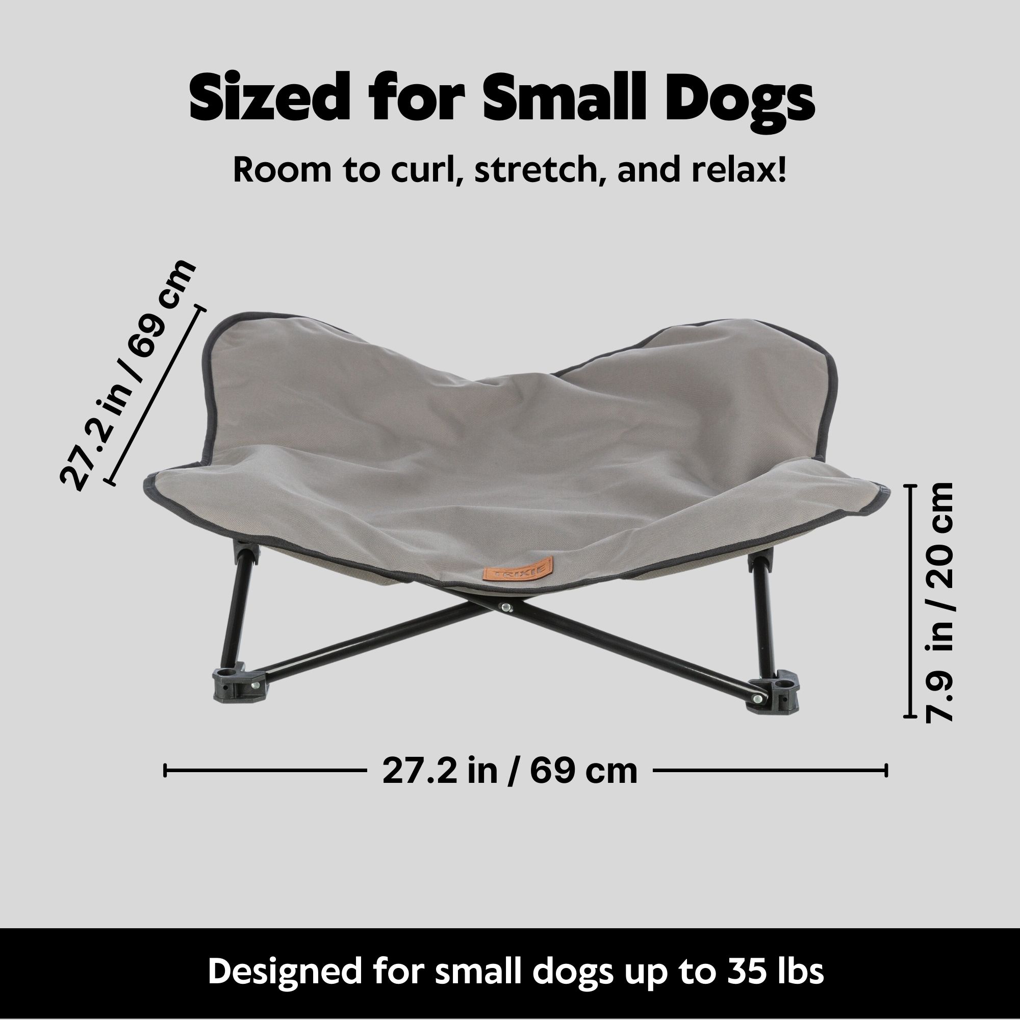 The TRIXIE Small Camping Cot for Dogs gives your pup a comfy place to rest at home or on the go. The 27.2 x 27.2-inch elevated sleep surface is a great fit for small dogs who like to curl up or stretch out a bit after playtime. A sturdy steel frame lifts your dog off the ground to allow airflow underneath, helping them stay cooler and cleaner during camping trips, travel, or backyard lounging. The frame supports small breeds up to 35 pounds depending on body size and sleeping style. A removable cushioned topper adds extra comfort and is easy to hand wash. Pet Parent Tip: Measure your dog from the tip of the nose to the base of the tail and consider how they like to sleep to choose the best bed size.