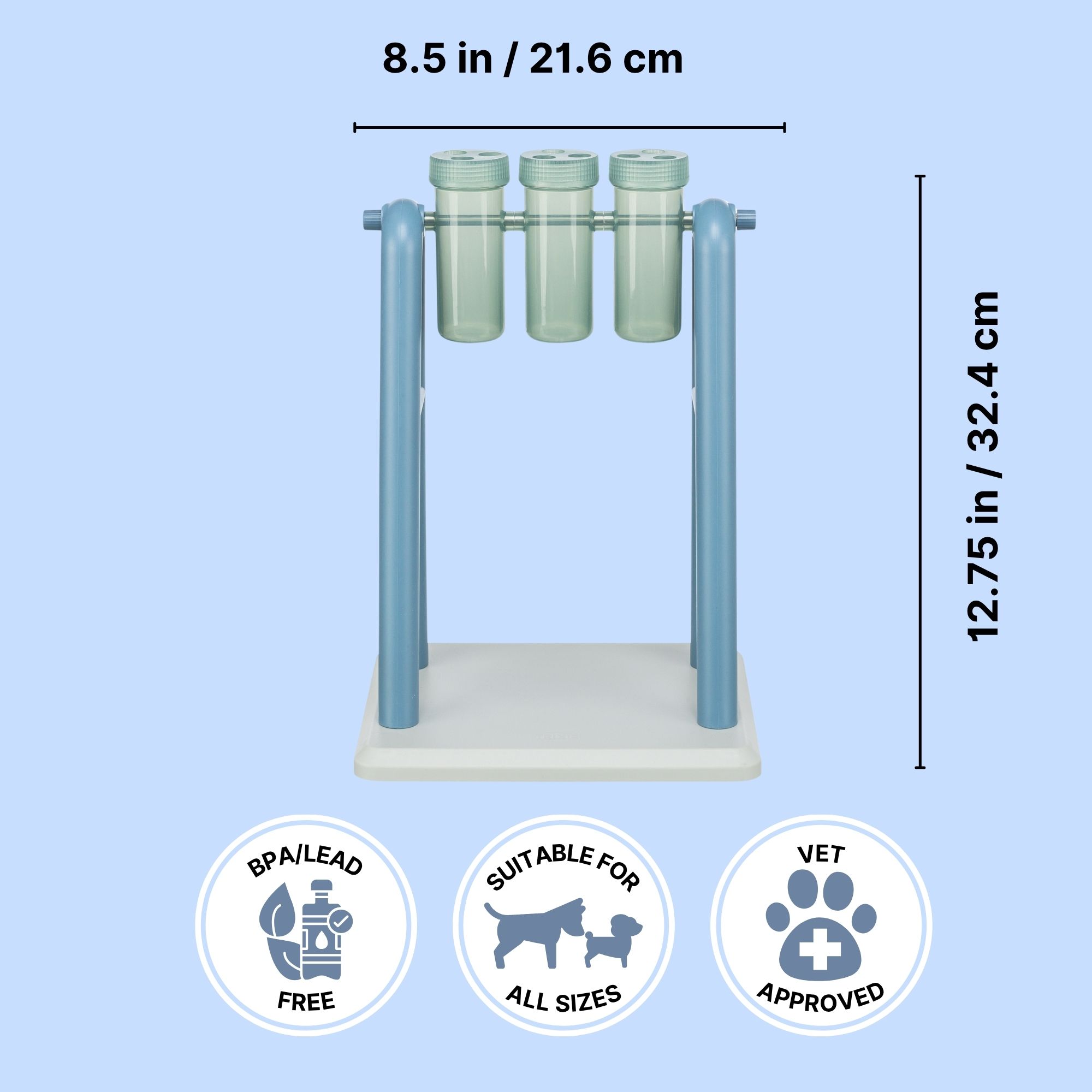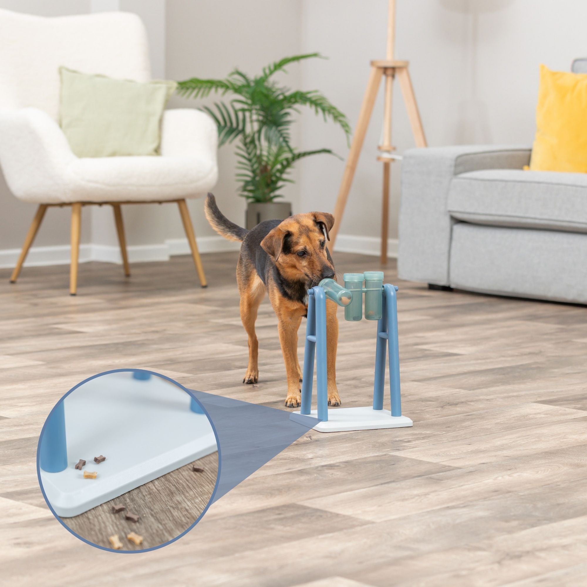 TRIXIE Mad Scientist Turn Around interactive dog puzzle toy is a fun way to keep your dog engaged and stimulate their mind. It will keep your dog entertained as they sniff out the hidden treats with their noses! This Level 2 dog puzzle toy is for dogs that have already mastered Level 1 and need more challenges. Fill three rotating tubes with treats and watch your dog learn to turn and balance for treats to release. Includes two sets of lids for the tubes. Mix and match tops to increase the difficulty level. The non-slip rubber feet keep the game in place as your dog plays and explores. We’ve included an instructional booklet with tips and tricks for challenging and training dogs of all ages through play. Suitable for dogs of all ages and activity levels. Made from tough plastic parts and pet-safe materials that are BPA and Lead-free. Hand wash with soap and warm water to clean between uses. Your pet should be supervised with this toy.