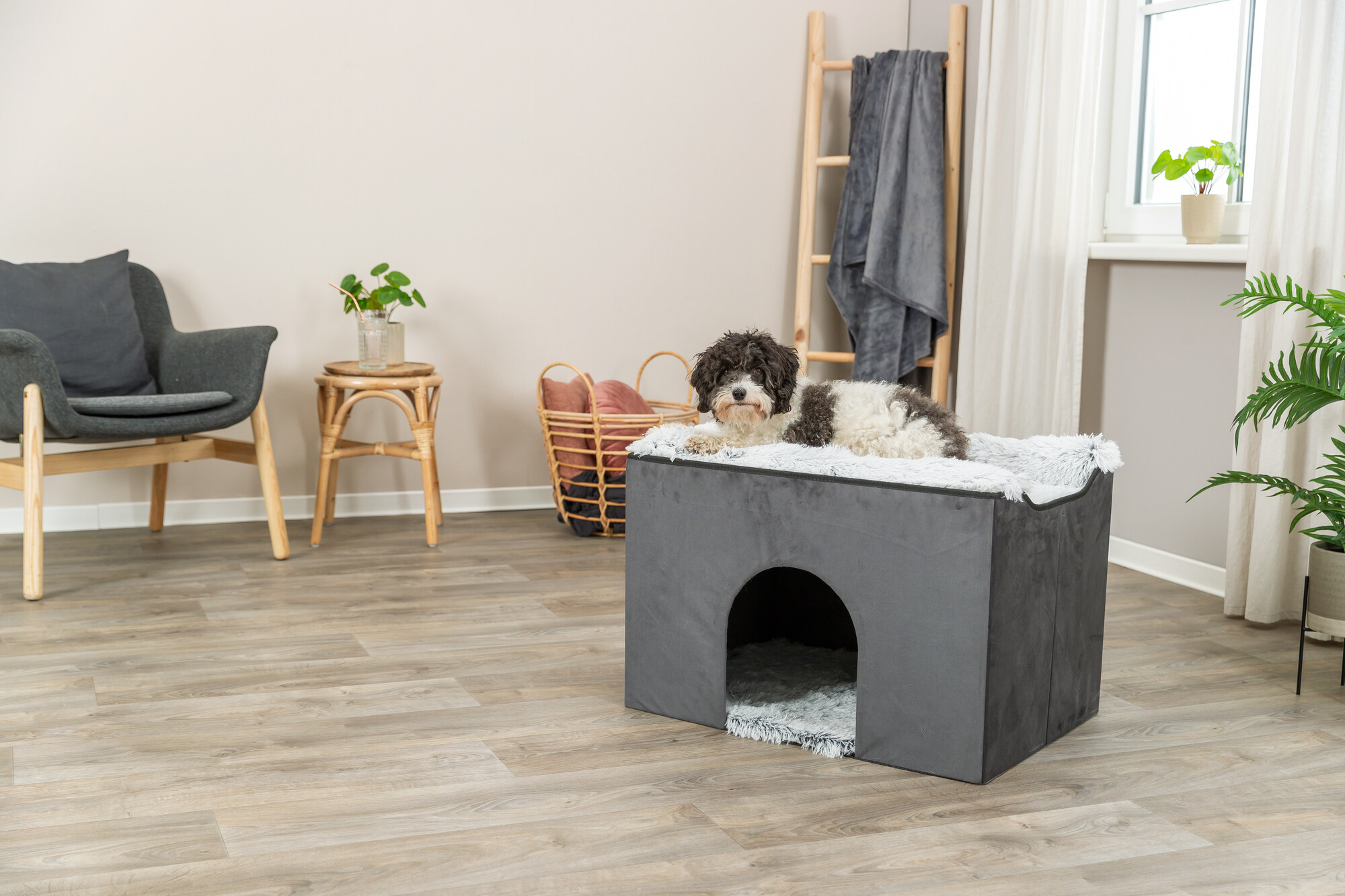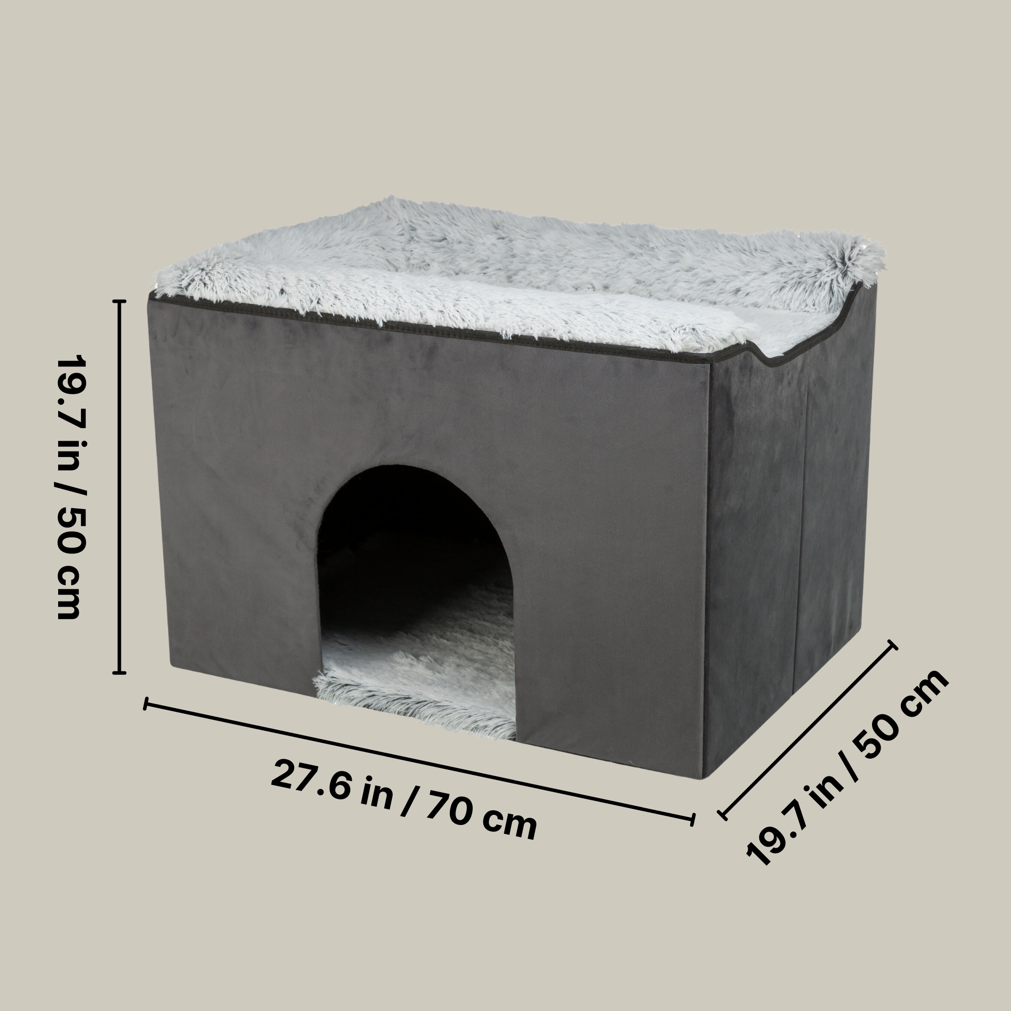 - Covered in velour polyester for a soft touch and is topped with a velvety plush removable bed 27.5 x 19.7 in. (70 × 50 cm)