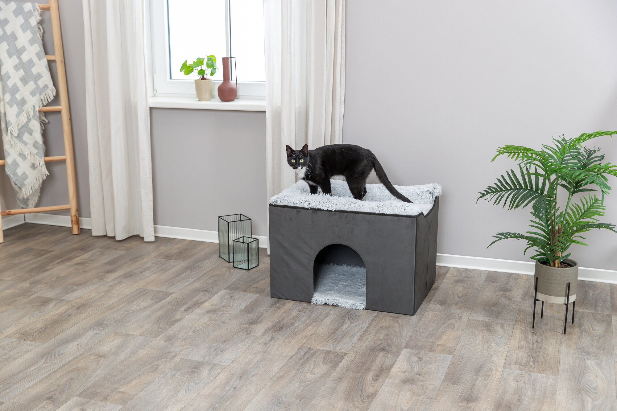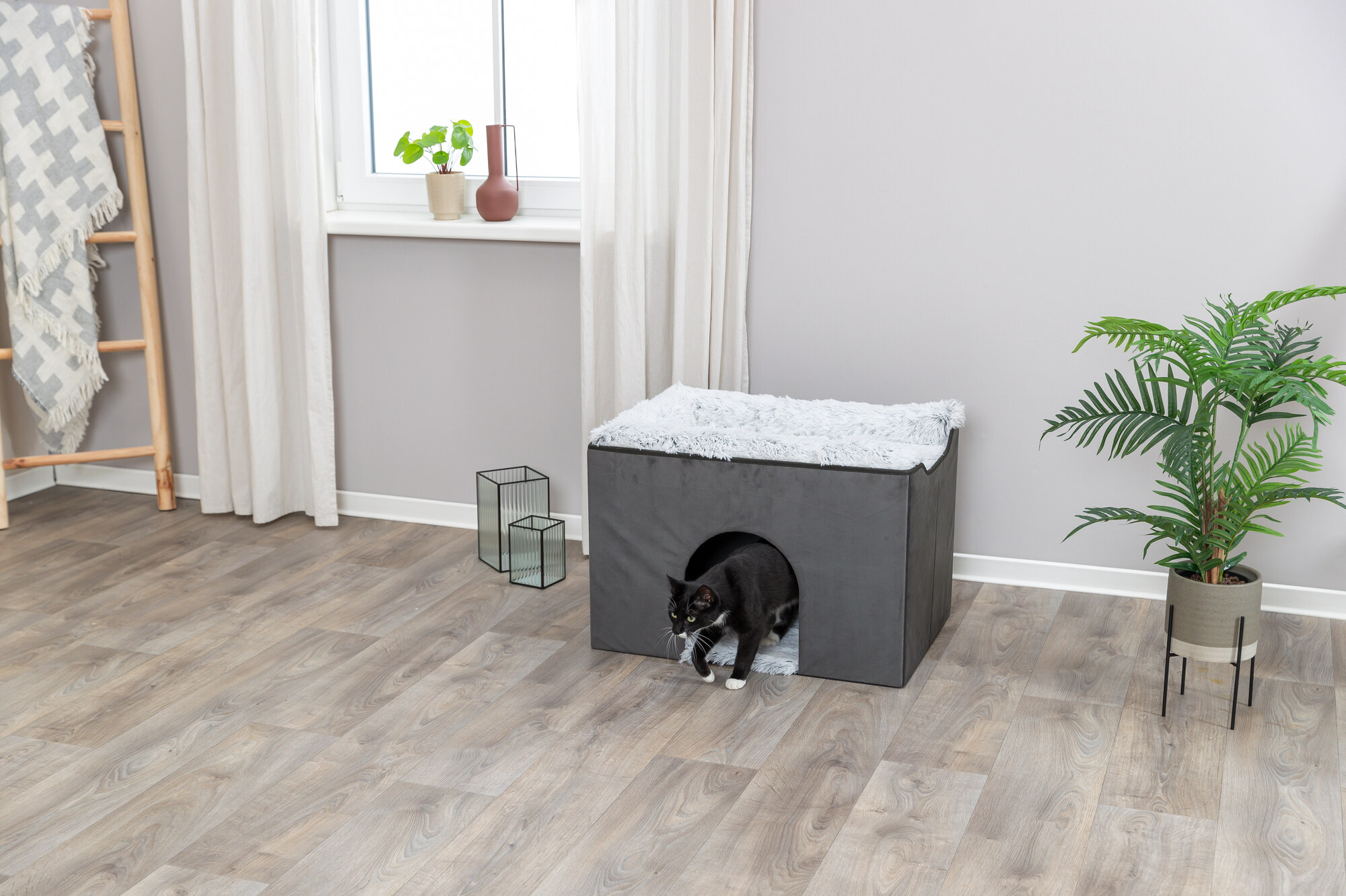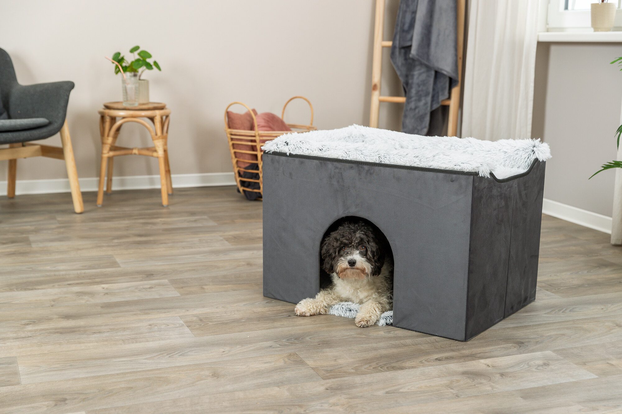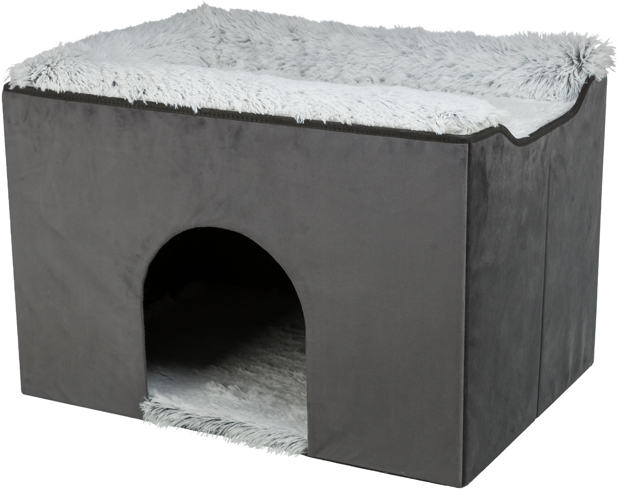 Give your furry friend a comfortable and cozy place to retreat to with the TRIXIE Harvey Cave! The enclosed bottom area provides a hidden cave for your cat or small dog to relax, while the upper platform is perfect for them to nap, look out the window, or just unwind. The cave is covered with velour polyester that is soft to the touch and comes with a reversible foam-filled cushion, guaranteeing extra comfort for your pet. The top of the cave has a removable super plush bed and is easily accessible. You can even connect it with one of our pet staircases (items #39433 or #39345) for easy entry! When you don't need it, the pet cave is collapsible and easy to store. Plus, you can wipe it down with a damp cloth for cleaning, and the bed and cushion are both machine-washable in warm water. Your pet will love this cozy retreat!