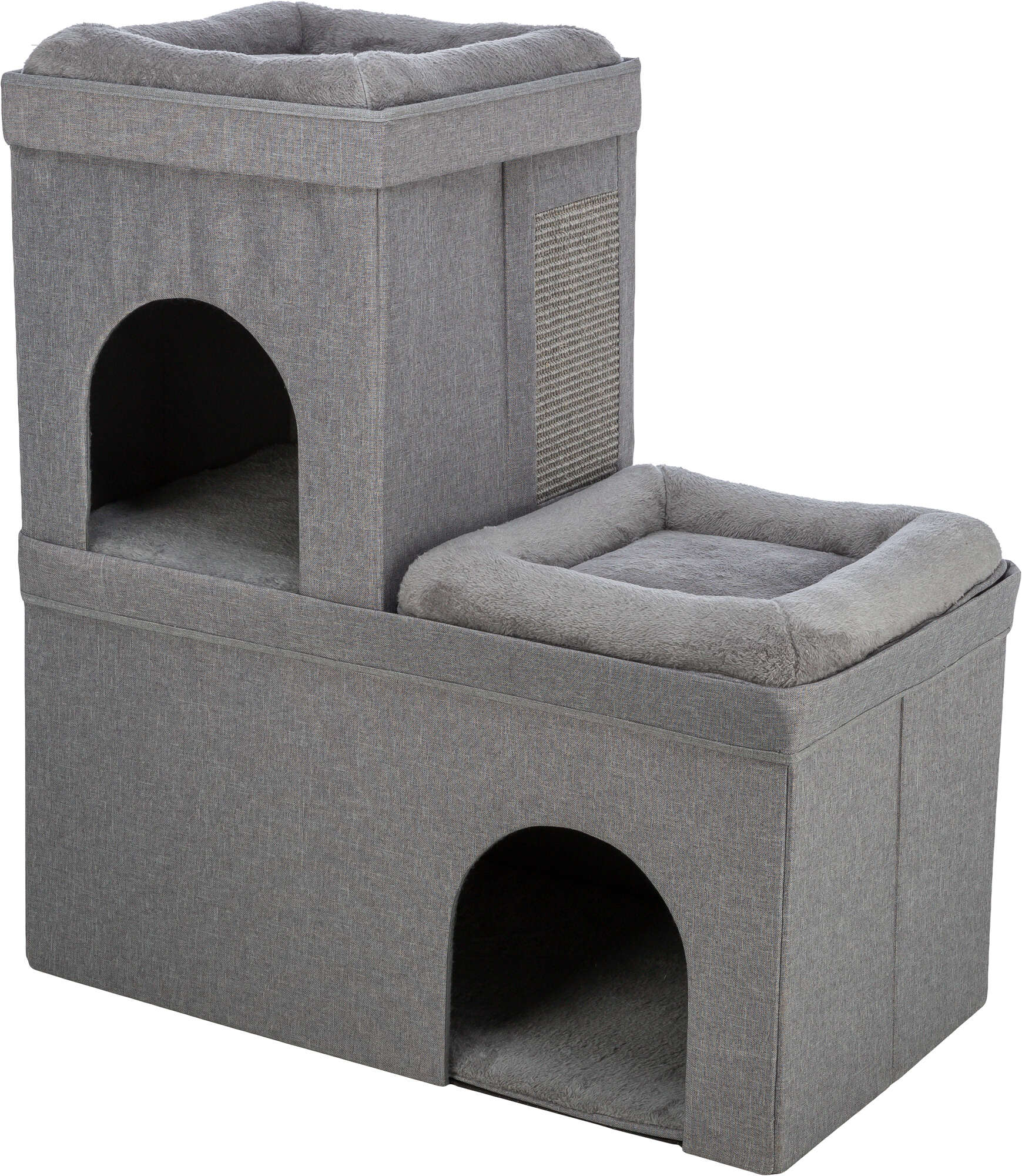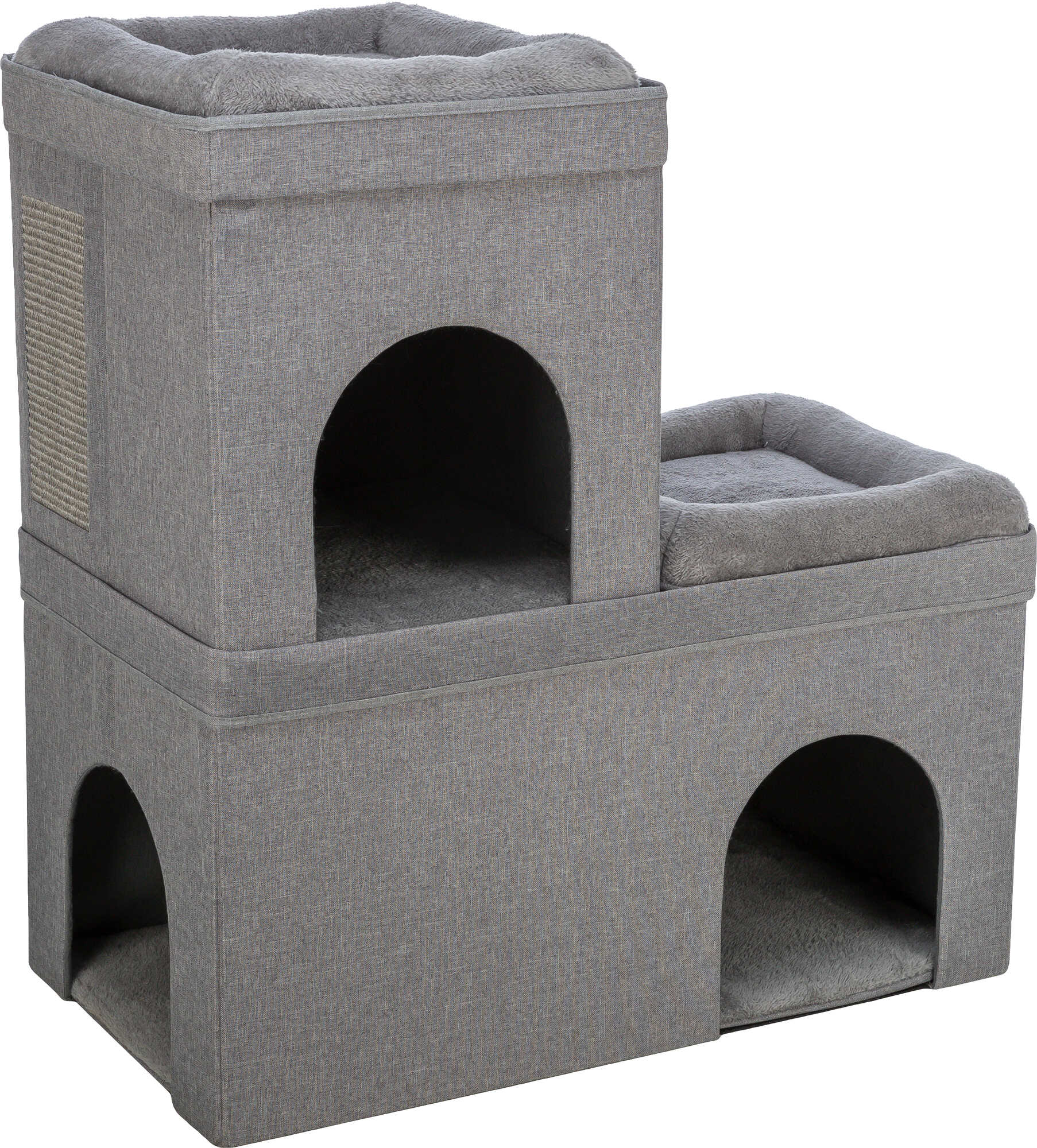 The TRIXIE Crazy Cube Stackable Cat Condo provides endless opportunities for your cats to play, scratch, explore, or relax. This stylish piece of cat furniture combines the best of both worlds: condo hideaways and scratching surfaces. Felines can sharpen their claws on the sisal scratching surface on the sides of the cubes instead of on your furniture or carpet. If a nap or a place to hide is in order, your cat can lounge in one of the beds on top or crawl inside one of the kitty condos, both are covered in plush fabric inside and out. Each condo has a cozy reversible cushion that can be handwashed. The larger lower-level condo offers two entry/exit openings and enough room for multiple cats to lounge together. Stack additional condo items (sold separately) to create a unique fortress and collapse them when they are not in use to save space. This is the perfect retreat for cats of all ages; cubes can hold up to 35 lbs.