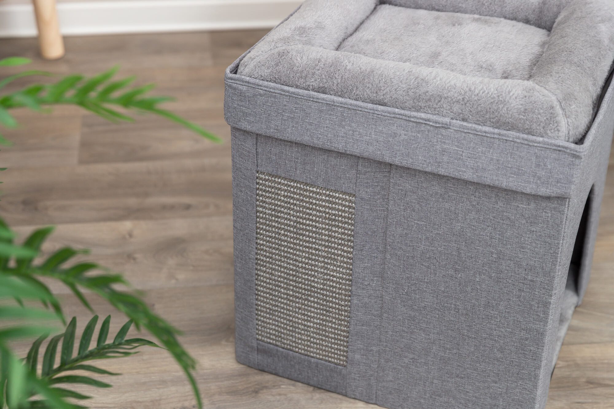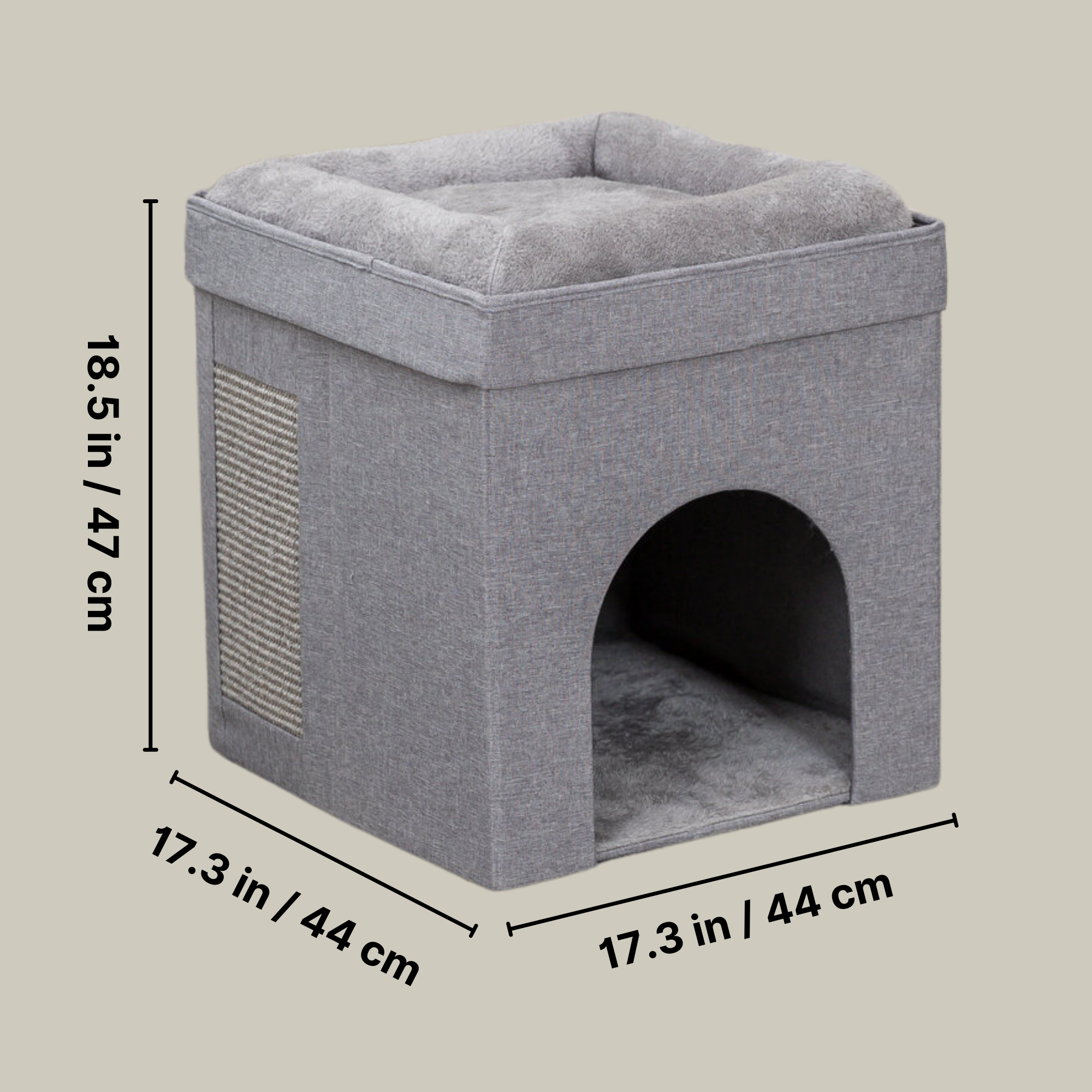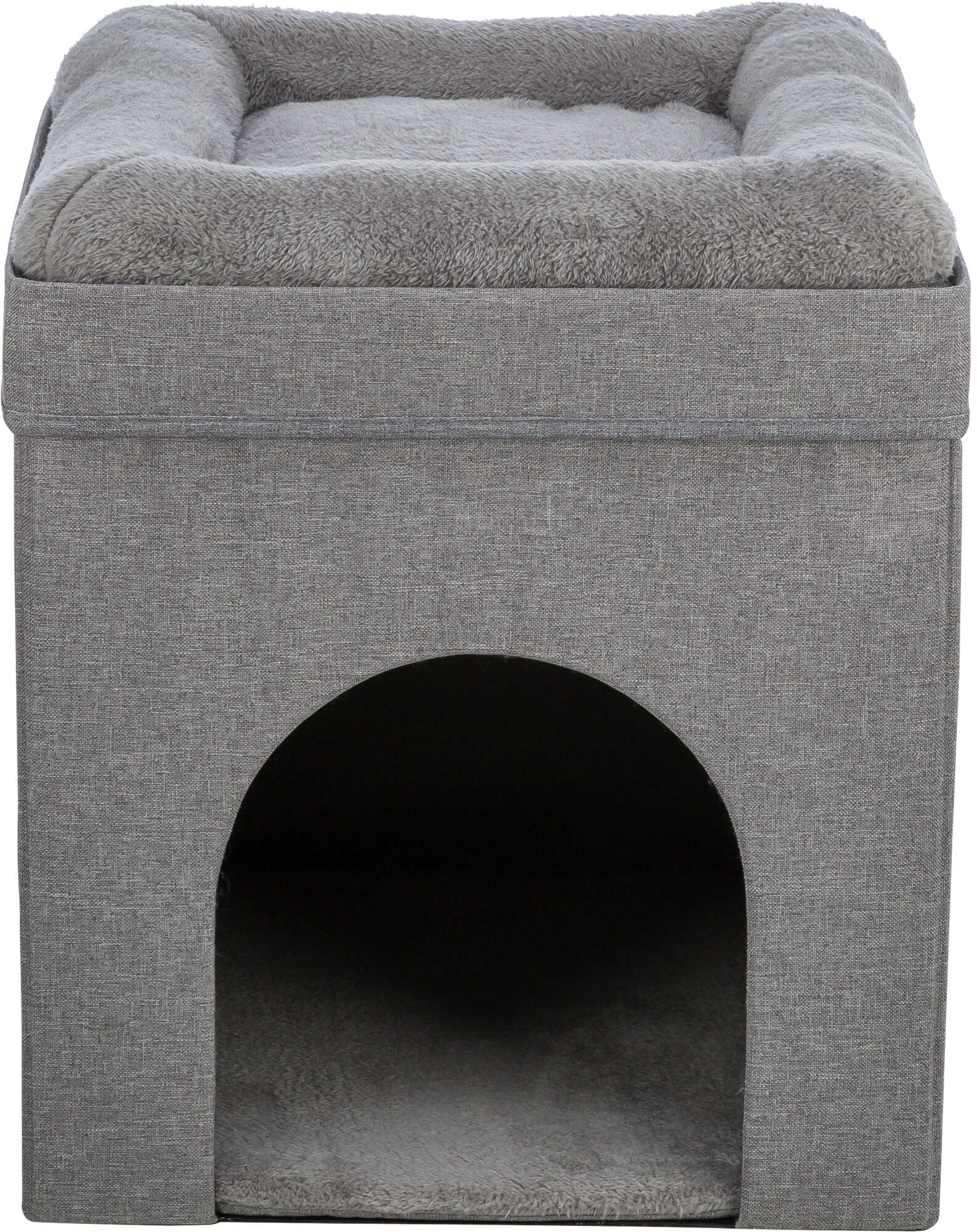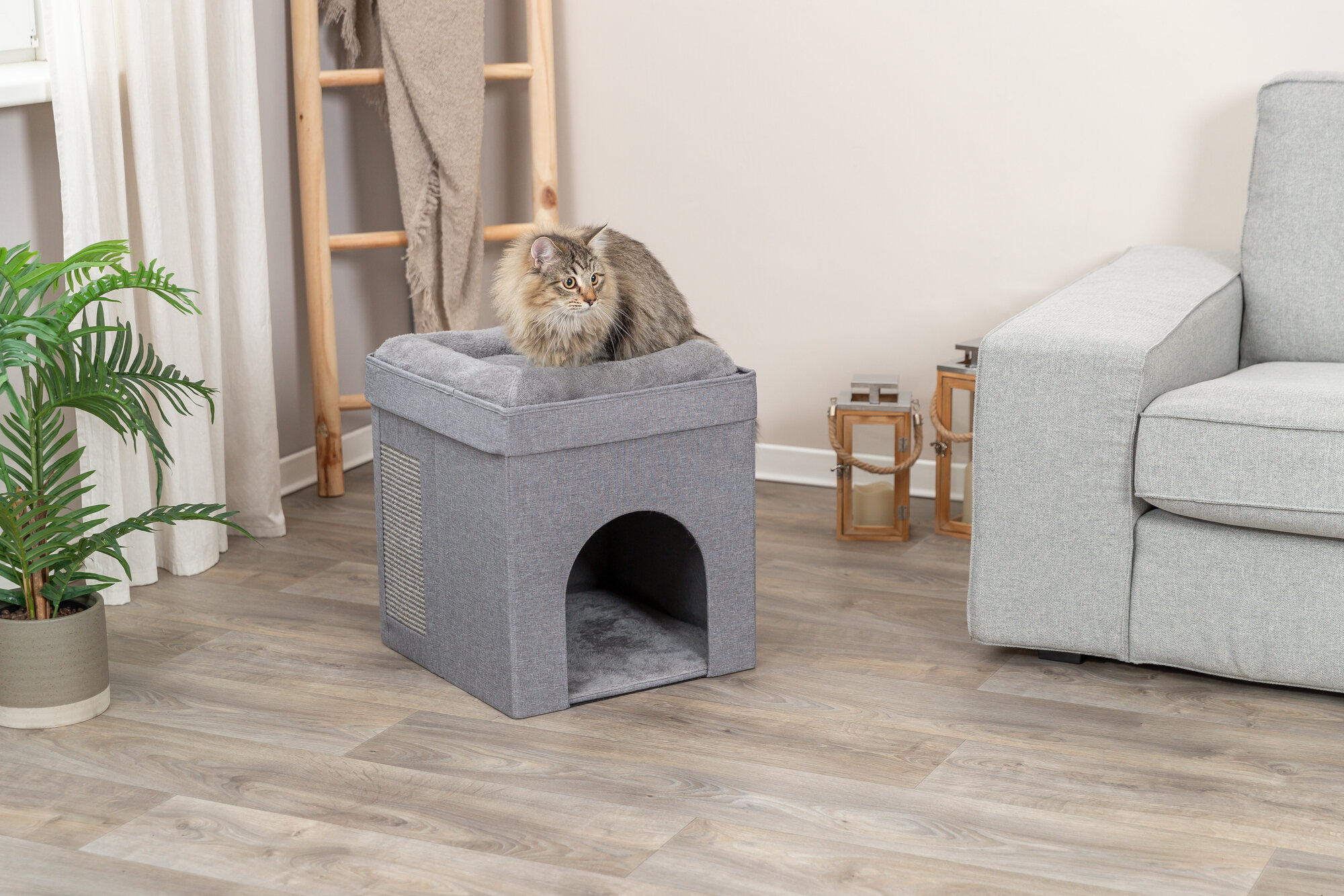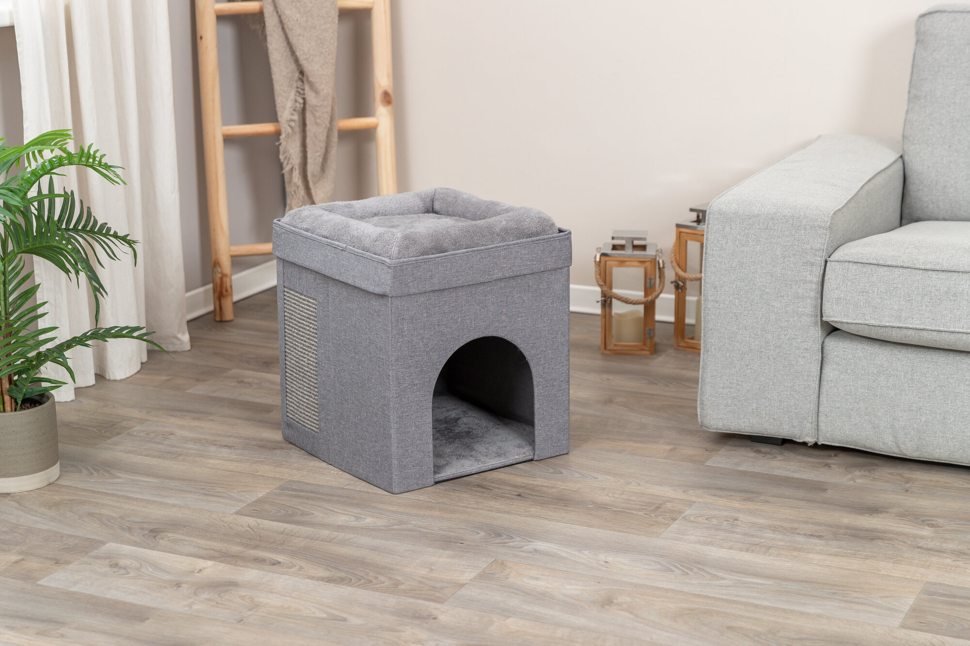 The TRIXIE Crazy Cube Stackable Cat Condo provides endless opportunities for your cats to play, scratch, explore, or relax. This stylish piece of cat furniture combines the best of both worlds: a condo hideaway and a scratching surface. Felines can sharpen their claws on the sisal scratching surface on the side of the cube instead of on your furniture or carpet. If a nap or a place to hide is in order, your cat can lounge on top of the plush-covered condo or crawl inside the luxuriantly soft-covered kitty condo and rest on the cozy reversible plush cushion. Stack additional condo items (sold separately) to create a unique cat fortress and collapse them when they are not in use to save space. This is the perfect retreat for cats of all ages; cubes can hold up to 35 lbs.