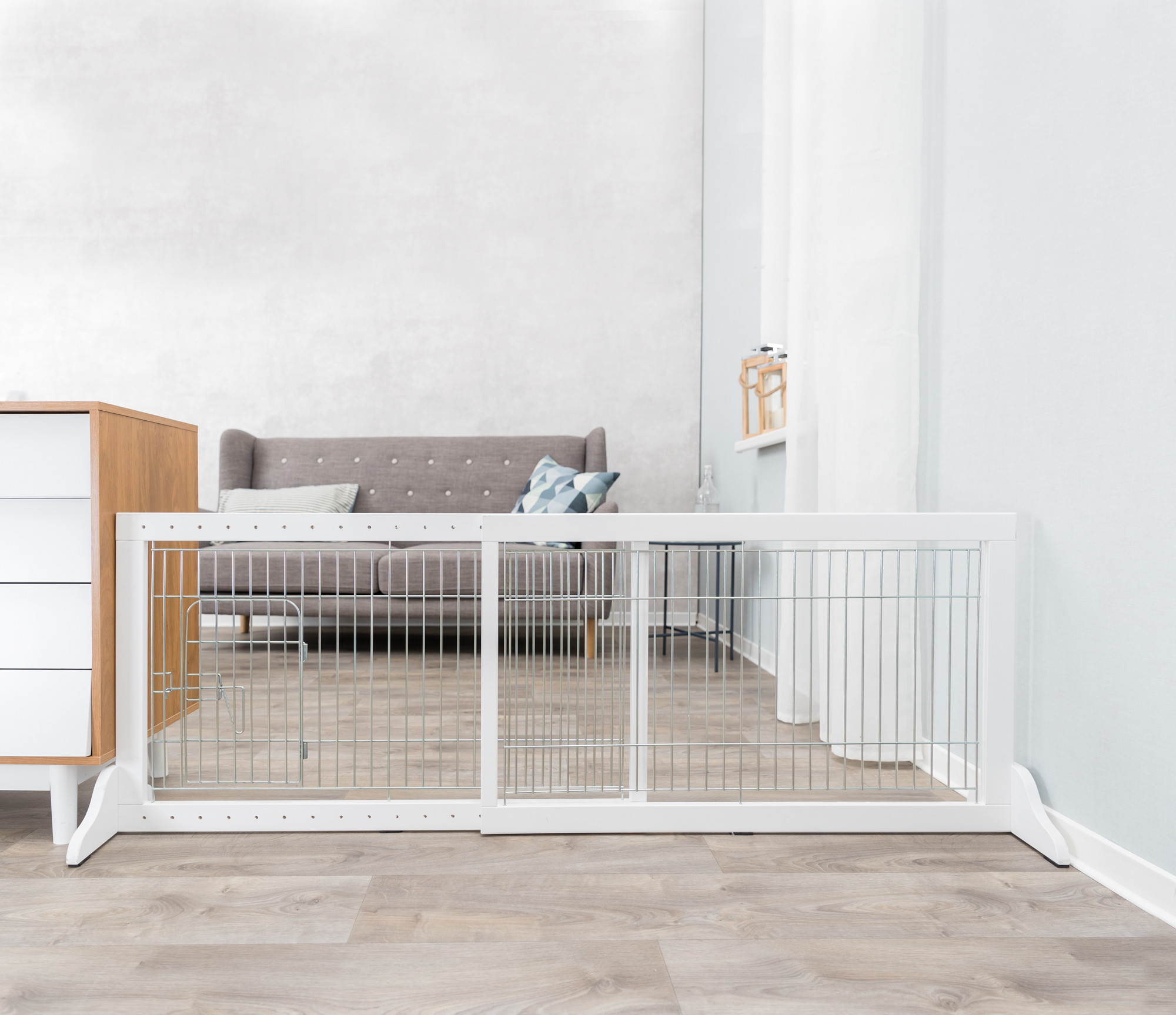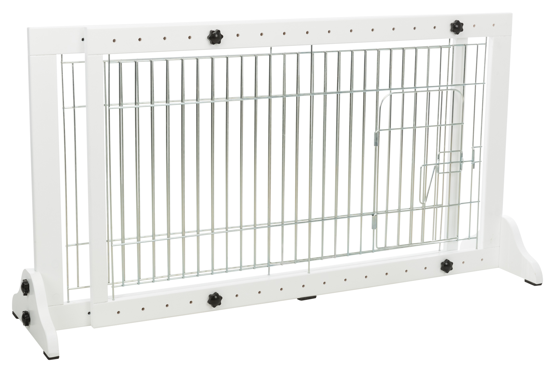 The TRIXIE Freestanding Pet Gate provides a practical way to limit your pet's access around the house. The freestanding barrier fence can block access to certain home areas, stairs, hallways, and more. It can keep your four-legged friend in one room while you’re away! It has a sliding adjustable width and easily expands from 39.8" to 71”. There is no need to constantly remove the gate to enter a room because it only stands 22.5" high; you can easily step over. It also includes a pet door to allow room access to your buddy when needed. It is built with solid, sustainable wood, which is durable and beautiful. The wood frame features a neutral finish for an attractive look that complements many home décor styles. The fence is built with 6-gauge wire for protection and durability. The extra-long support legs improve stability. Non-marking rubber feet protect floors and minimize skidding. Additionally, the barrier requires no installation, drilling, or hardware that could damage your home. It is lightweight and easily moved anywhere.