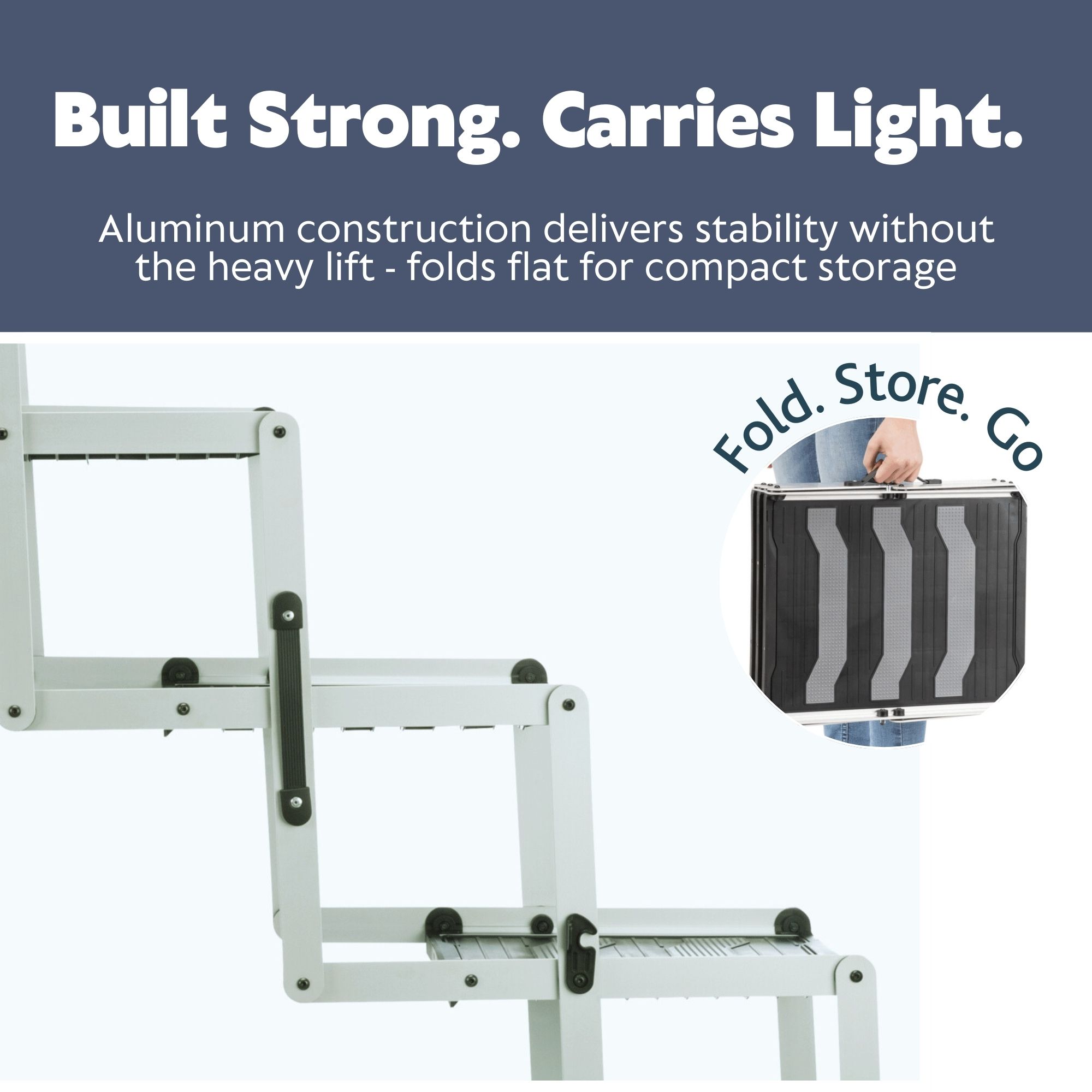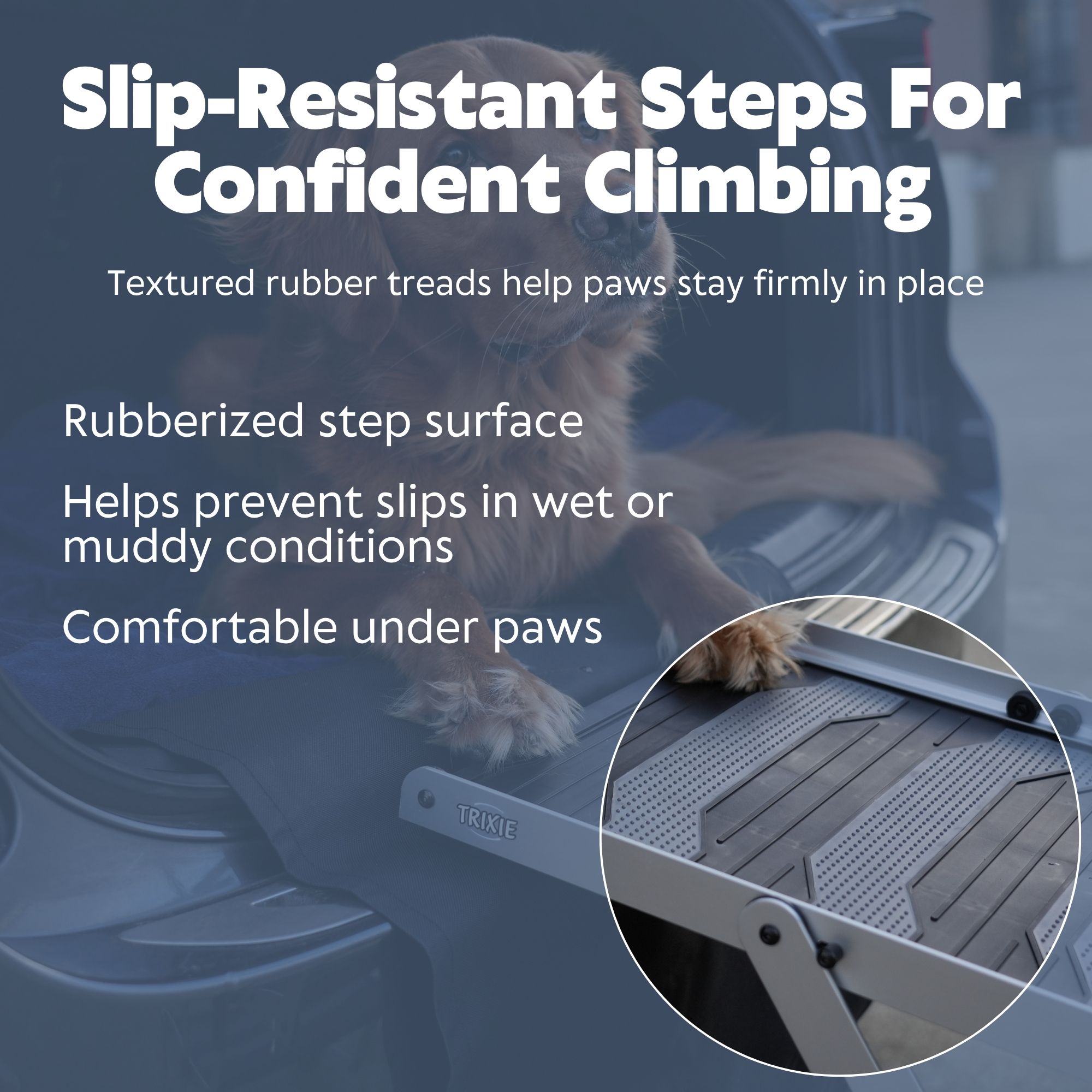 TRIXIE's Heavy Duty Foldable Aluminum Pet Steps are designed to safely assist your pet in reaching new heights independently. Constructed from sturdy, yet lightweight aluminum, this pet step is ideal for pets who are more comfortable with steps versus ramps. These steps accommodate dogs up to 165 pounds. The height is adjustable from 19.5 to 27.5 inches. Each step includes rubber treads to prevent slipping. Pet steps help to protect pet's joints by reducing the need to climb or jump. Convenient and easy to use, the pet step is a lightweight 8.5 pounds and quickly folds to a compact 17 x 15 x 5.5 inches for easy storage. The top edge includes a rubber bumper to protect your vehicle from damage.