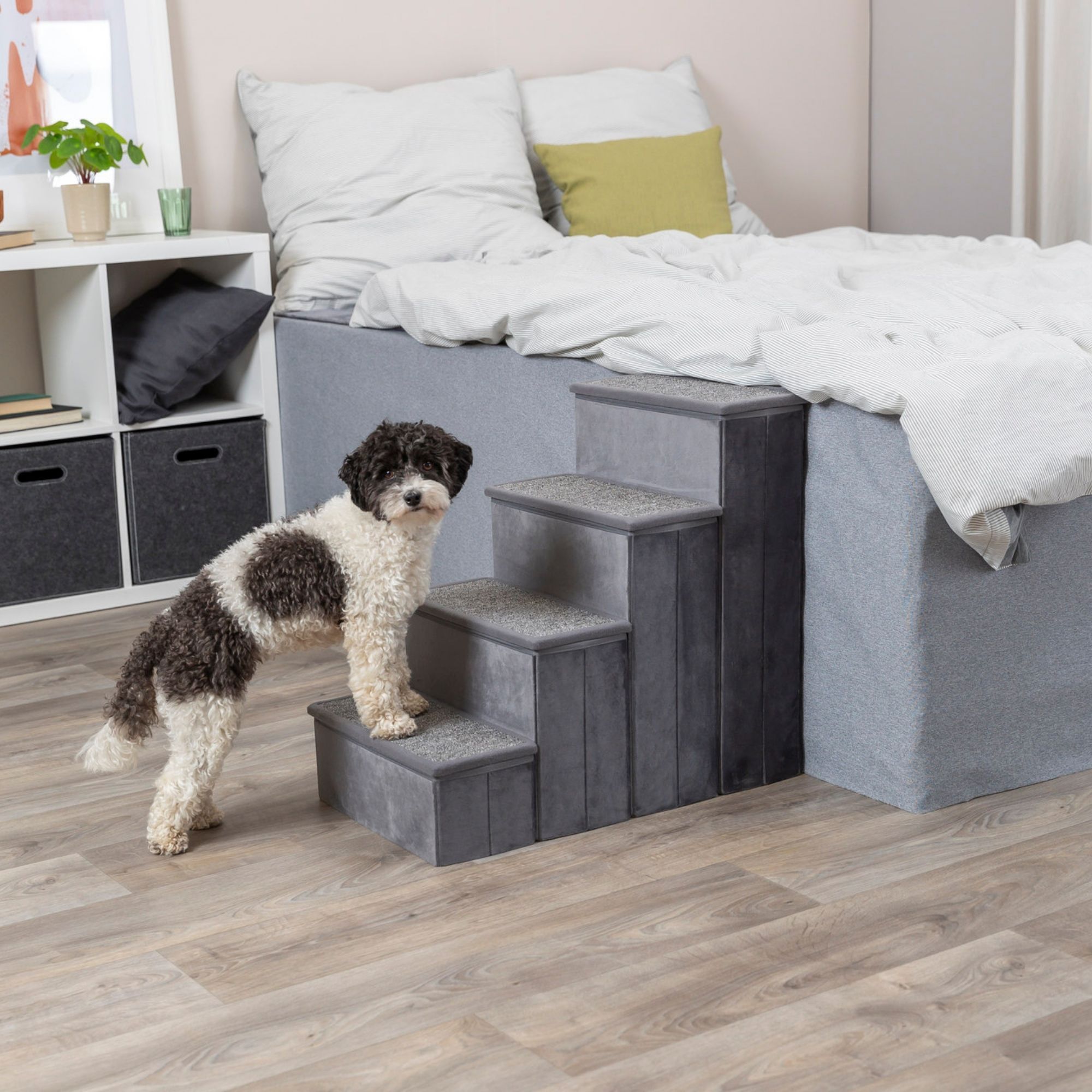 Give your pets a little boost with the TRIXIE Velour 4-Step Pet Stairs. Pet steps help your dogs or cats safely reach higher places, like the bed, couch, chair, or window seat, with ease. They do not need to jump or strain to snuggle on your lap or curl up in bed with you. The top of the steps reaches 22.8", with a rise of 6" per step for a gentle climb. Each step has a carpet-lined, removable top that opens to reveal storage space that's perfect for keeping pet toys, blankets, or anything else you would like to reach within. The sturdy construction supports up to 110 pounds, and the steps are 11" wide to provide a stable footing. When not in use, the steps fold flat for easy storage, are easy to move from room to room, and pack away for trips. The velour plush fabric offers a wonderfully soft-to-the-touch finish your pets will love, and it adds a luxurious look to your room.