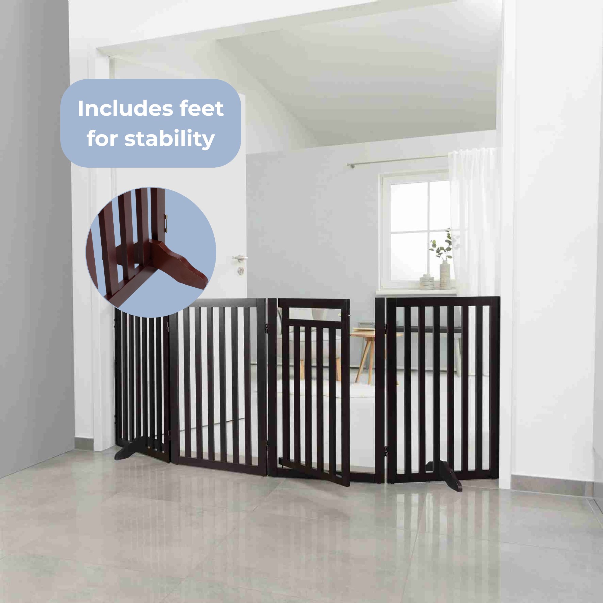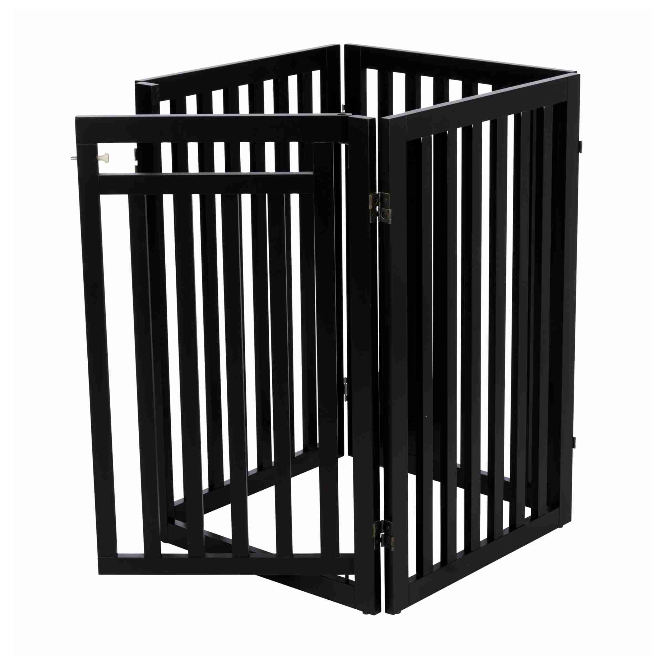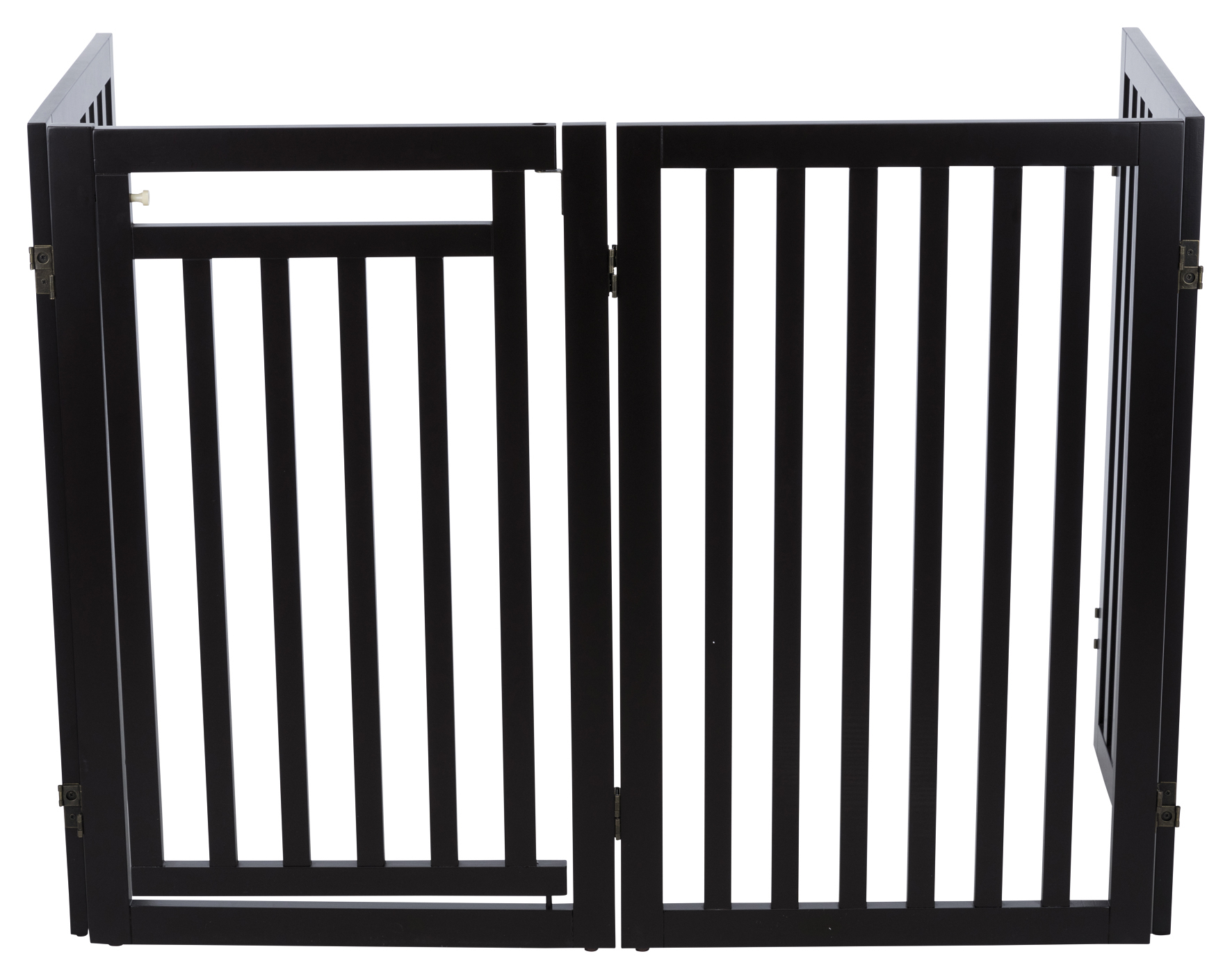 The TRIXIE Freestanding 4-Panel Convertible Pet Gate provides a practical way to limit your pet's access around the house. The gate fits room and hallway openings from 40" to 80". Our unique design allows the unit to convert into a 2.78 sq. ft. pen, room divider, and dog gate as your pet grows. A walk-thru door makes it easy to go from room to room. They are built with solid, sustainable wood and are durable as well as beautiful. The accordion-style panels can be placed anywhere between 90° and 180°. Non-slip rubber feet are provided to keep the gate in place and protect floors and carpets. Each panel is 20" wide by 32" tall.