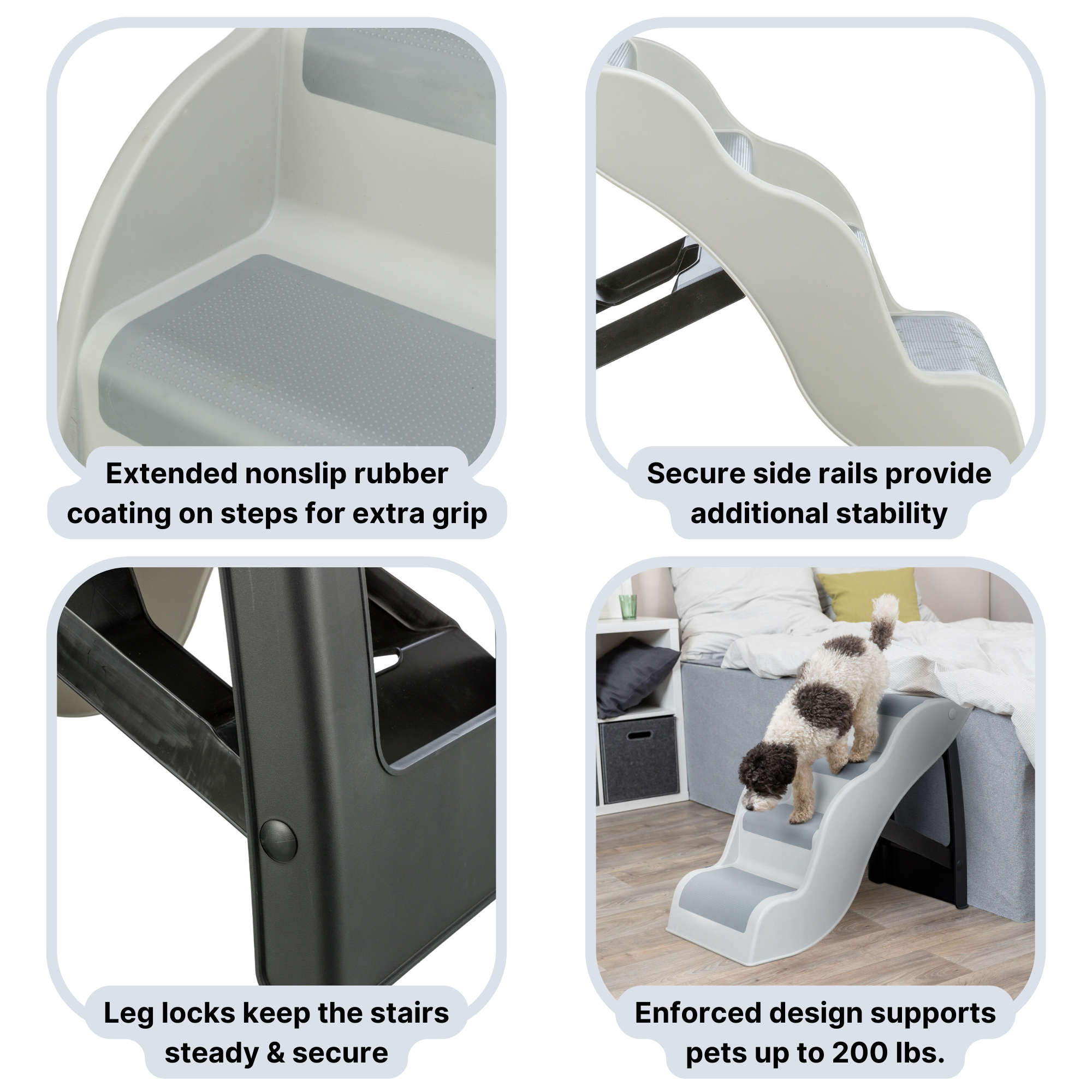 - Superior Stability & Support: The nonslip steps and secure side rails provide excellent stability for your pet while using the stairs. The strong, reinforced design can support pets up to 200 lbs, and the extended, non-slip rubber coating on each step offers extra grip for confident climbing