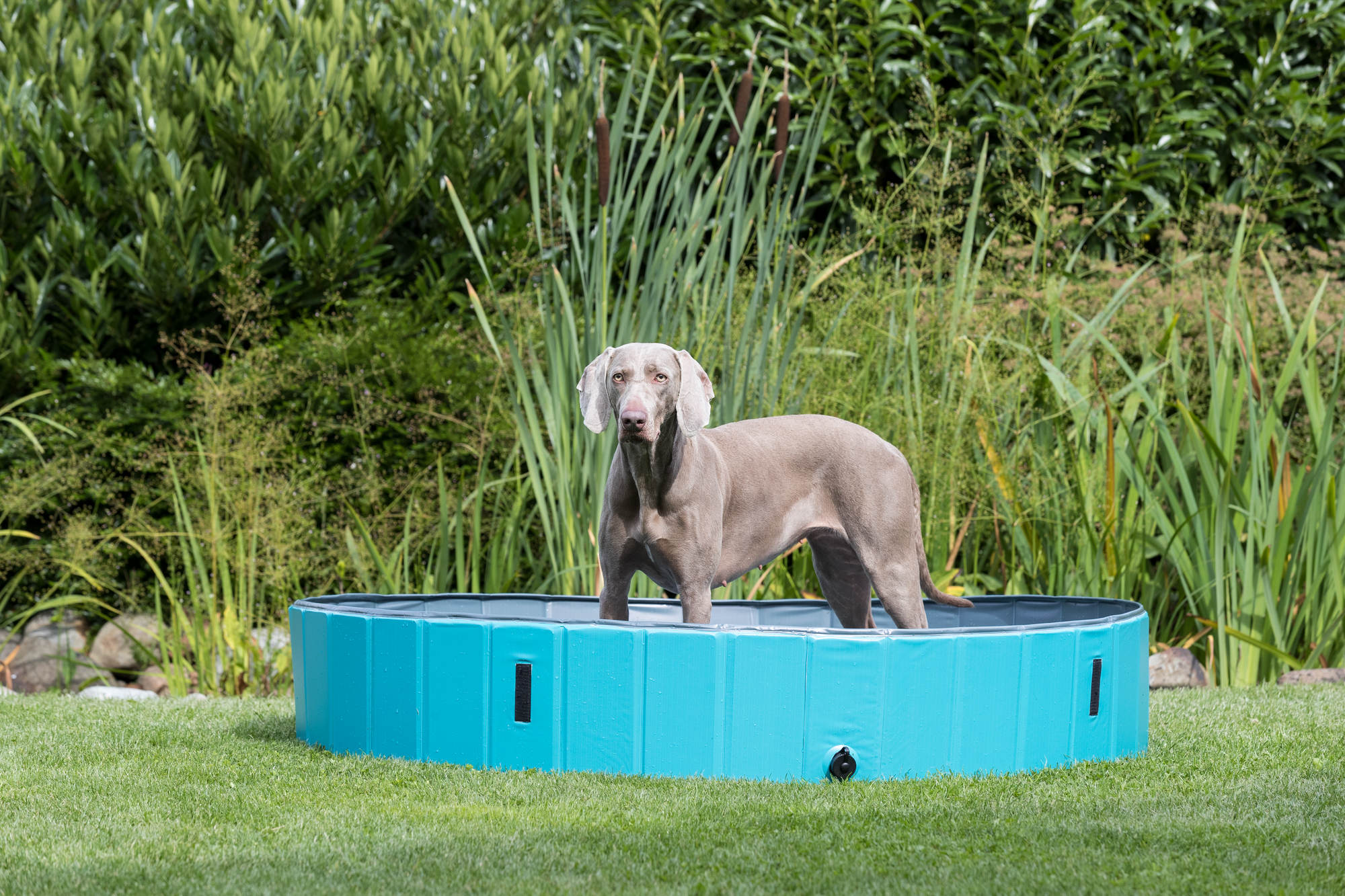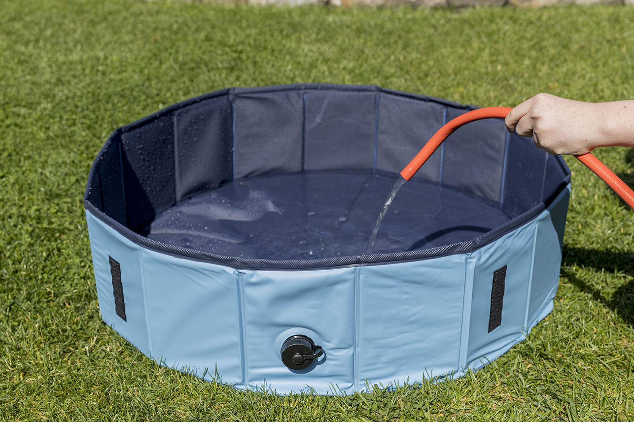 Give your dog a chance to cool off with The TRIXIE Splash Pool for pets. Easy to use, no inflation required. Unfold and fill with water for backyard fun. They are designed with scratch-resistant plastic and stable side walls. Easy to empty with a built-in drain valve. Folds for easy storage. The splash pool is also ideal for warm weather bath time.