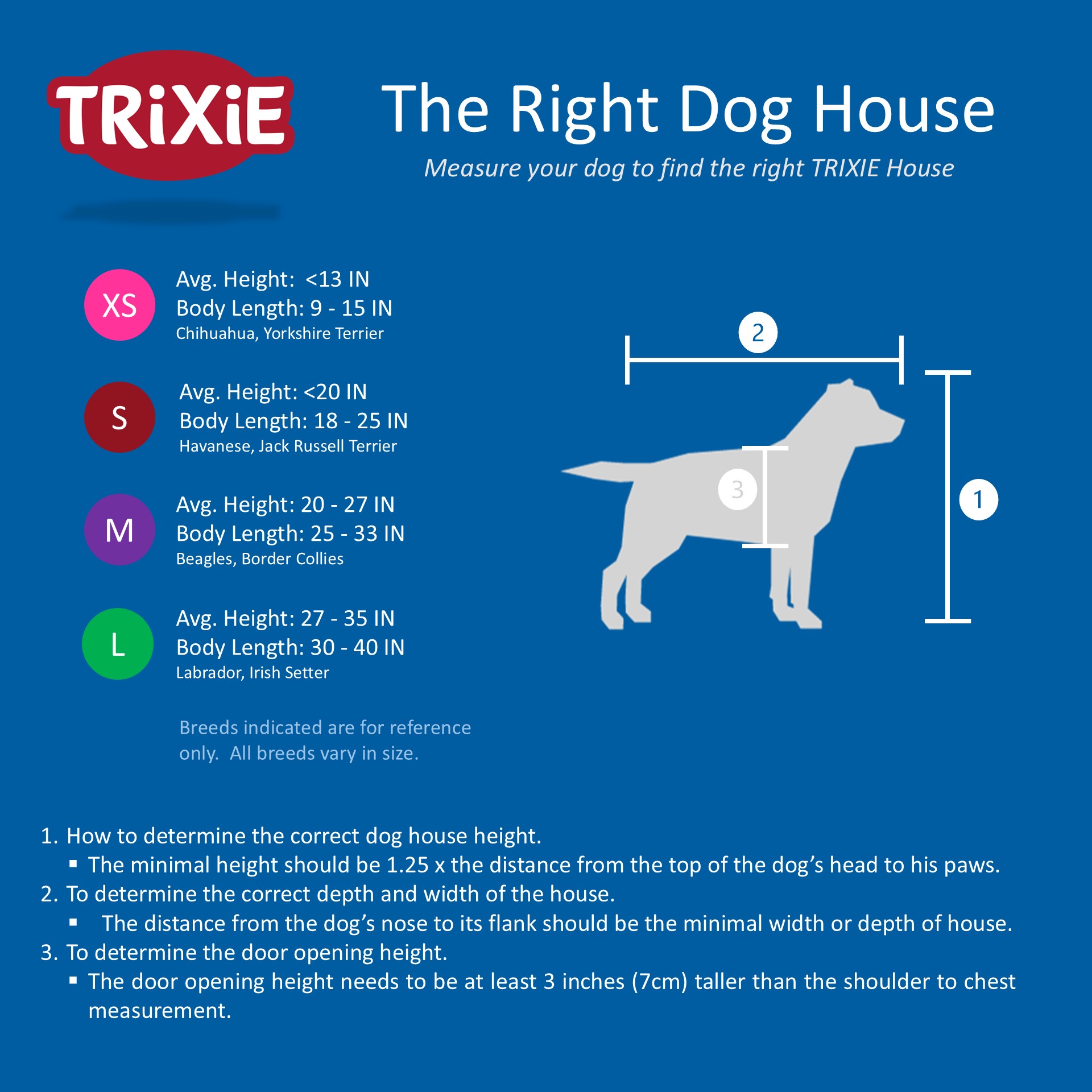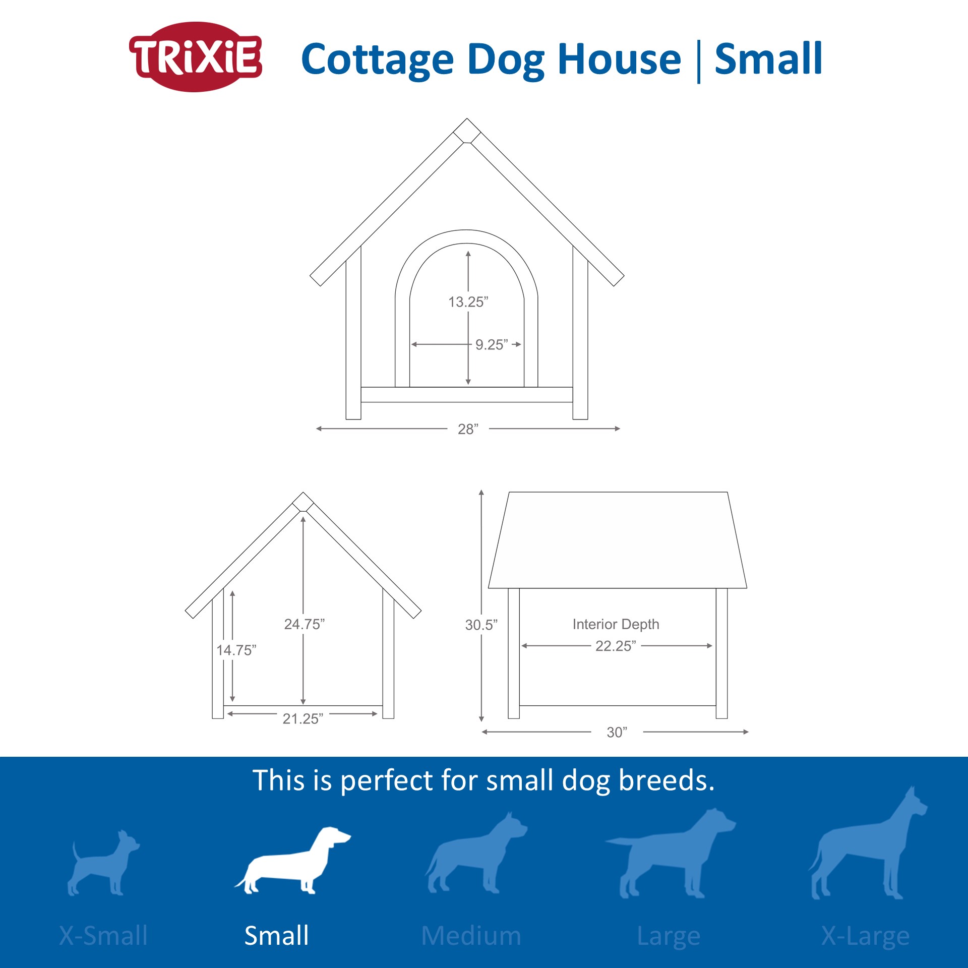 - DOG SHELTER: The TRIXIE natura Cottage is a small dog house for outside & a great place for your pooch to rest. Planned dimensions of 30 x 28 x 30.5 in, it’s suitable for smaller dog breeds up to 20 lbs