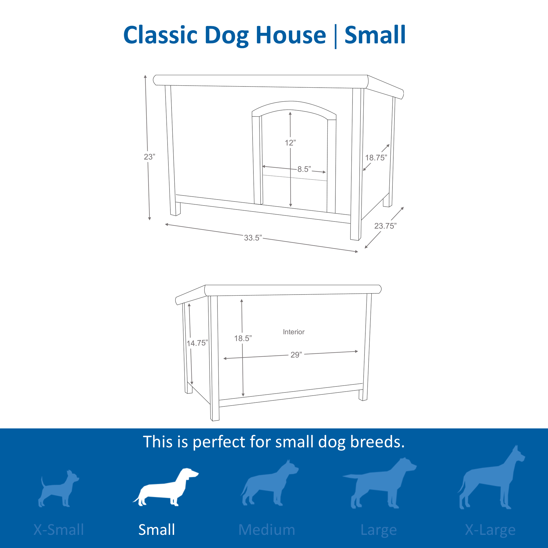 - DOG SHELTER: The TRIXIE Natura Classic is a small dog house for outside & a great place for your pooch to rest. With dimensions of 23.75 x 33.5 x 23 in, it’s suitable for smaller dog breeds up to 45 lbs