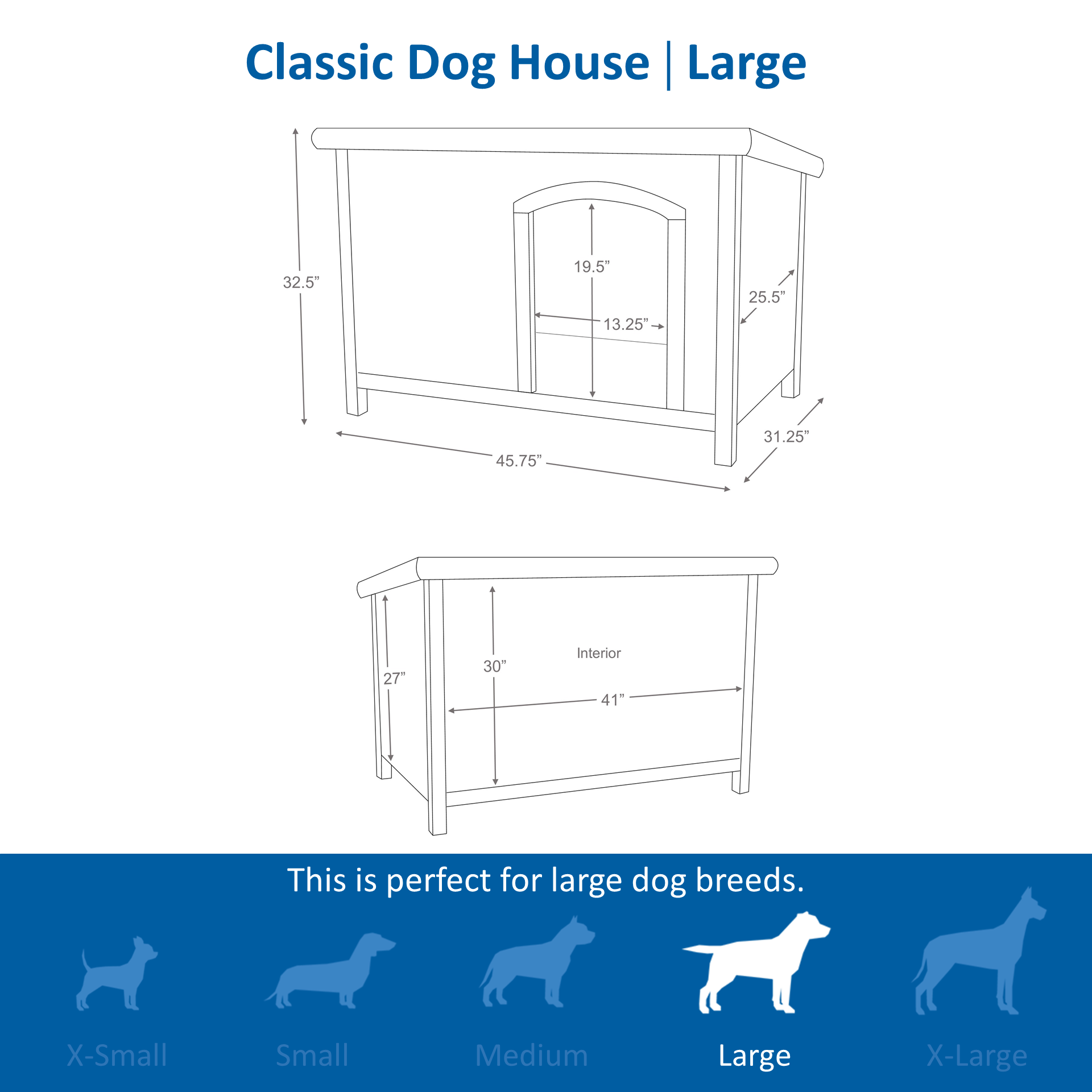 - DOG SHELTER: The TRIXIE Natura Classic is a large dog house for outside & a great place for your pooch to rest. With dimensions of 31.25 x 45.75 x 32.5 in, it’s suitable for large dogs up to 95 lbs