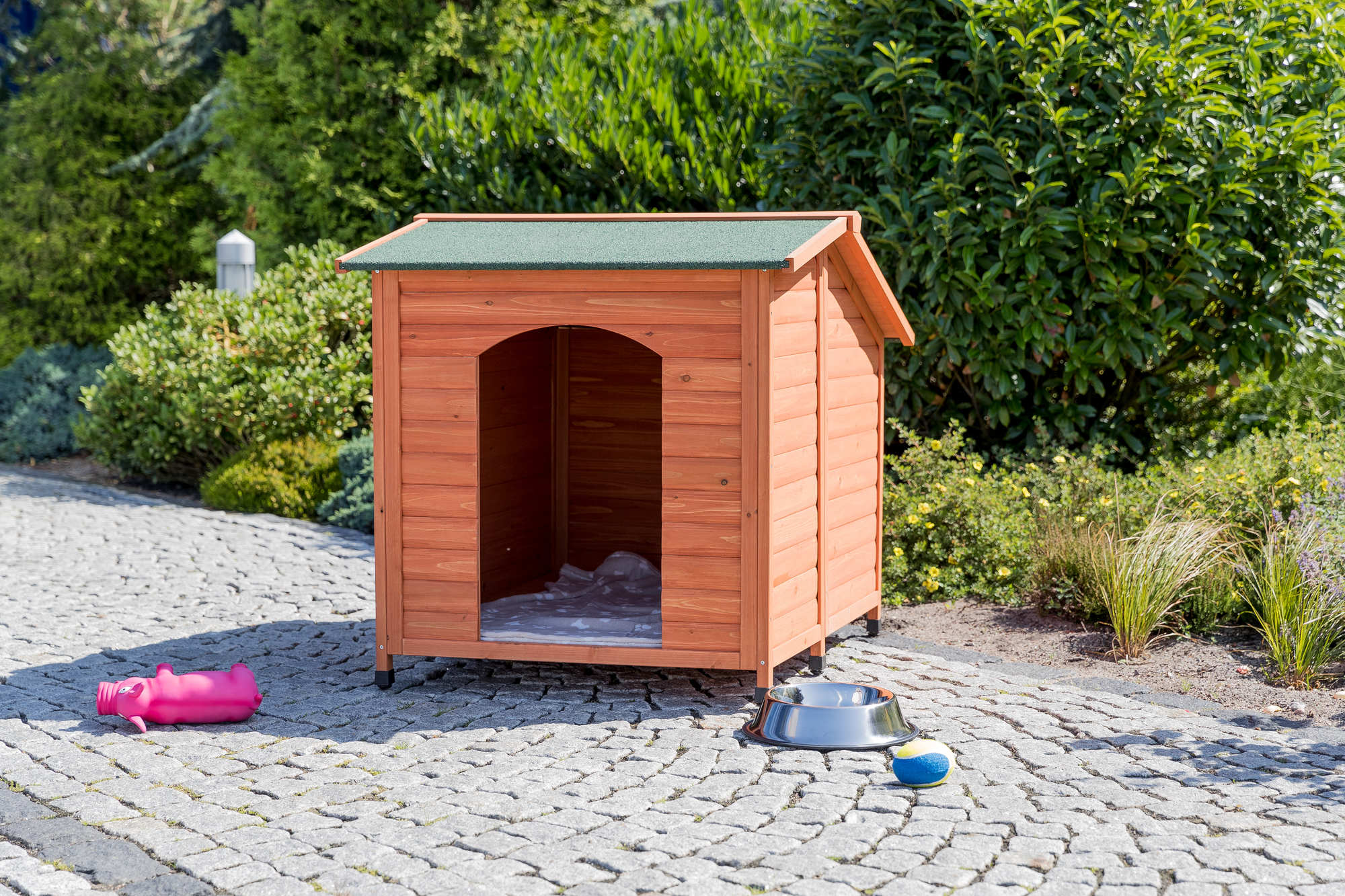 TRIXIE accompanies you and your pet from birth to senior age with suitable products – at home, when traveling, during play and sport. Give your furry friend a cozy shelter with the TRIXIE Natura Classic dog house. Whether you are looking for a suitable shelter for a large German Shepherd or a small Sheltie, TRIXIE has the right sized wood dog houses for your four-legged friend. Available in a variety of designs, colors & sizes, the TRIXIE dog shelter fits perfectly in any backyard. Constructed of weatherproof solid pine, the dog house is built to withstand the elements for years of outdoor comfort. With heavy-duty mineral roofing felt and a waterproof sealer, the real wood dog house offers ultimate protection against the weather. The elevated floor keeps your dog dry, while the removable floor panels make cleaning a breeze. Easy to assemble and adjustable for uneven surfaces, due to the additional hard-plastic footing. TRIXIE offers outdoor wooden dog houses in various designs, sizes, and colors, as well as matching accessories - find the right shelter for your dog.
