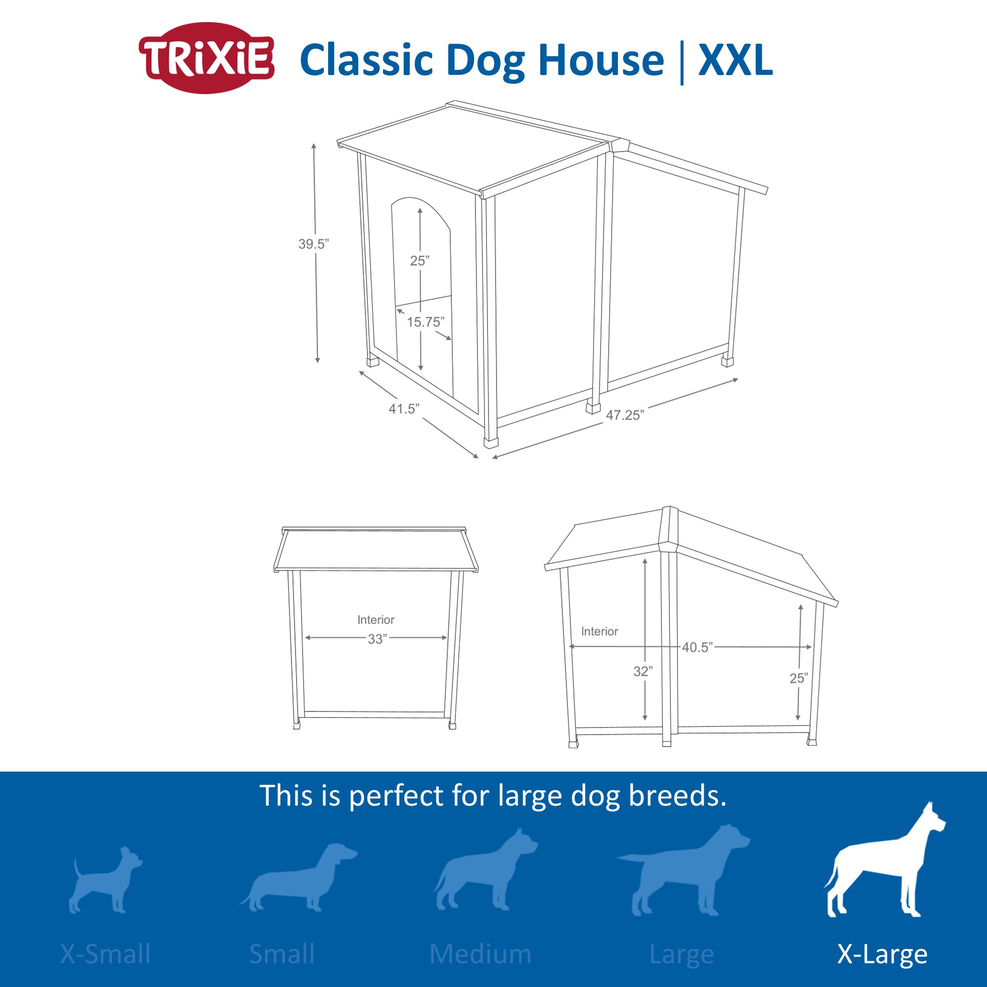 - DOG SHELTER: The TRIXIE Natura Cottage is an extra large dog house for outside & a great place for your pooch to rest. With dimensions of 41.5 x 47.25 x 39.5 in, it’s suitable for extra large dog breeds