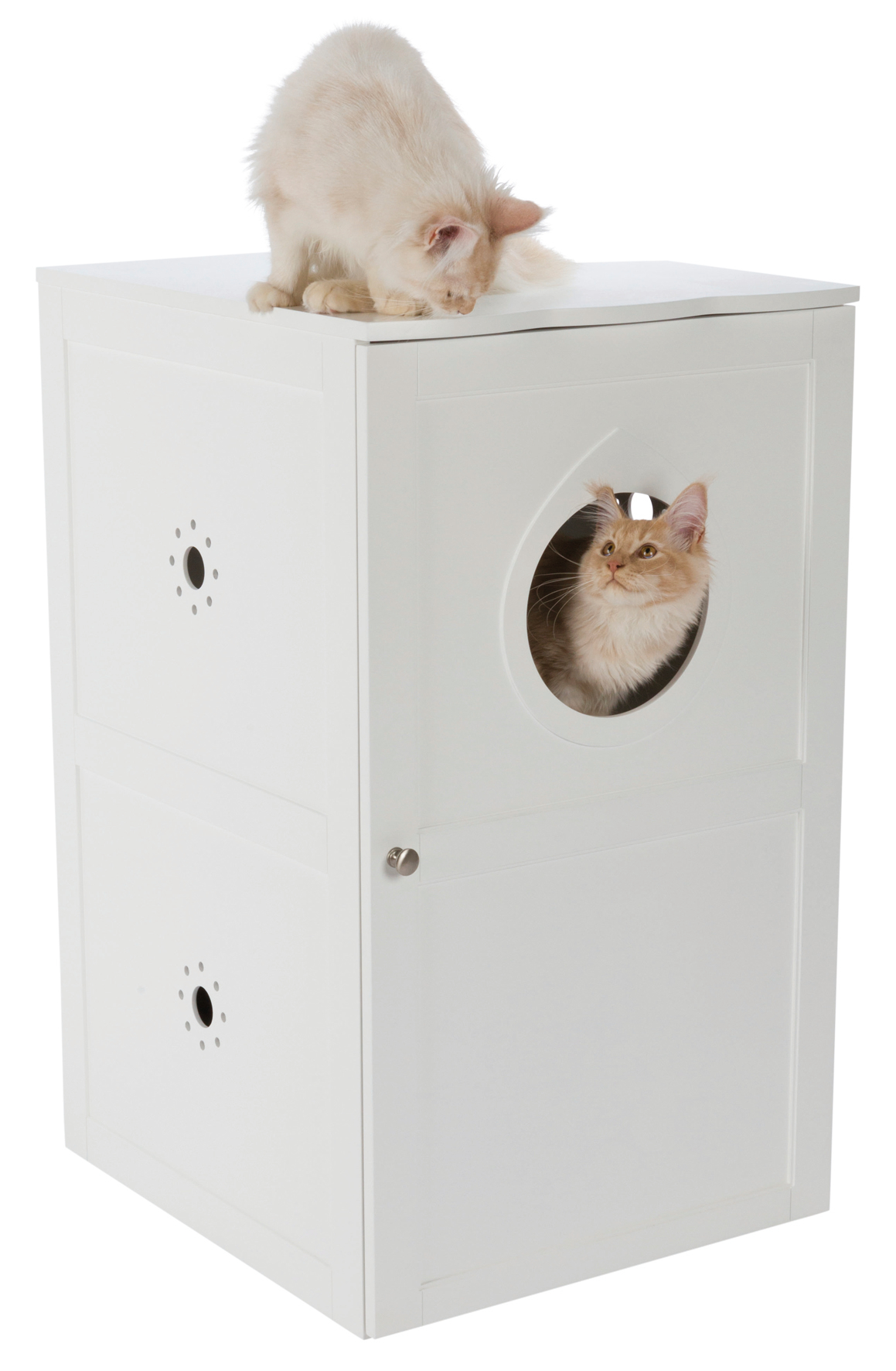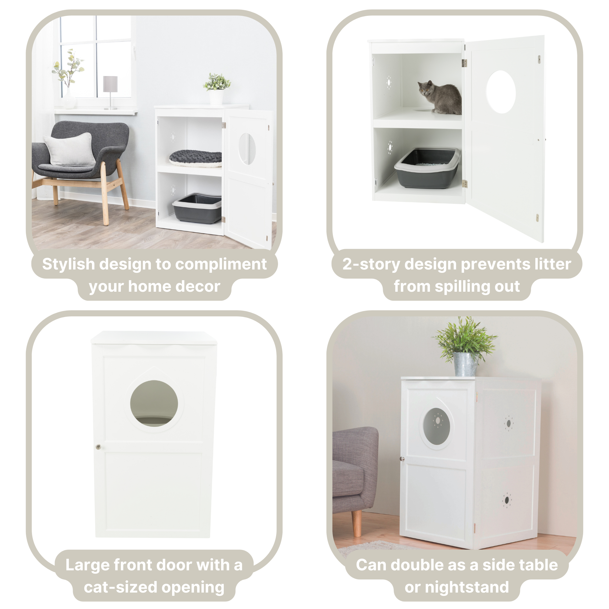 The TRIXIE 2-Story Litter Box Enclosure and Pet Home is the perfect solution to help keep your litter box stylishly concealed but easily accessible to your cats. The modern, sleek design will match any home’s décor. This multi-functional 2-story pet home can disguise your litter box or provide a cozy retreat. This enclosure features a large front door with a cat-sized opening, giving you and your pet easy access. Place the cabinet anywhere and use it as a nightstand or side table because it has a wide tabletop perfect for magazines, potted plants, lamps, coasters, and more. This cabinet top can hold up to 50 lbs.