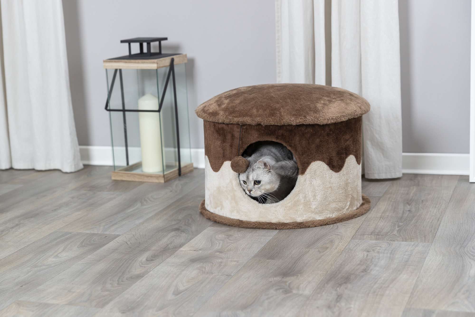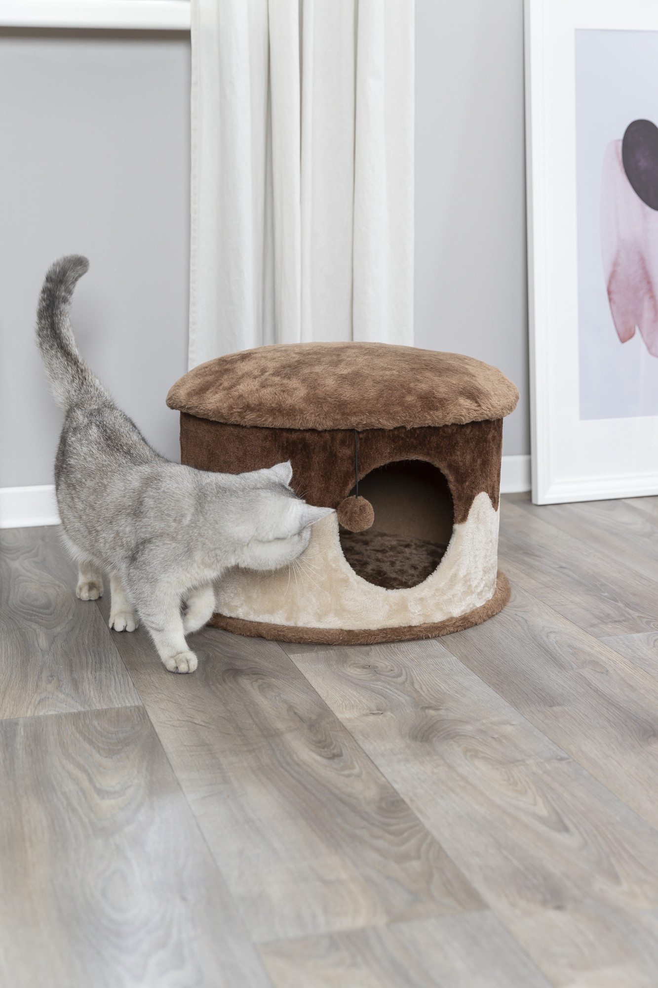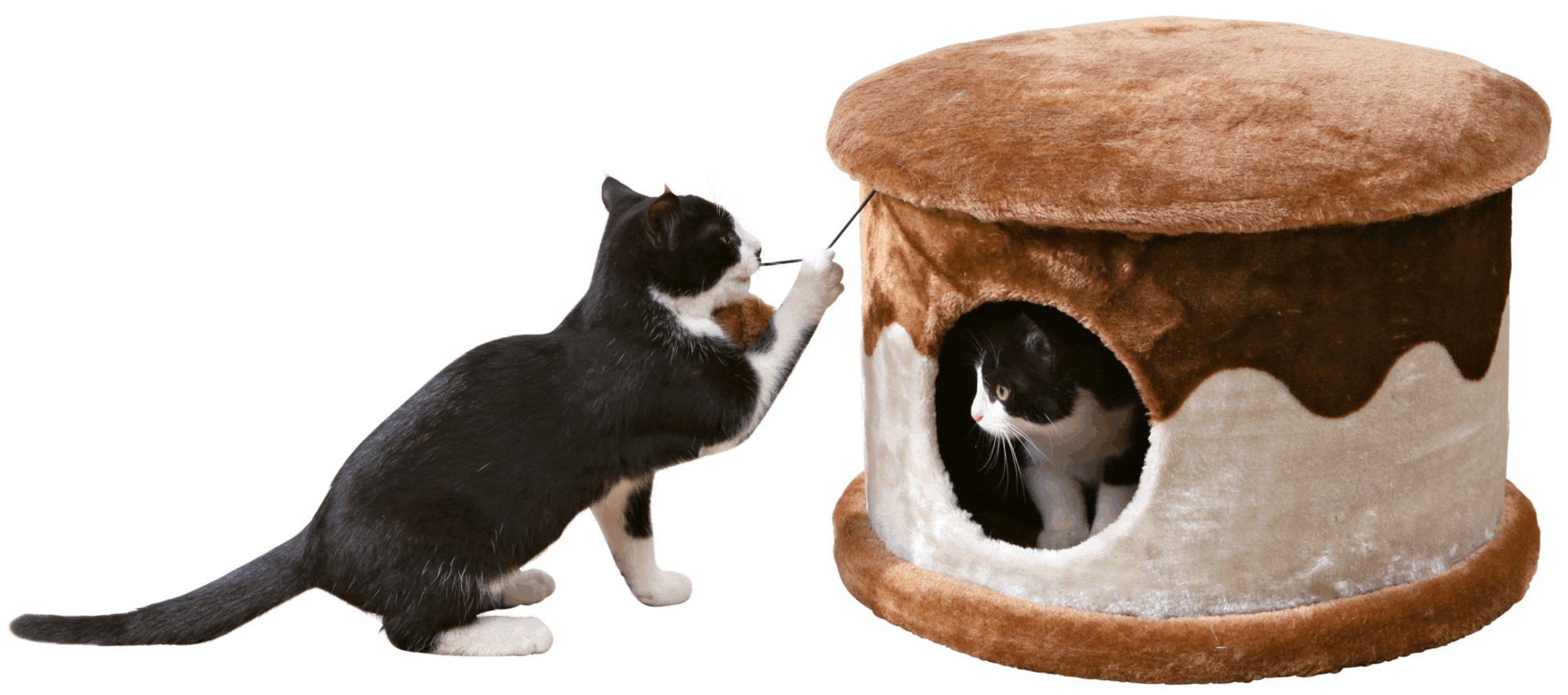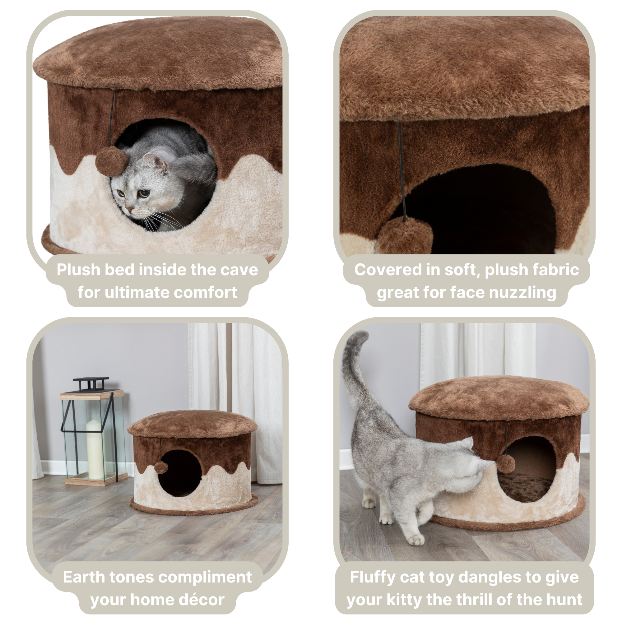 The TRIXIE Cozy Cat Cave will provide endless opportunities for cats to play, explore or just relax. This cat bed features a cozy kitty condo covered with plush fabric both inside and out, making it the perfect hideout. Your little hunter can also hide inside and lie in wait for unsuspecting prey to pass by or simply stretch out on top and enjoy the view. The solid construction is ideal for husky cats. There’s even a dangling pom-pom toy for your cat to bat about. The earth tones also make this piece of cat furniture easy to integrate into your home décor. Dimensions: 20 x 13 inches. Weight: 13 lbs. Suitable for all cats of all ages and activity levels. One-year warranty. Additional Dimensions: Condo opening: 5.5 inches.