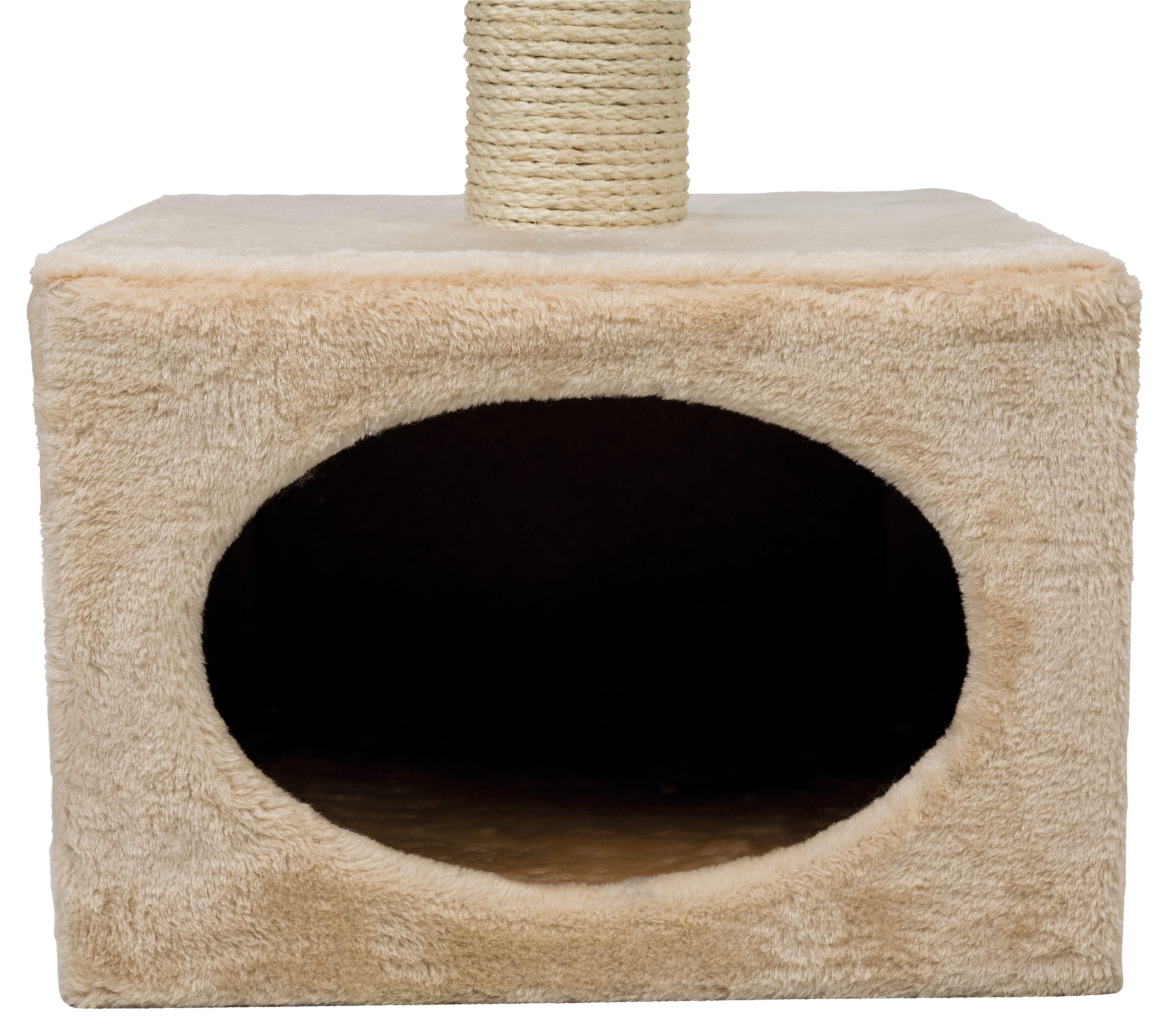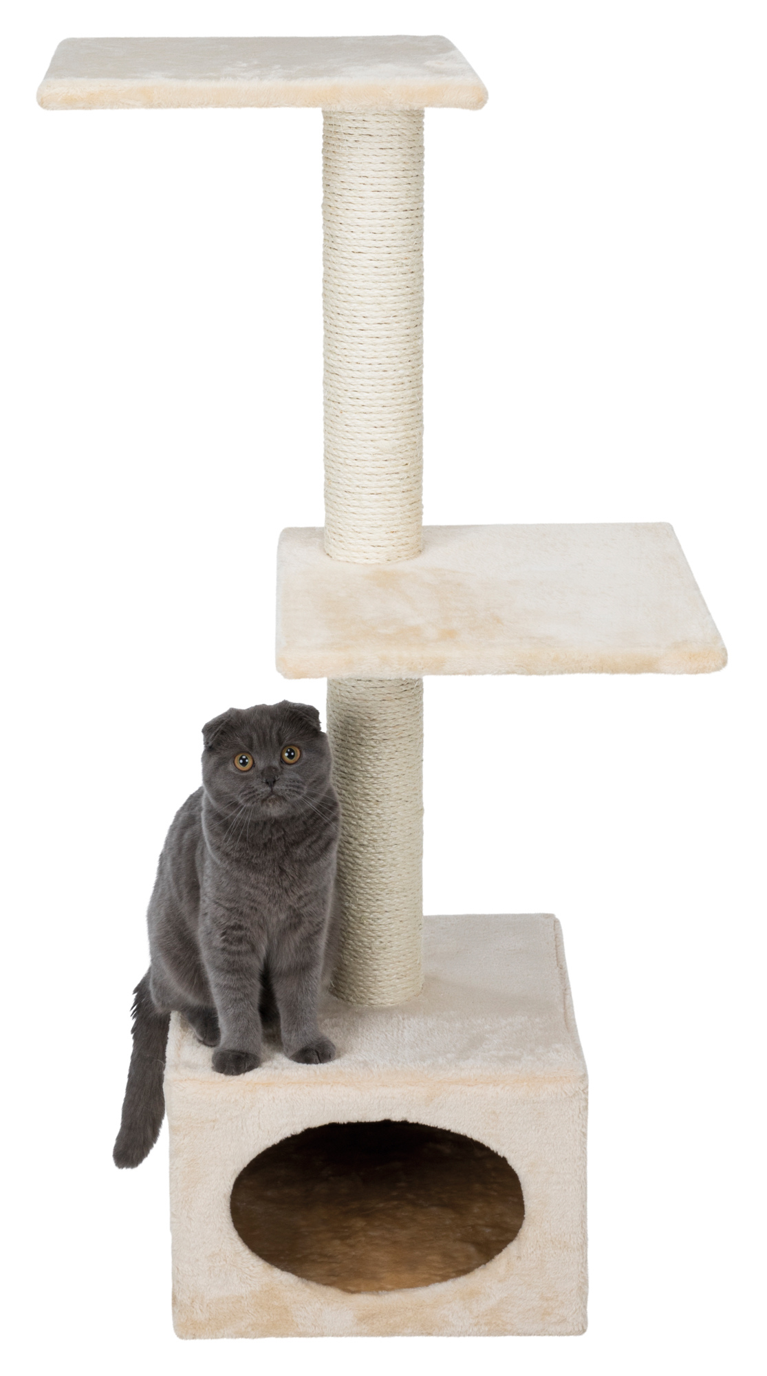 TRIXIE's Badalona Cat Tree will provide endless opportunities for cats to play, explore, scratch or just relax. Felines can sharpen their claws on any one of two scratching posts instead of on your furniture or carpet, giving them a healthy outlet for their scratching instincts. All posts are covered in durable sisal. If a nap or place to hide is in order, the cat can crawl inside the kitty condo base covered with plush both inside and out. Your sweet kitty will fall fast asleep as she sinks into the extra thick plush covered floor, making it the perfect retreat. Feeling a little spunky? Jump, climb or perch atop one of two plush covered platforms and lie in wait for unsuspecting prey or simply enjoy the view. The subtle fresh tones of the sisal and plush fabric also make this piece of cat furniture easy to integrate into your home décor. Suitable for cats of all ages and activity levels. One year warranty.