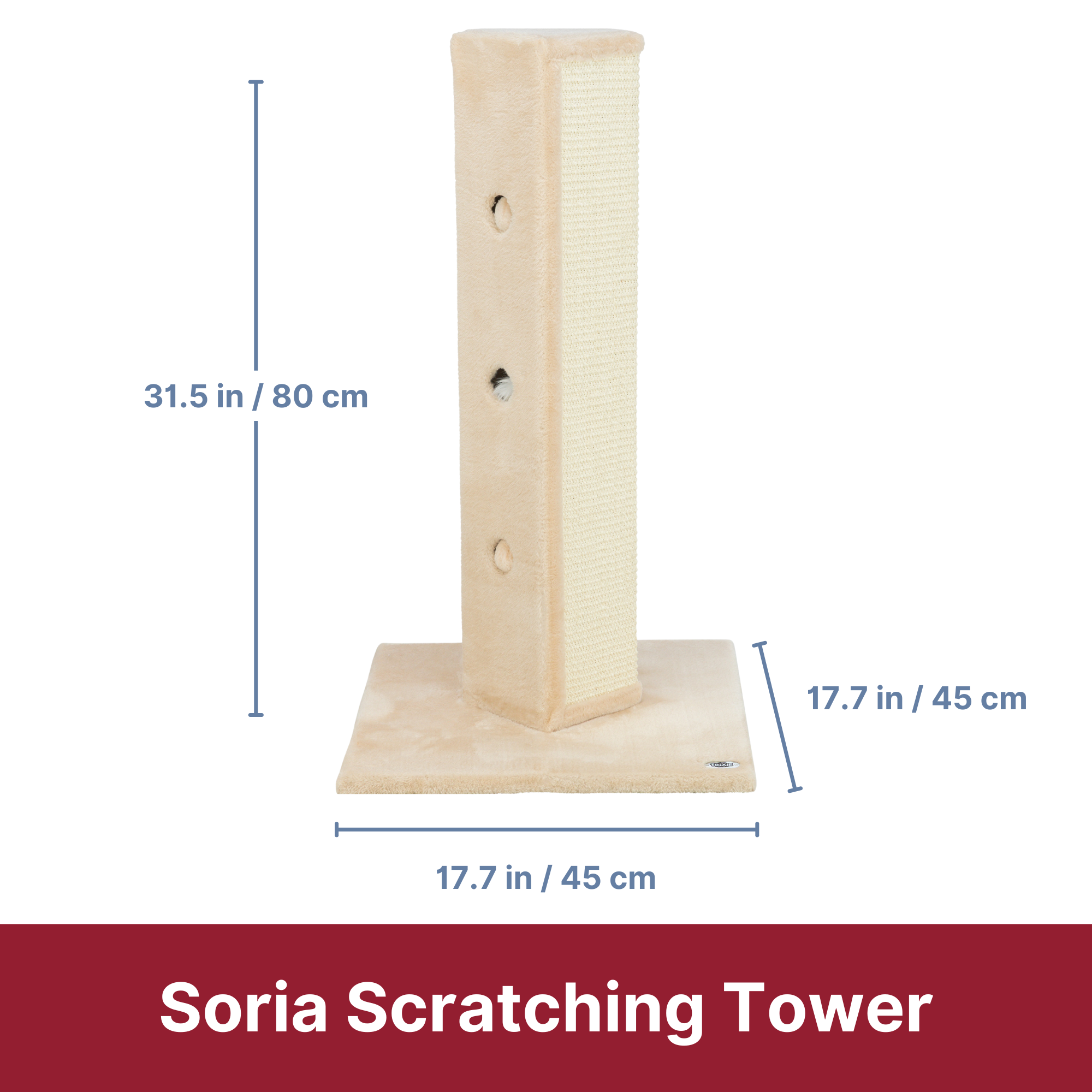 The TRIXIE Soria Scratching Post gives your cats plenty of opportunities to scratch and explore. The unique square design provides 3 sides covered in durable sisal for a safe scratching option. The 4th side is covered in soft Plush allowing for quality face rubbing and nuzzling. The plush side has Peek-a-Boo openings which reveal playful surprises which gives your kitty the thrill of hunting.