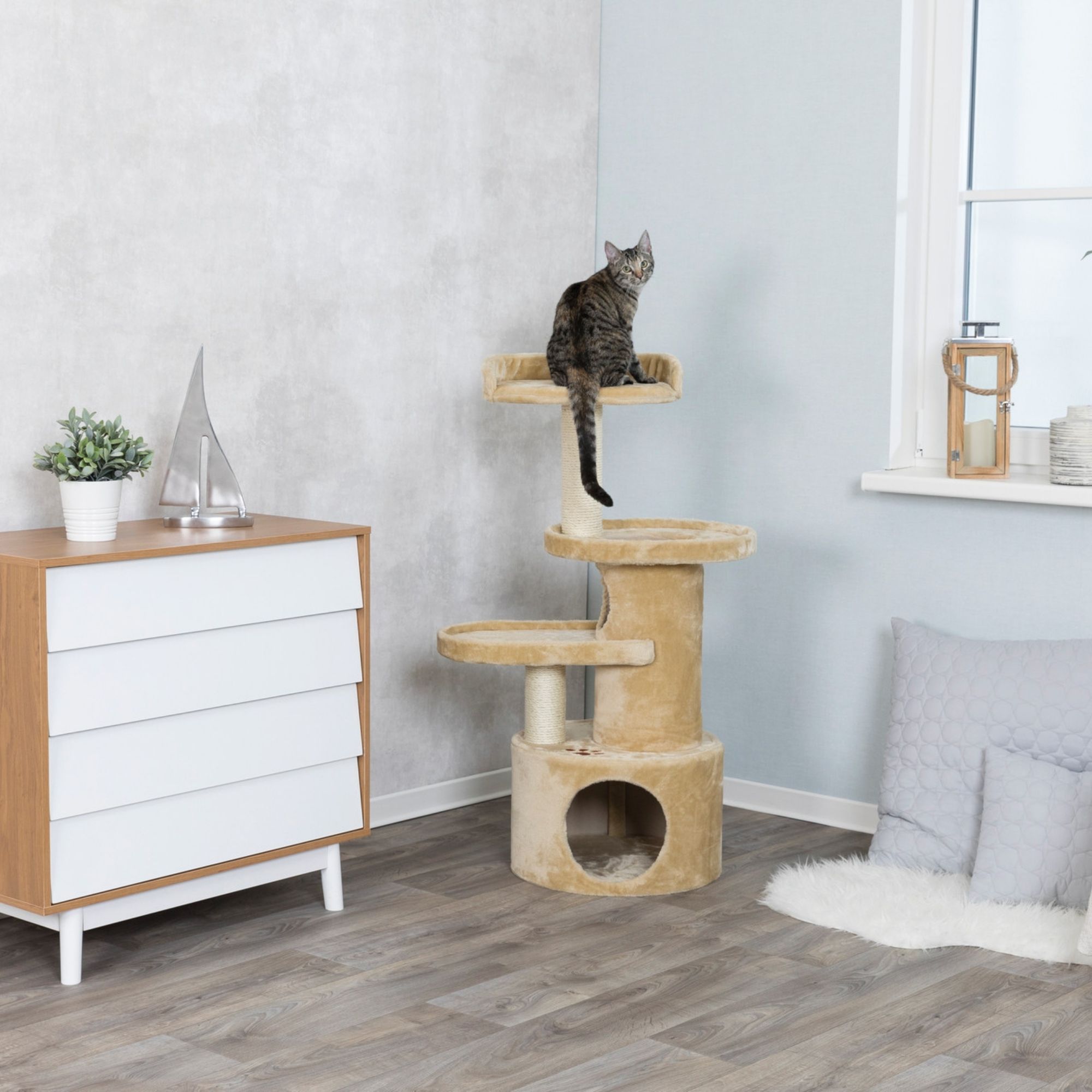 The TRIXIE Oviedo Cat Tree will provide endless opportunities for cats to play, explore, scratch or just relax. Felines can sharpen their claws on two scratching posts instead of on your furniture or carpet, giving them a healthy outlet for their scratching instincts. All posts are covered in durable sisal. If a nap or a place to hide is in order, the cat can crawl inside the kitty condo or tunnel. Both are covered with plush both inside and out, making them the perfect retreat. Feeling a little spunky? Jump, climb or perch atop one of the three plush platforms and lie in wait for unsuspecting prey or just enjoy the view. We’ve also provided multiple ways in and out so your feline can sneak in one way and pop out another for added adventure. The top platform even features a supportive backrest and plush padding for extra comfort. The subtle earth tones of the sisal and plush fabric also make this piece of cat furniture easy to integrate into your home décor. Dimensions: 11 x 19 x 41 inches. Weight: 30 lbs. Suitable for cats of all ages and activity levels. Additional Dimensions: Condo base 18.5 x 11 in; 2 scratching posts 3.5 x 7.75 and 3.5 x 11.75 in; 1 tunnel 7.75 x 17.25 in; 2 platforms 11.25 x 12.5 and 11.75 x 15.75 in; 1 padded platform with back 18.5 in.