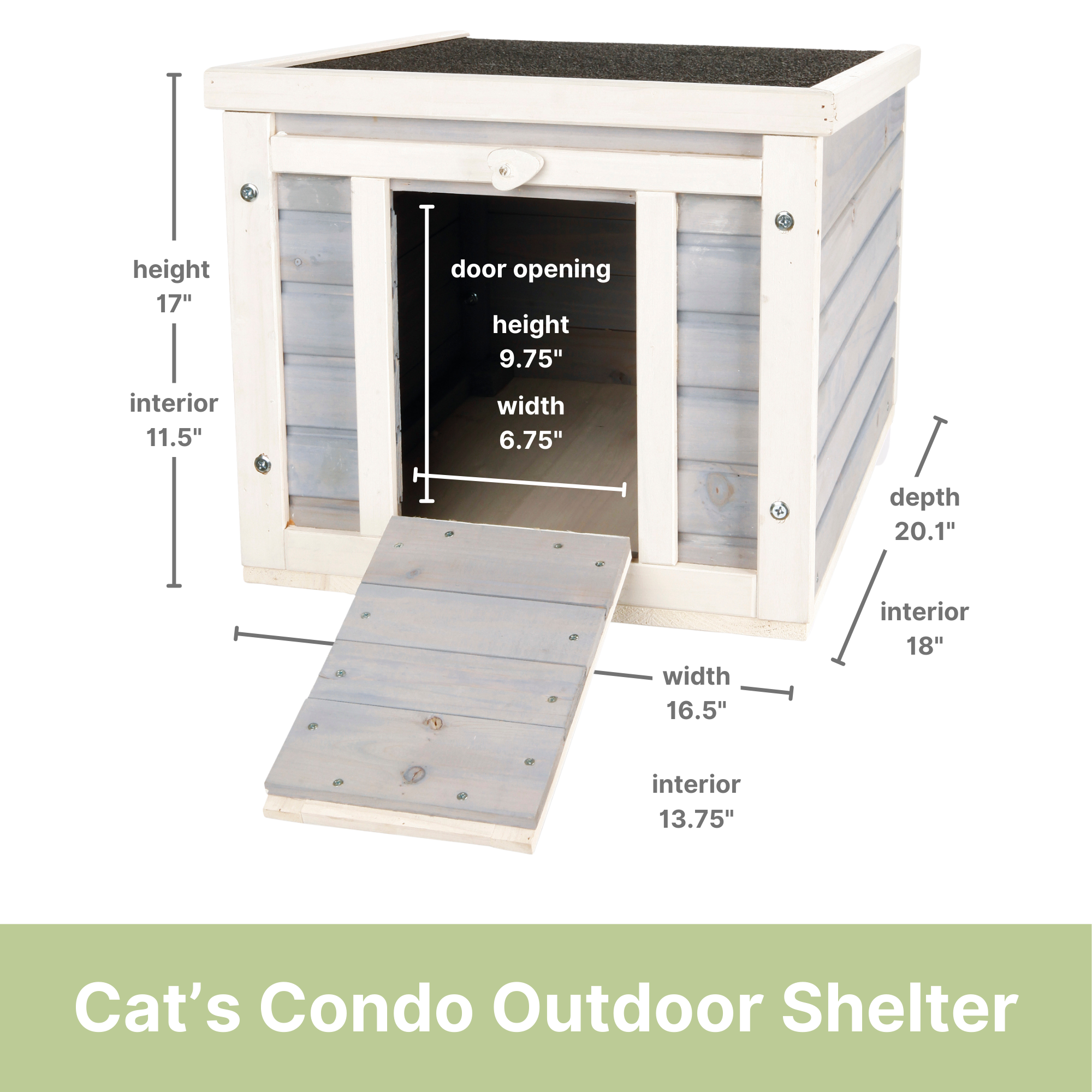 - CAT HOUSE DIMENSIONS: Overall - 20.1"L x 16.5"W x 16.9"H; Interior - 13.75" W x 18"L x 11.5"H; Door Opening: 6.75"W x 9.75"H