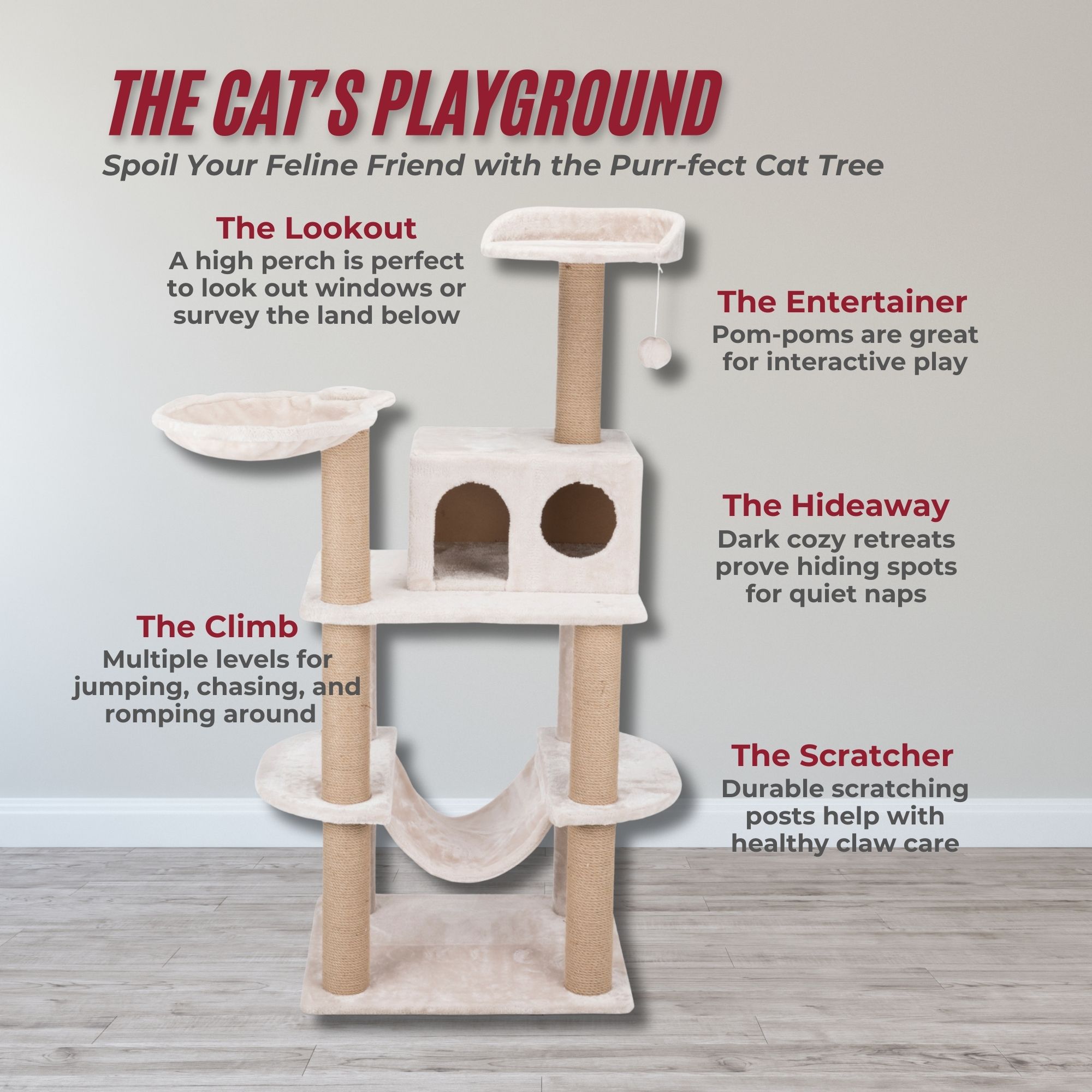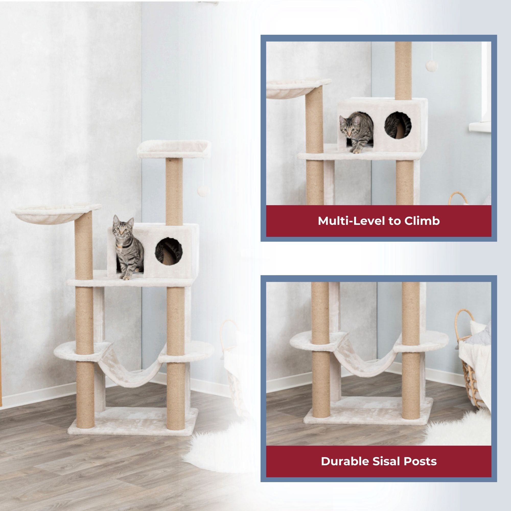Keep your cat endlessly entertained with the TRIXIE Federico Scratching Post!! This designated pet play area features a ton of super fun and interesting activities for your favorite furball. The tall ensemble comes with a ball on a string for pawing at, to mentally stimulate for hours of entertainment as well as many perches to observe the room from various heights, along with several sisal posts for cats to sink their sharp claws into. When your kitty is done with playtime, they can get some R&R in the luxurious plush lined condo which features 2 openings. This is the perfect playground for multiple cats or the one king or queen of the castle!