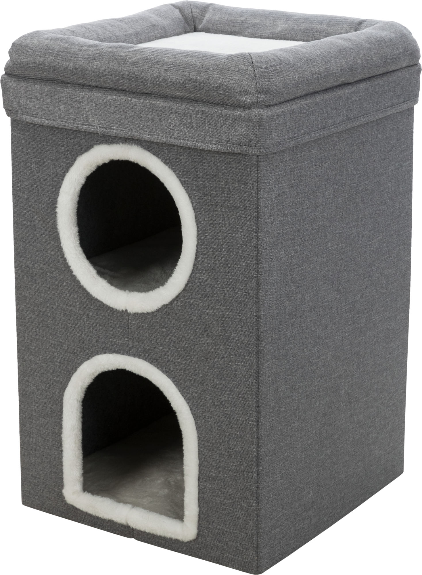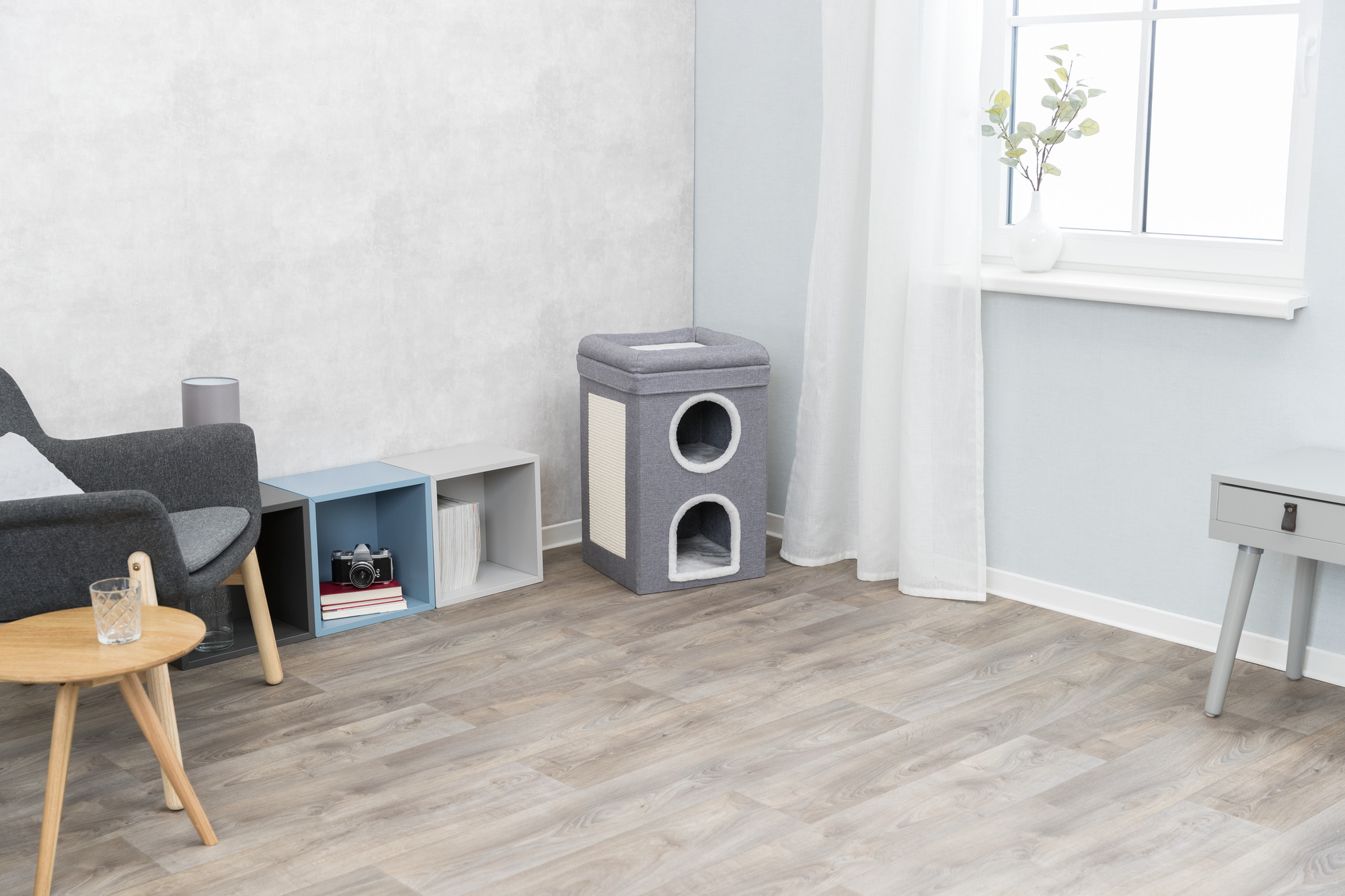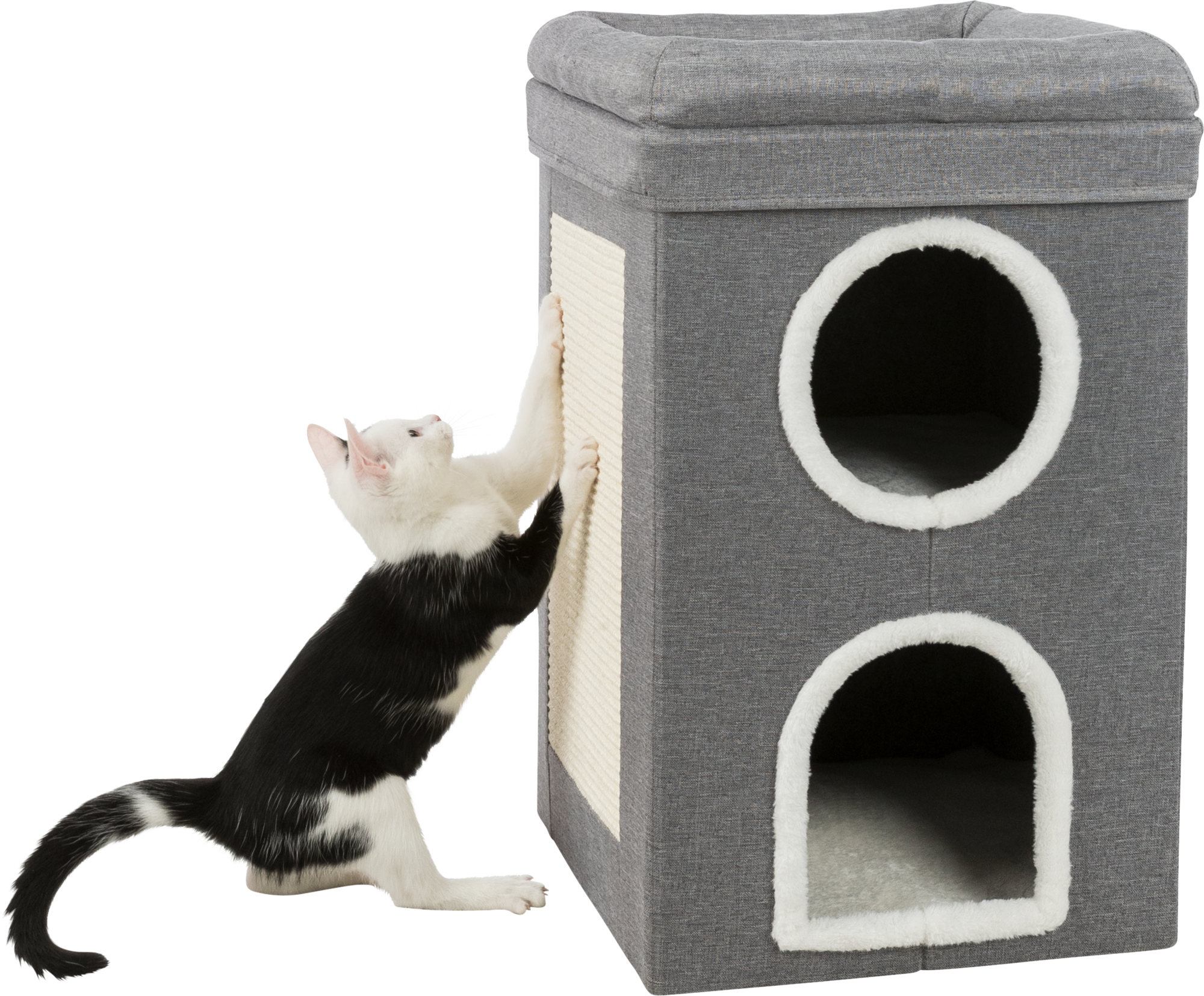 The TRIXIE Saul Cat Condo will fulfill your cat’s instinctive need for play and rest. This attractive, 3-tier kitty cube features an elevated plush lounging bed with soft bolster sides. The large sisal pad gives your kitty a healthy outlet for their scratching instincts; they can exercise their paws on sisal and save your furniture. If a nap or a place to hide is in order, there are two cozy hide-away coves with large entries providing safety and security while your kitty naps in comfort. The interior plush liners remove easily for spot cleaning and allow the cube to be folded flat for convenient storage.