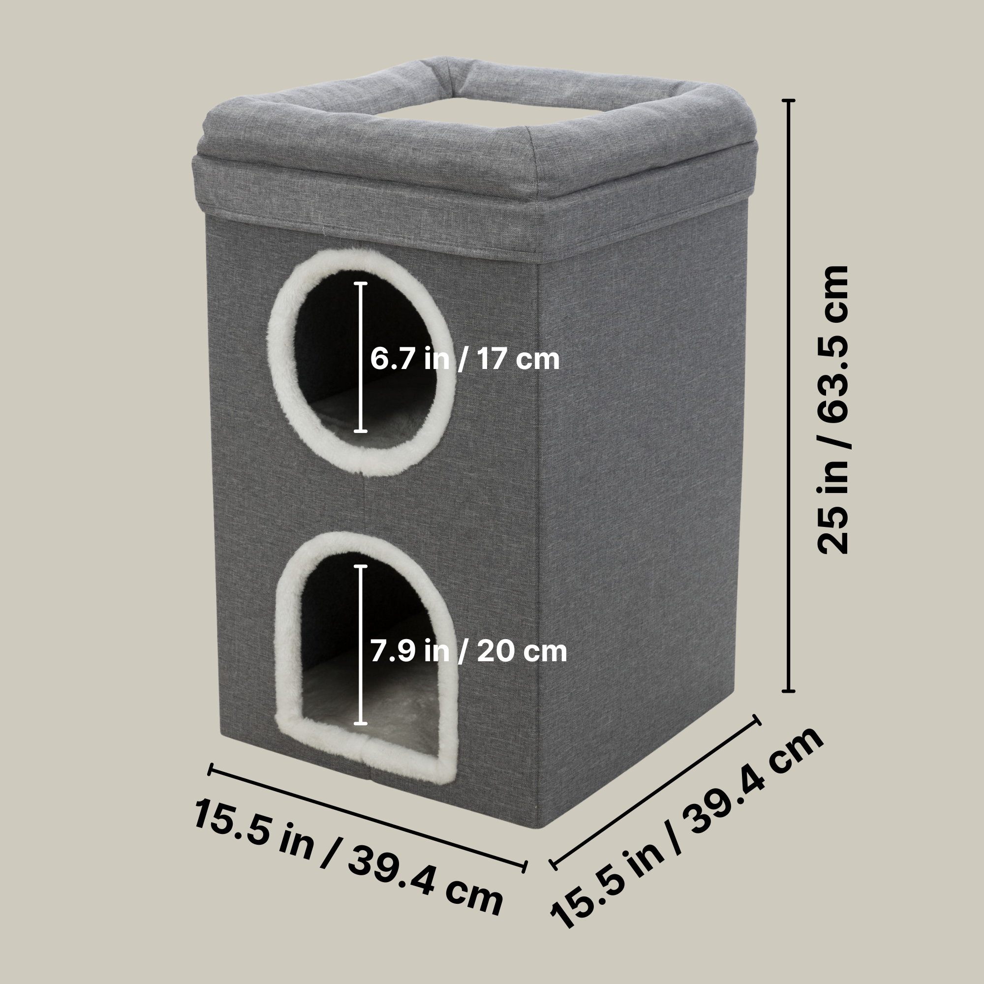 - 2 Cozy Condos - cats love nothing more than to snuggle up after playtime; the plush lined condos provides maximum comfort for your furry friend to peacefully relax, lounge, or nap