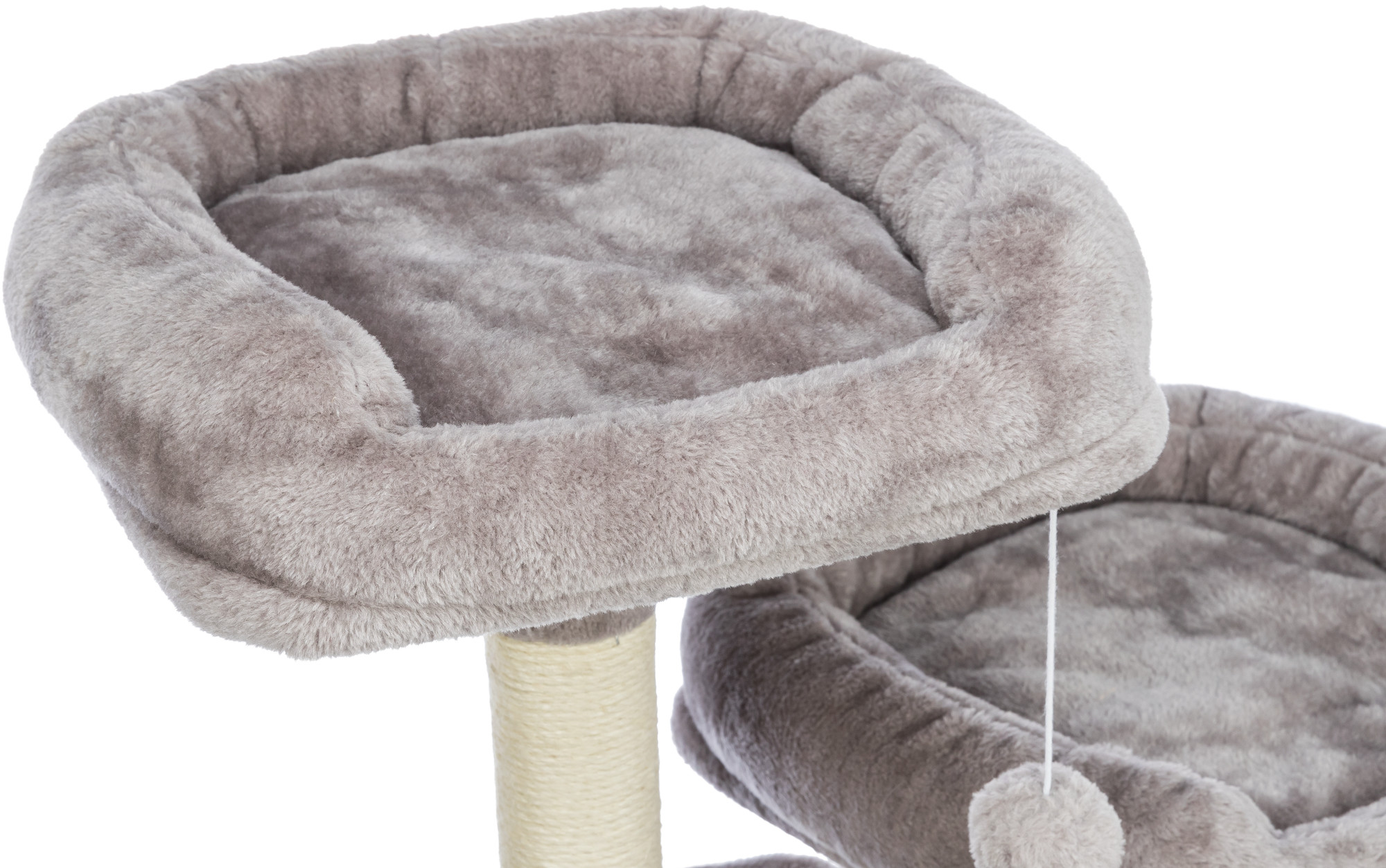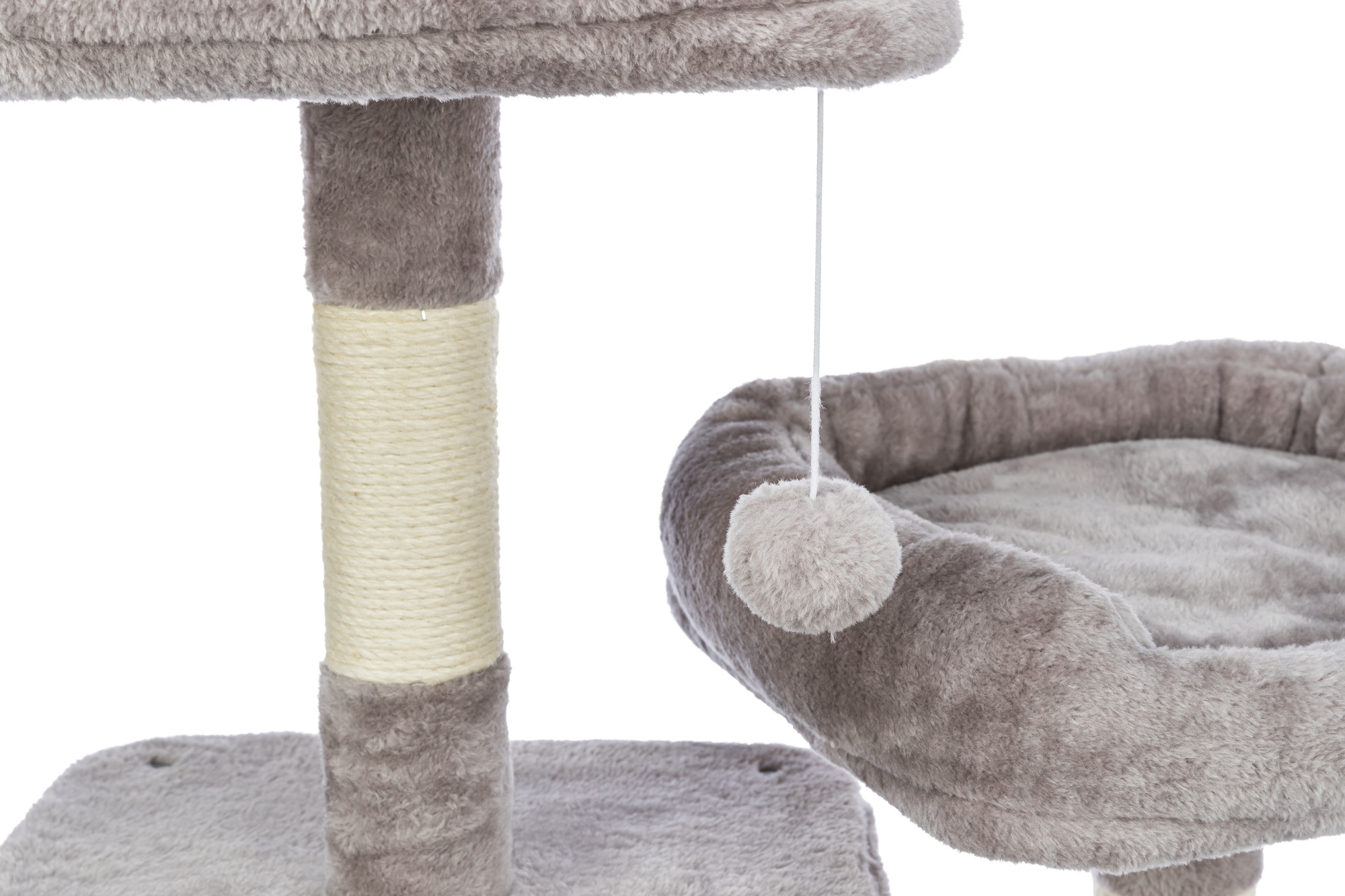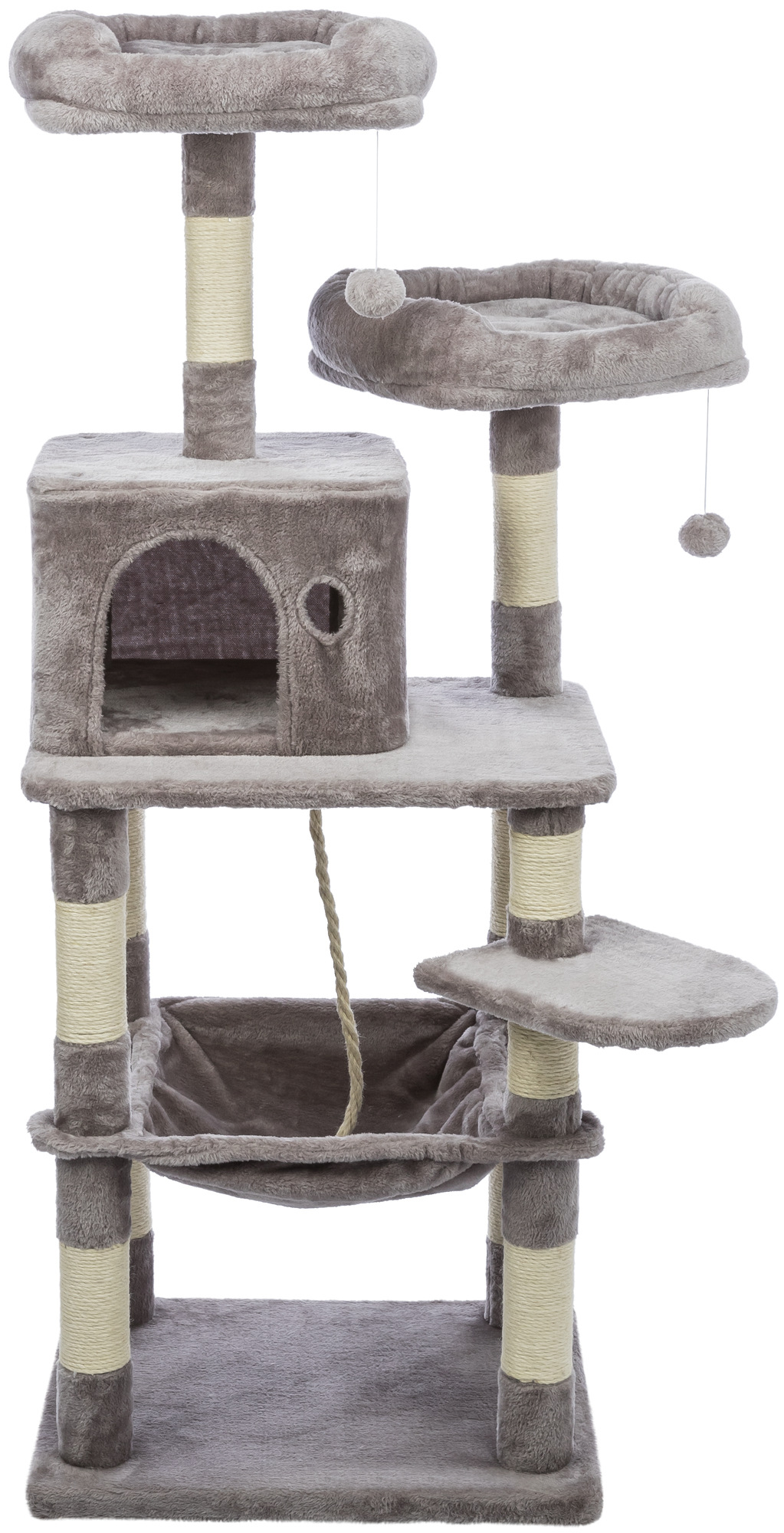 TRIXIE Eduardo Cat Tree provides endless opportunities for cats to climb, jump, scratch, nap and relax. It is no secret cats sleep a lot; the Eduardo offers multiple places for your energetic buddy to recharge and retreat. She can curl up in a cozy condo, sink down into a soft hammock, or perch atop 2 platform beds with padded sides for extra comfort for naptime. Posts are covered in durable jute for a healthy outlet to sharpen and clean their claws, and plush fabric for when it is time for a good face rubbing and nuzzle. If your feline is feeling a little spunky, she can jump atop the tower to perch upon a soft comfortable cushion as she lies in waits for unsuspecting prey to pass by, or simply enjoy the view. For playtime, we added 2 cat toys on strings to give your kitty the thrill of the hunt as she bats and swats it back and forth: providing mental stimulation and fun entertainment. Suitable for cats of all ages and activity levels.
