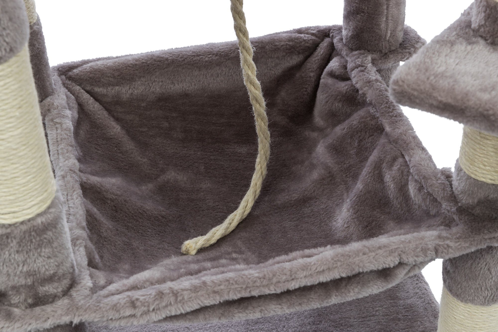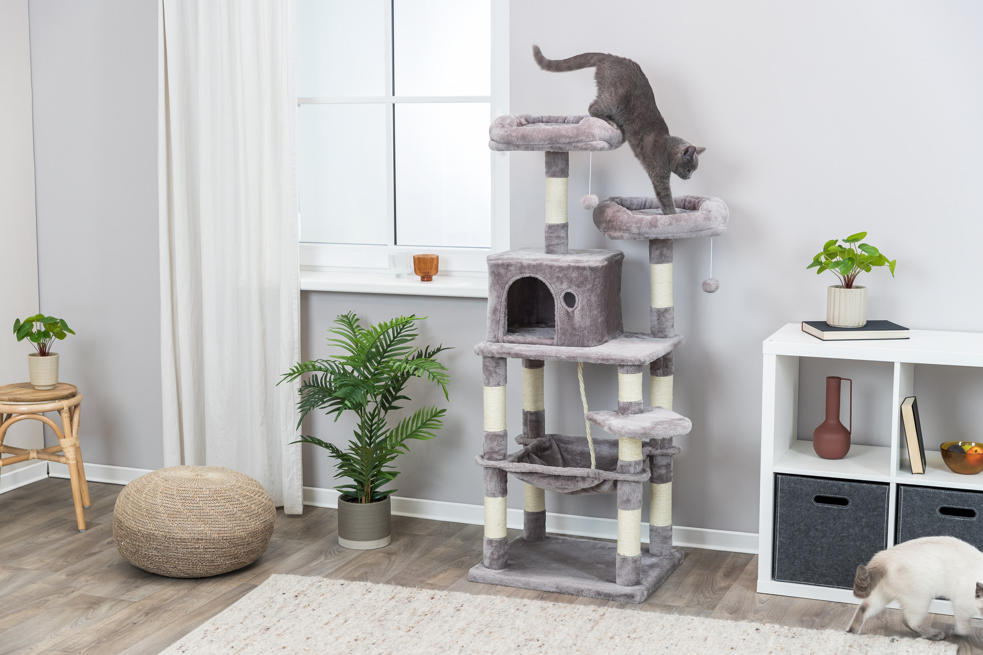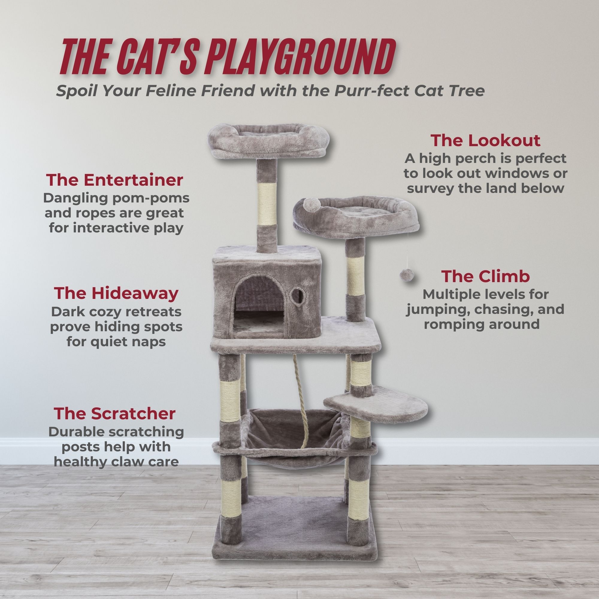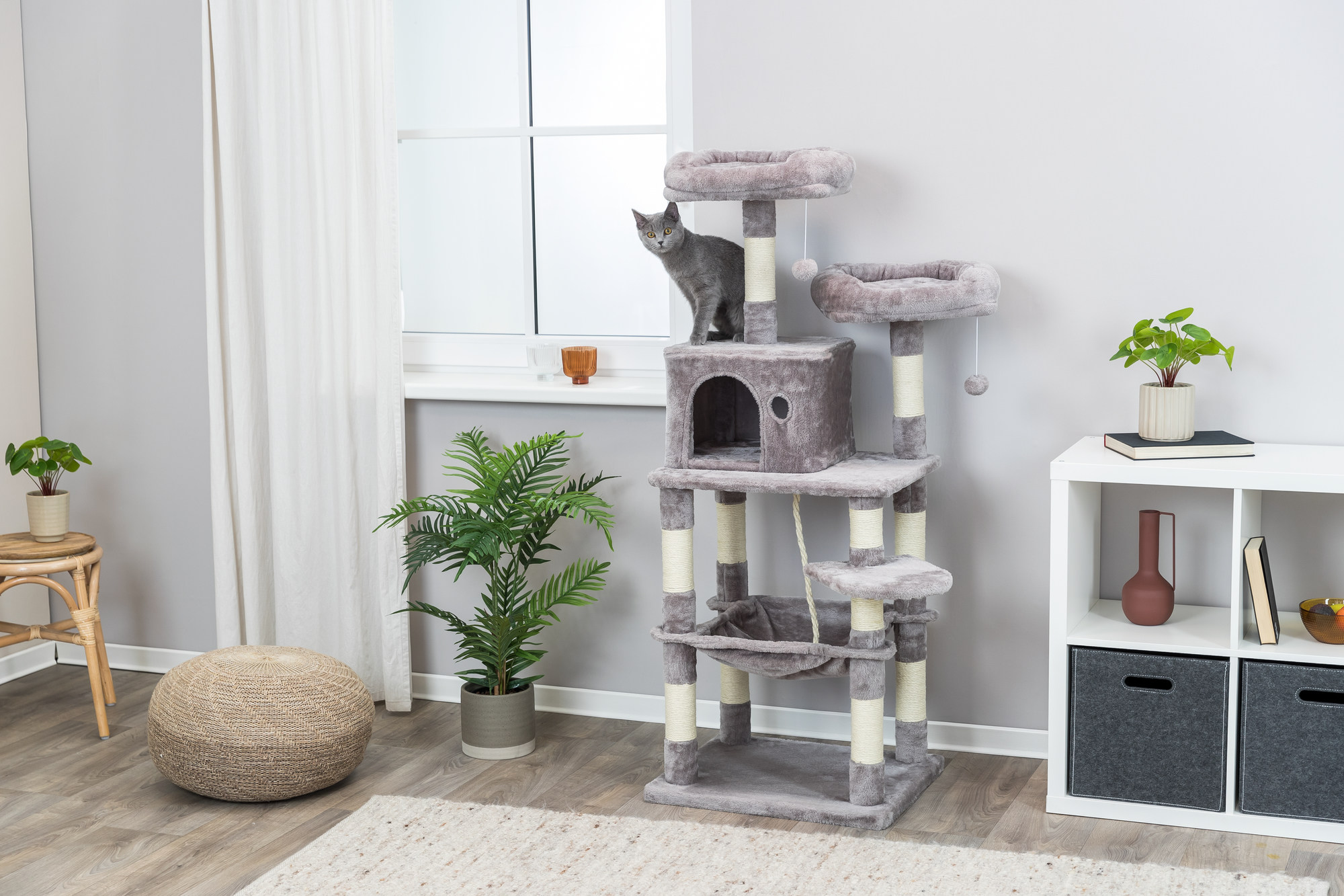 - Cats love a stimulating environment! We have provided 2 dangling pom-poms, jute play rope, and a peek-a-boo cutout to satisfy their natural curiosity and provide challenges and entertainment