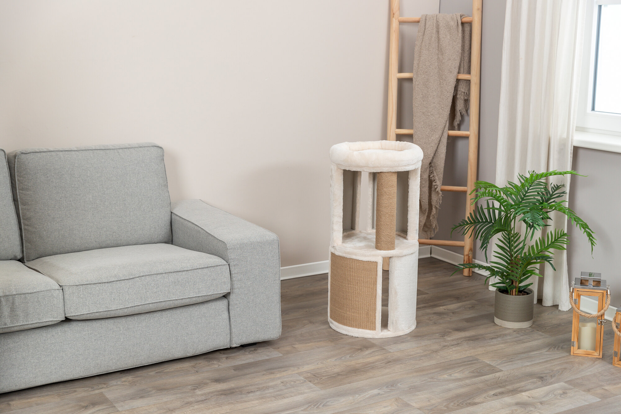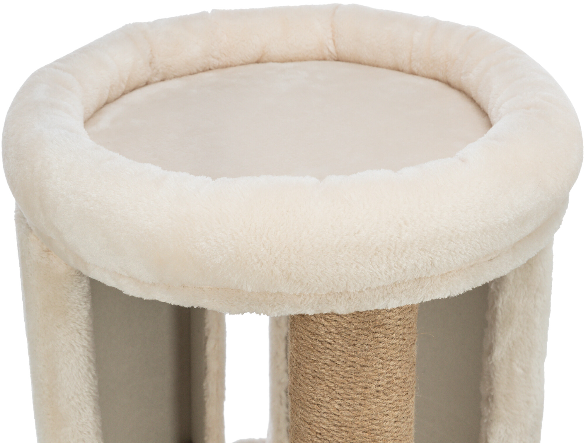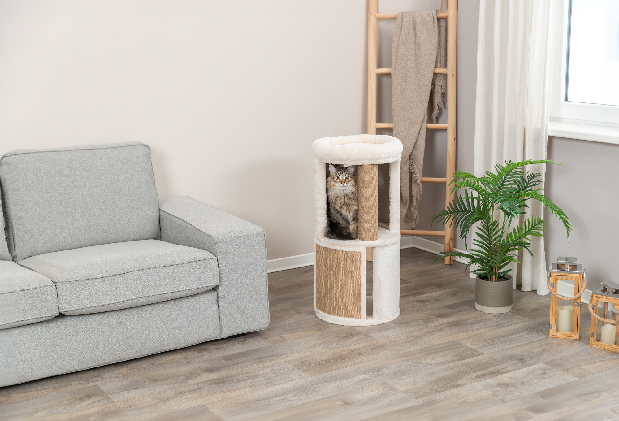 Your cat will adore the TRIXIE Giorgia Cat Tower! This two-story cat tower features two sturdy scratching posts covered in natural jute, two cozy fleece-lined caves, and a comfortable bed on the top platform. The scratching posts are durable and sturdy, giving your feline friend the perfect surface to sharpen their claws. With multiple levels of enjoyment, this medium-sized 32.5" cat tower offers an ideal hiding spot for your kitty in the cozy caves or lounging space on the top platform's padded bed. You can rest assured that your cat is happy and secure while they get plenty of exercise by jumping, stretching, and sleeping on this fantastic piece of cat furniture. This multi-level cat tree is easy to clean by spot-washing with a damp cloth and vacuuming it when needed.