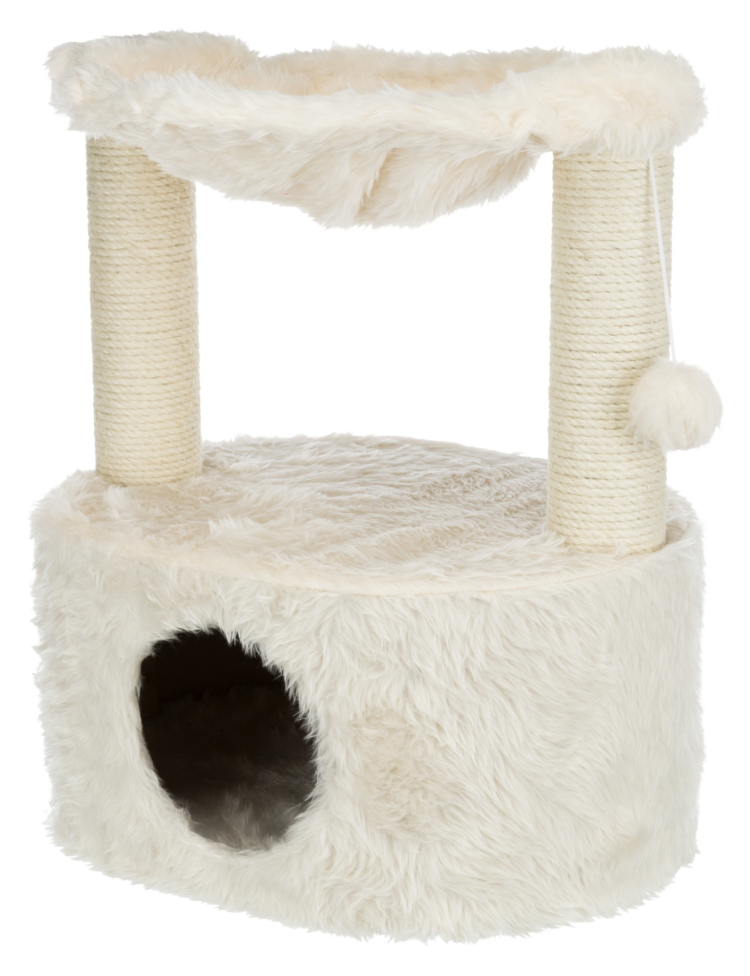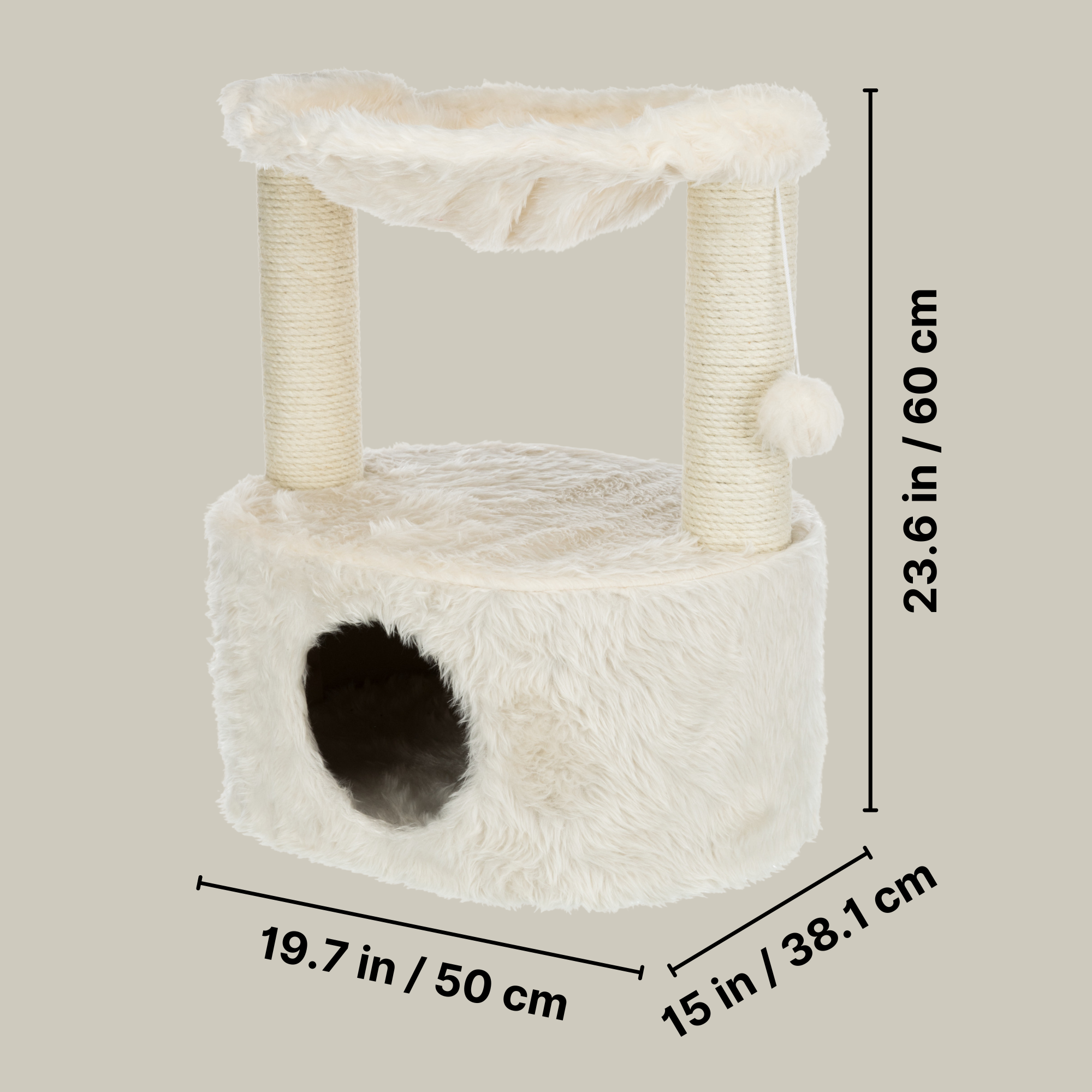 The TRIXIE Baza Grande Cat Tree will provide endless opportunities for cats to play, scratch, or relax. Felines can sharpen their claws on the scratching posts instead of on your furniture or carpet, giving them a healthy outlet for their scratching instincts. All posts are covered in durable sisal. If a nap or place to survey their kingdom is in order, they can curl up in the cozy hammock. It's covered with long-haired plush material and has a metal rim for added support, making it the perfect retreat. Feeling a little spunky? We've also included a dangling pom-pom toy to pique your playful cat's interest. The subtle earth tones of the sisal and plush fabric also make this cat furniture easy to integrate into your home decor—dimensions (Inch): 15 x 19.7 x 23.6.